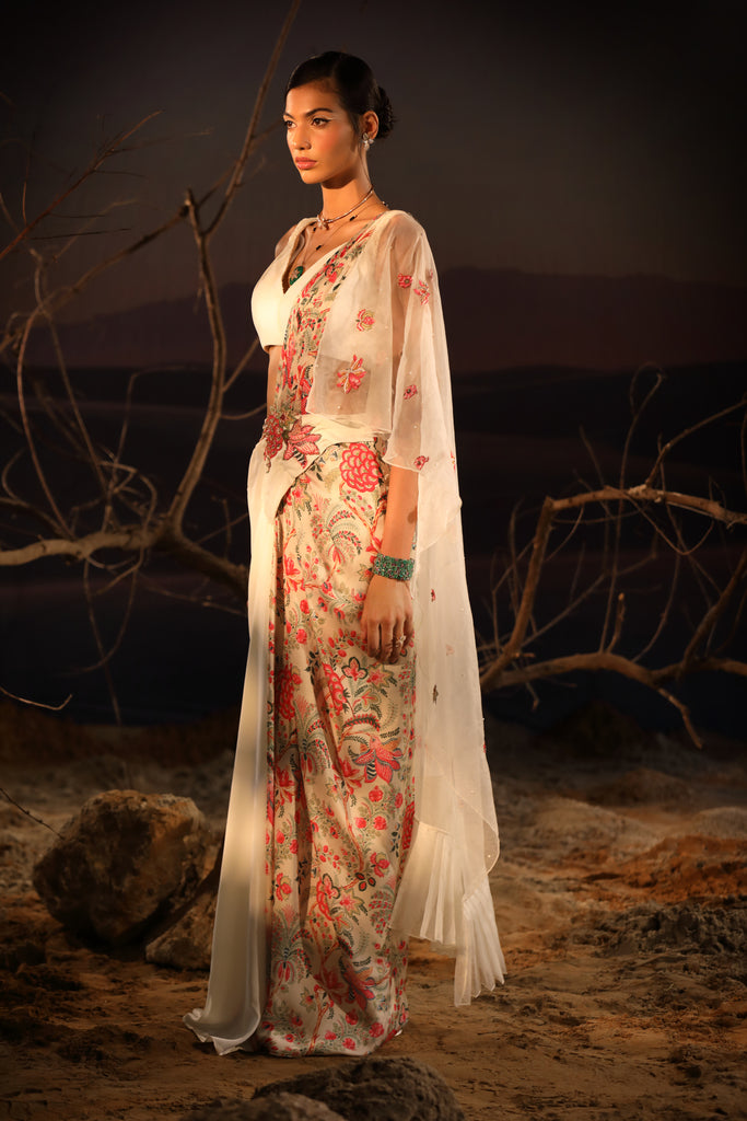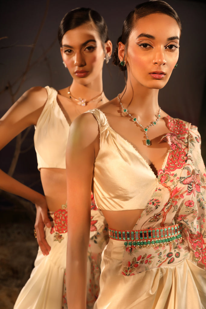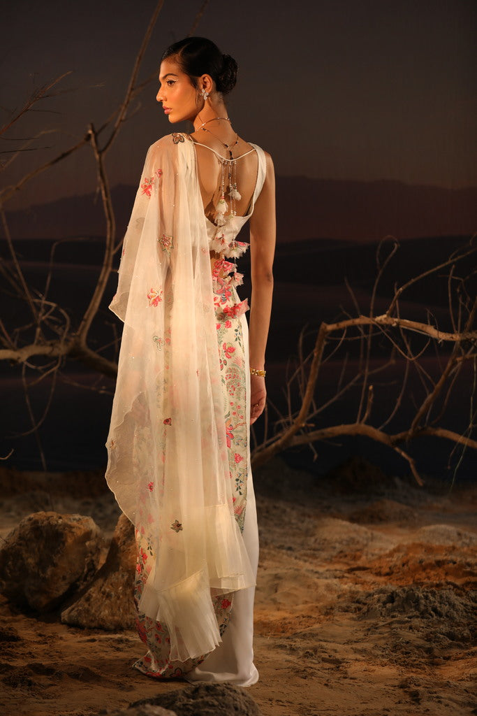 Ivory Georgette Satin Saree feature intricate floral patterns covered in exotic pink flowers and vines embellished with white beads and sequins on the palla and drapes, and a deep plunging V-neckline. Sheer ivory ruffles at the end of the palla.