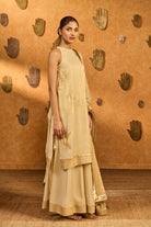 Details: Kurta- Straight kurta adorned with Paper Breeze placement foil print | Halter neckline | Center back opening| Adorned with embroidered borders and gold gota | Embellished with tassles at the side seam | Pinstripes print border backing detail Sharara- Sharara adorned with foil print and embroidered borders | Side Seam Opening | Pinstripes print border backing detail Dupatta- Printed organza crushed dupatta | Embellished with kinari gota and foil printed borders | Pinstripes print boder backing detail