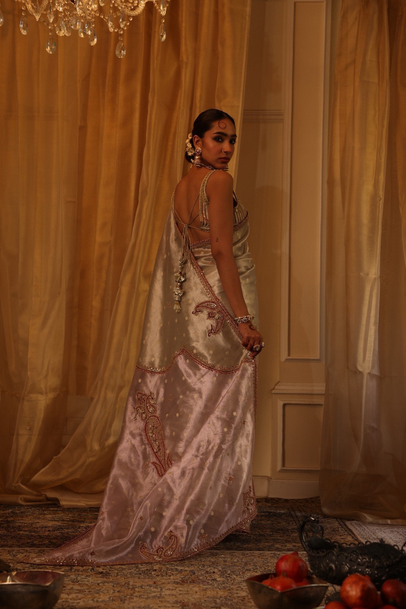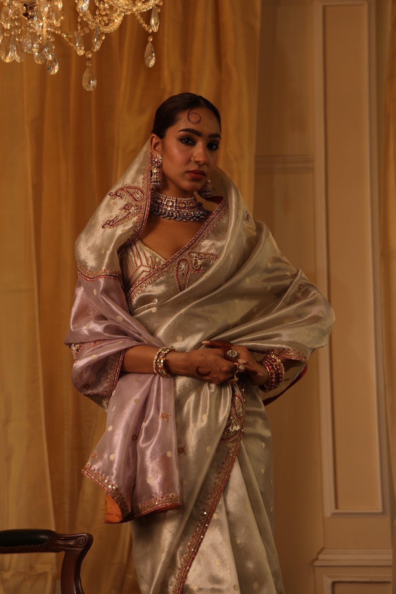 This exquisite 6-yard ivory pure zari tissue saree features woven polka and paisley motifs, with intricate zari, dori, thread, and hand embroidery. The purple panelled palla adds a regal contrast, while the hand-embroidered sleeveless blouse complements the drape. Paired with a lycra satin fish-cut petticoat Fabric: Silk, Zari Tissue |