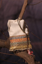 The Ivory Quilted Potli Bag has intricate floral details and white latkans at the hem. It has a gold ring handle with a hassle free magnetic clasp fastening and floral tassels flowing gracefully down it's hem.