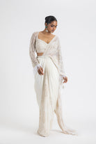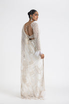 Ivory Satin Draped Saree With A Long-Sleeved Net Blouse And Pleats And Pallu Embroidered In Ivory Dori With Pearls, Beadwork, And Crystals, With Feathers On The Edges.