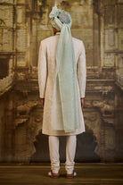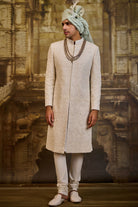 Ivory Embroidered Raw Silk Sherwani Embroidered All Over With Resham Cutdana And Beadwork With Cotton Silk Kurta And Churidar. It Comes With Optional Worked Jutis Which Can Be Ordered Seprtately