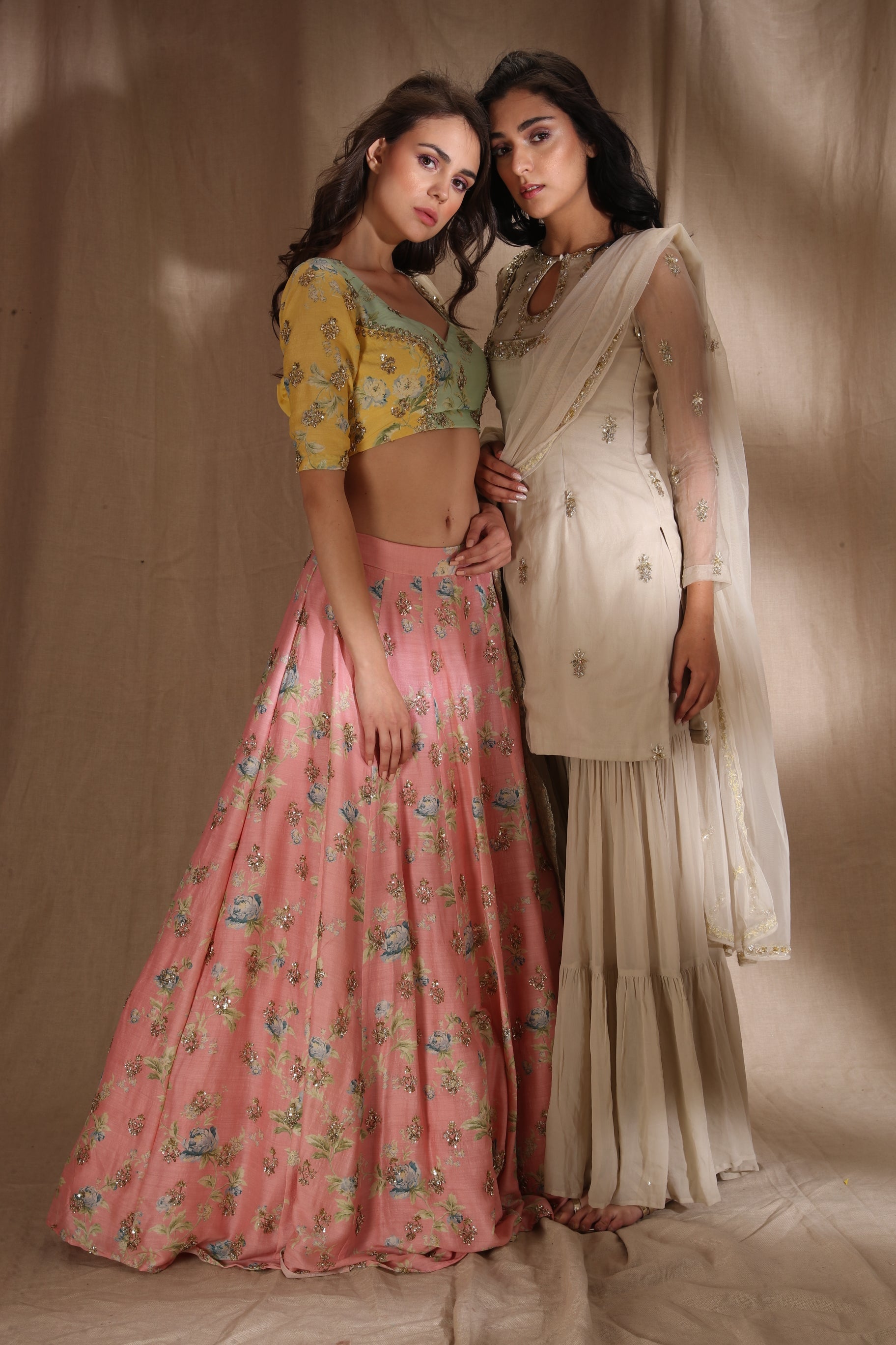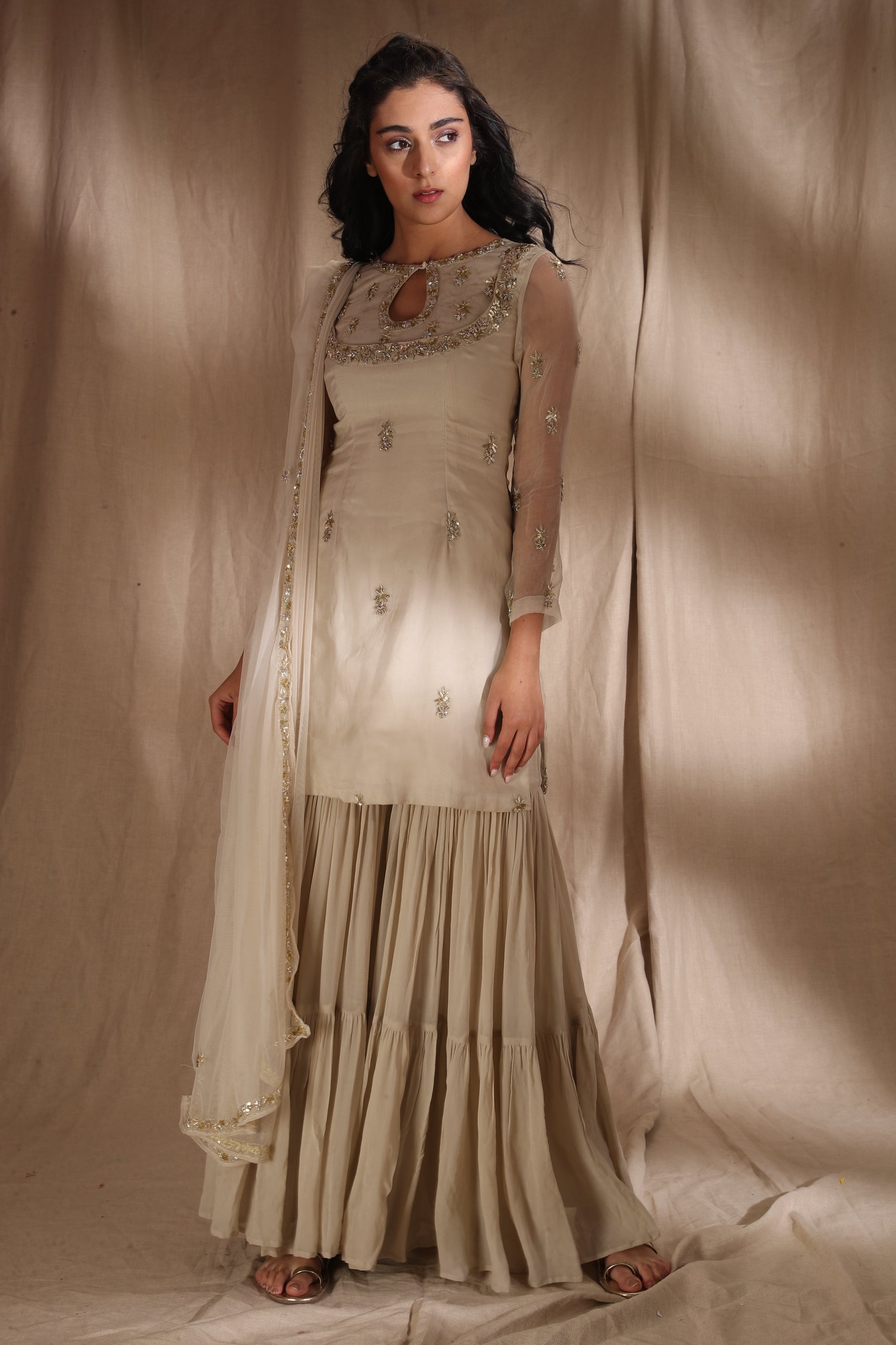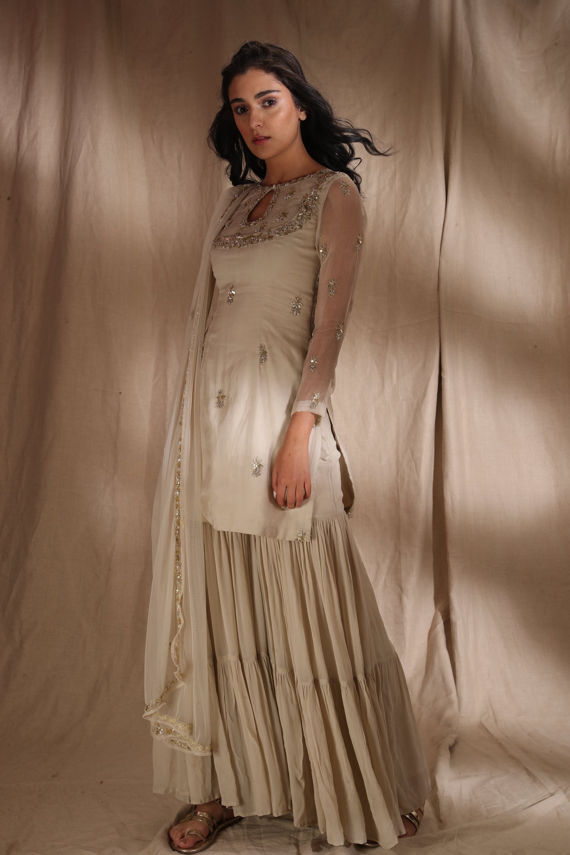 Featuring a IVORY SUIT WITH SHARARA IN organza.