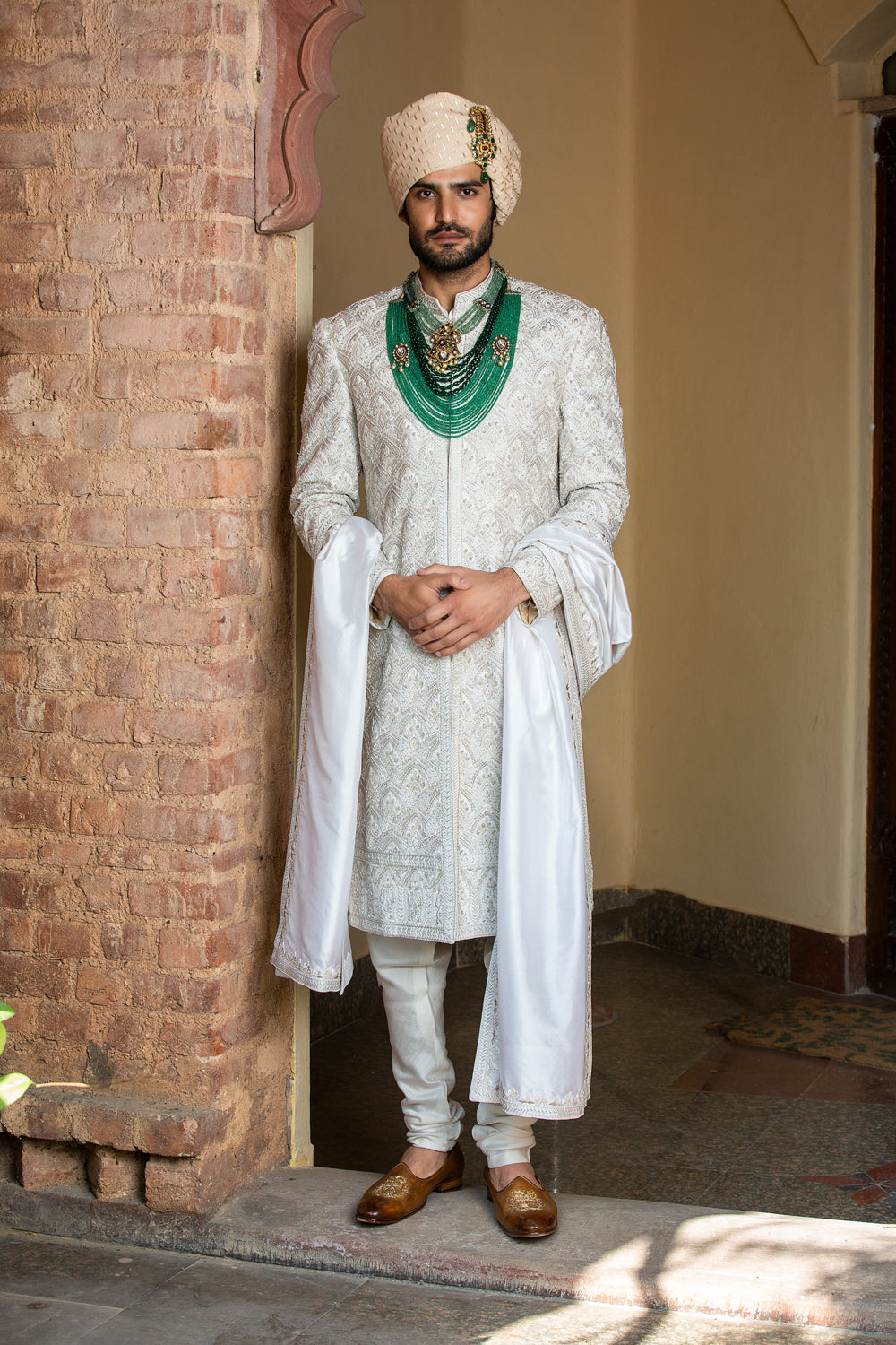 Ivory Taffeta achkan and belt all over embroidered with resham dabka and beadwork with monga kurta and churidar.