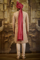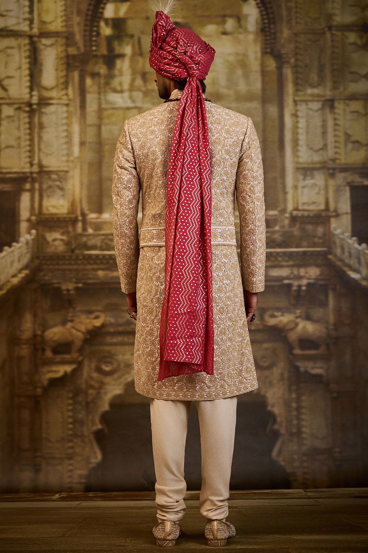 Ivory Taffeta Silk Sherwani All Over Embroidered With Beige Dori, Dabka And Beadwork With Cotton Silk Kurta And Churidar. It Is Accesorised With An Optional Worked Stole, Belt And Worked Jutis Which Can Be Ordered Seprtately