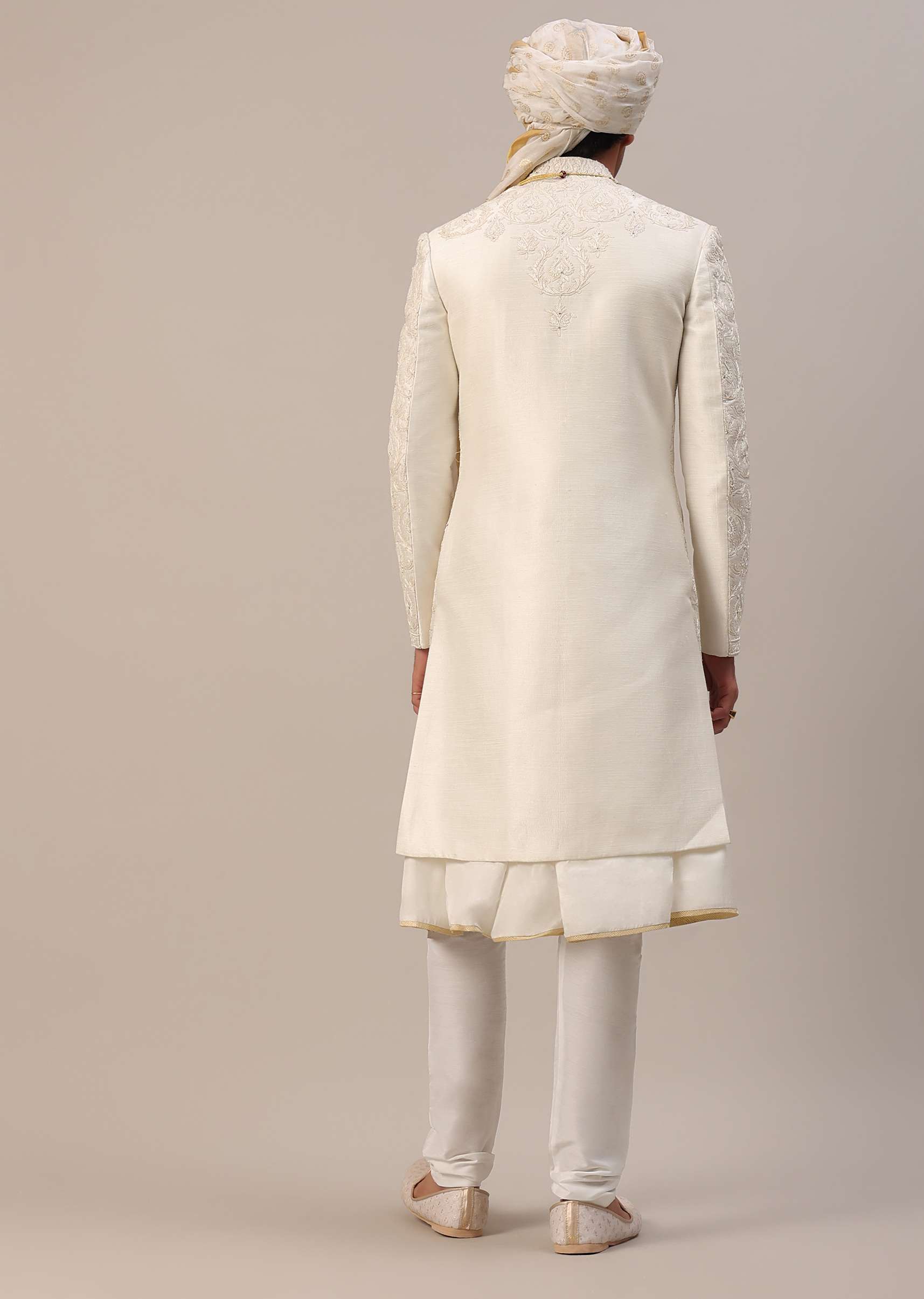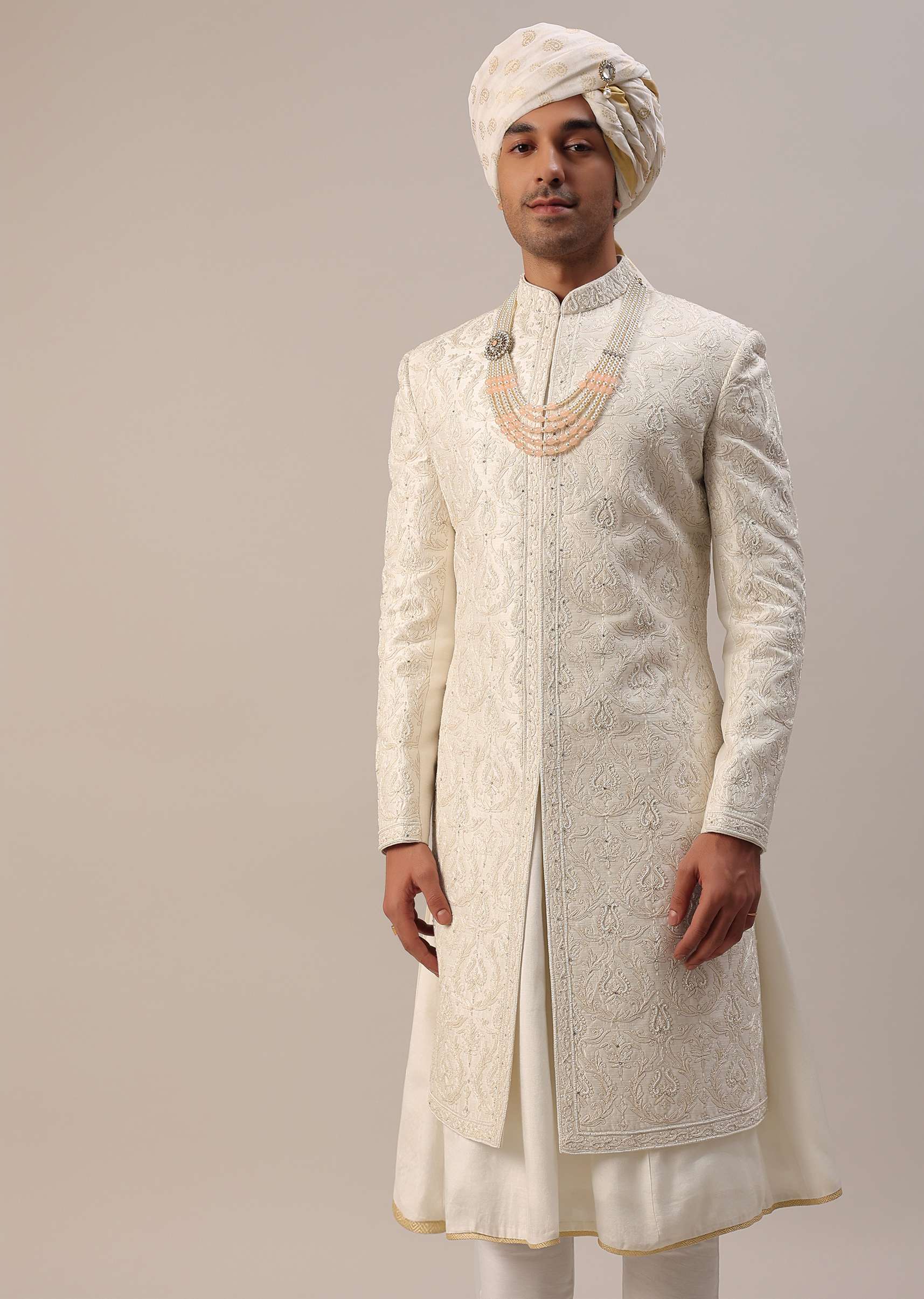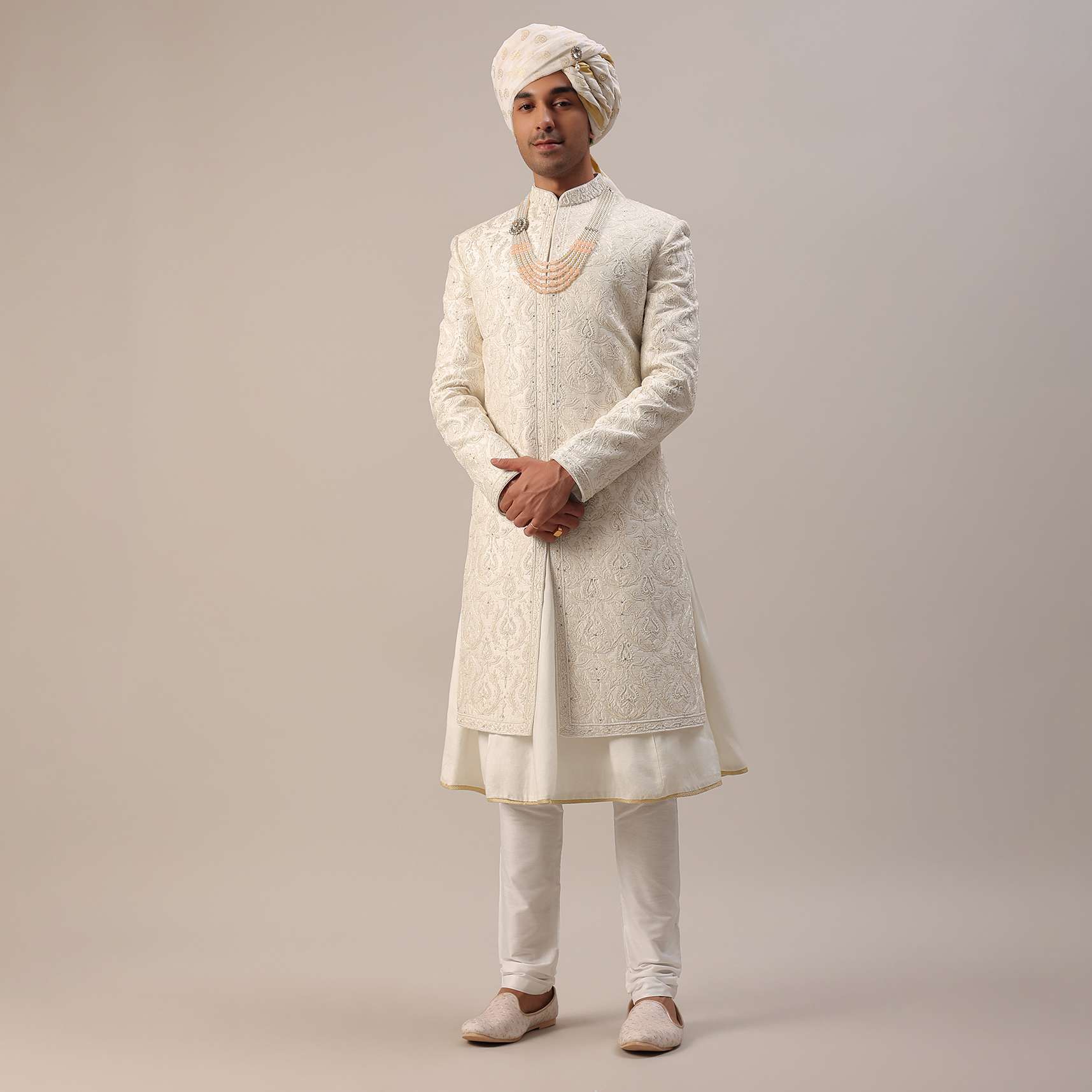 - Introducing our sophisticated ivory white sherwani in silk, a masterpiece of elegance and intricate craftsmanship.