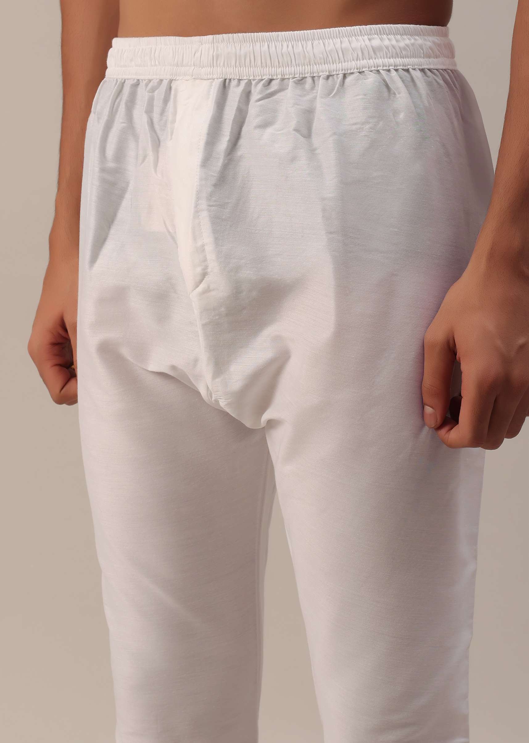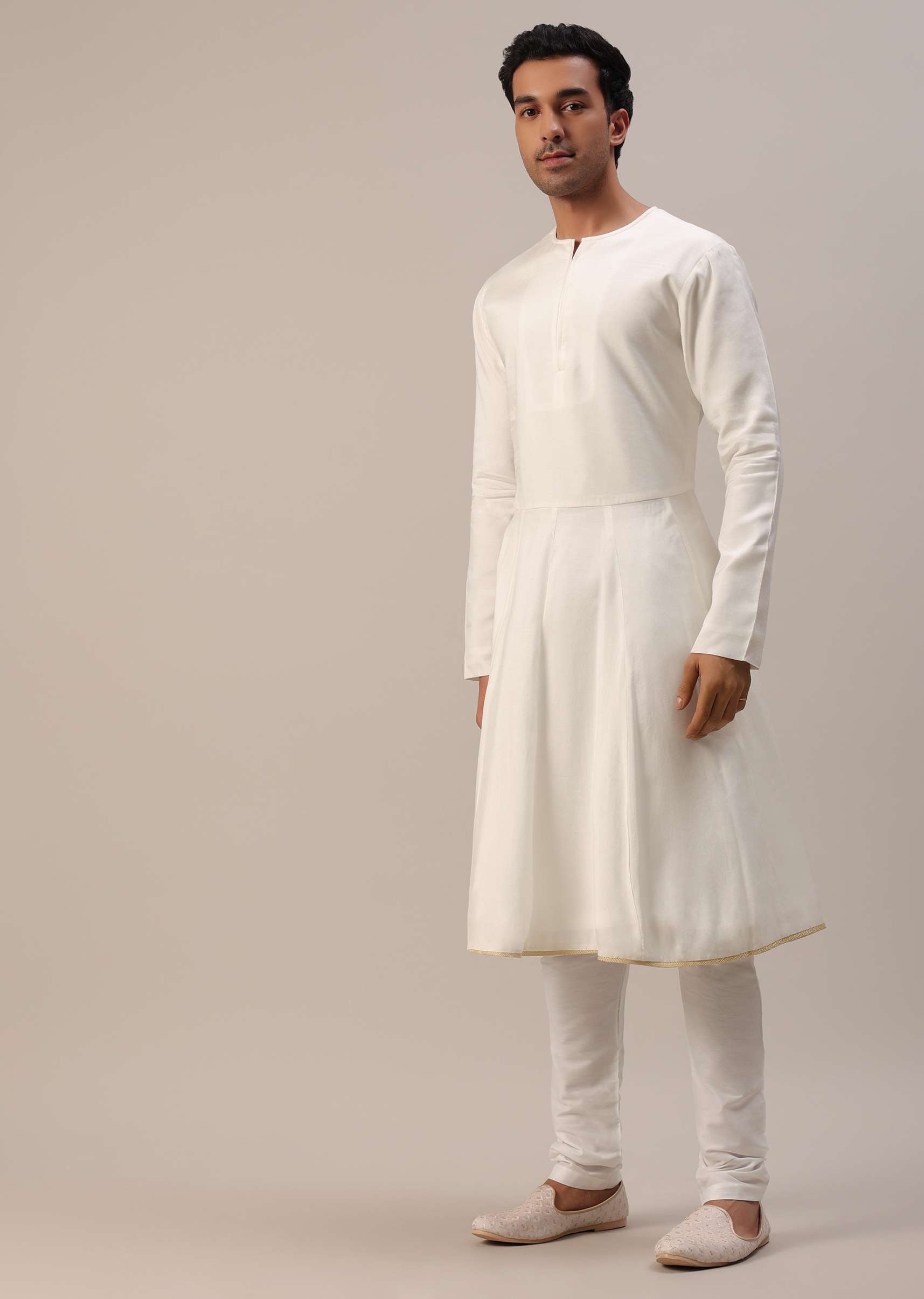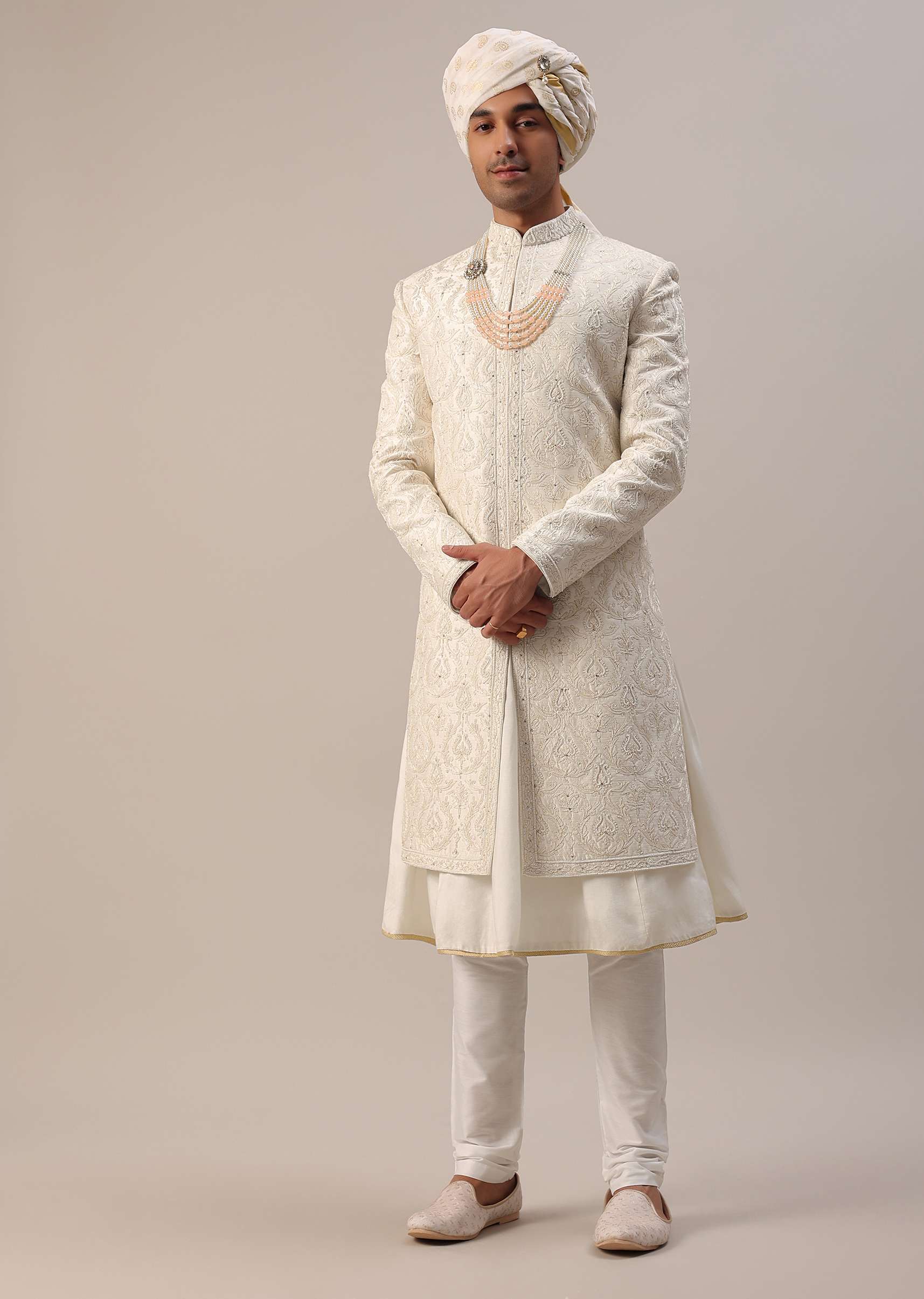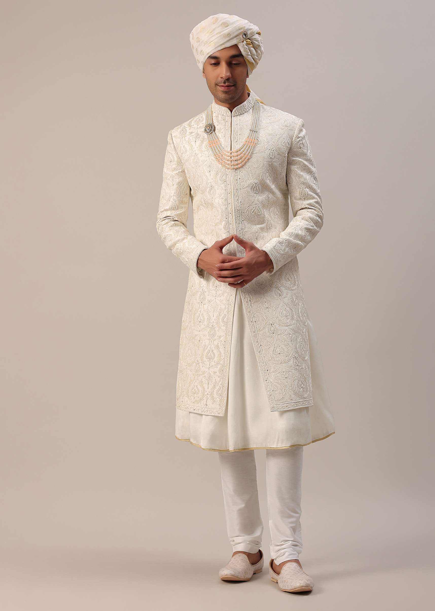 - Introducing our sophisticated ivory white sherwani in silk, a masterpiece of elegance and intricate craftsmanship.