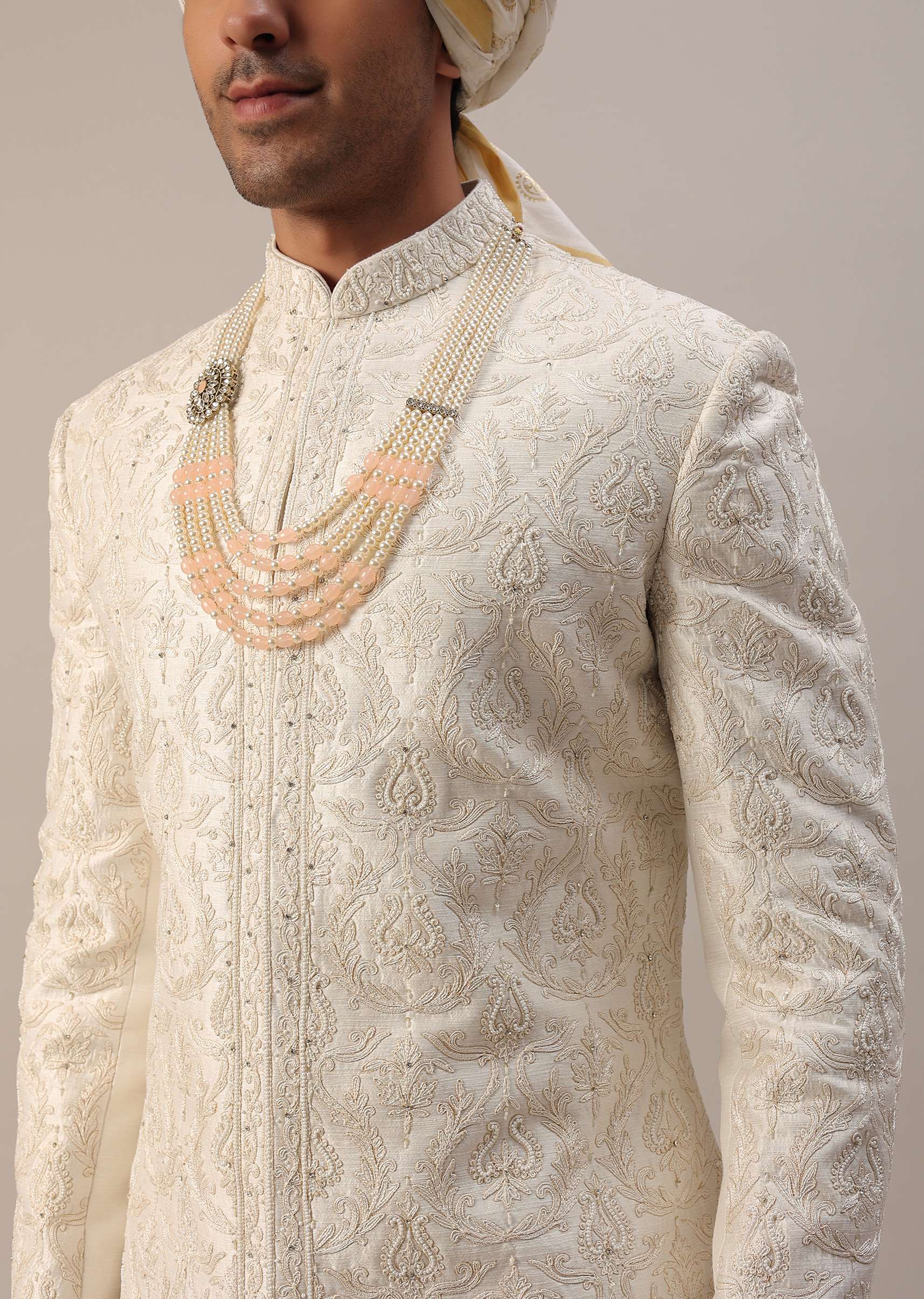 Ivory White Machine Embroidered Sherwani Set In Silk