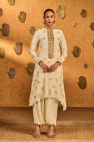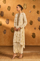Details: Kurta - All-over Windrose print | Round neckline with a beautifully crafted embroidered yoke border Dhoti Pants – Beautifully draped in luxurious crepe silk, offering a loose-fitted and comfortable silhouette for effortless elegance