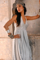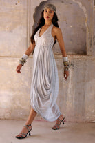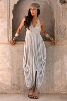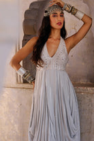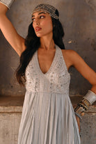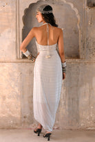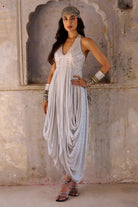 Sequin and glassbeads embroidered bodice with georgette cowl.