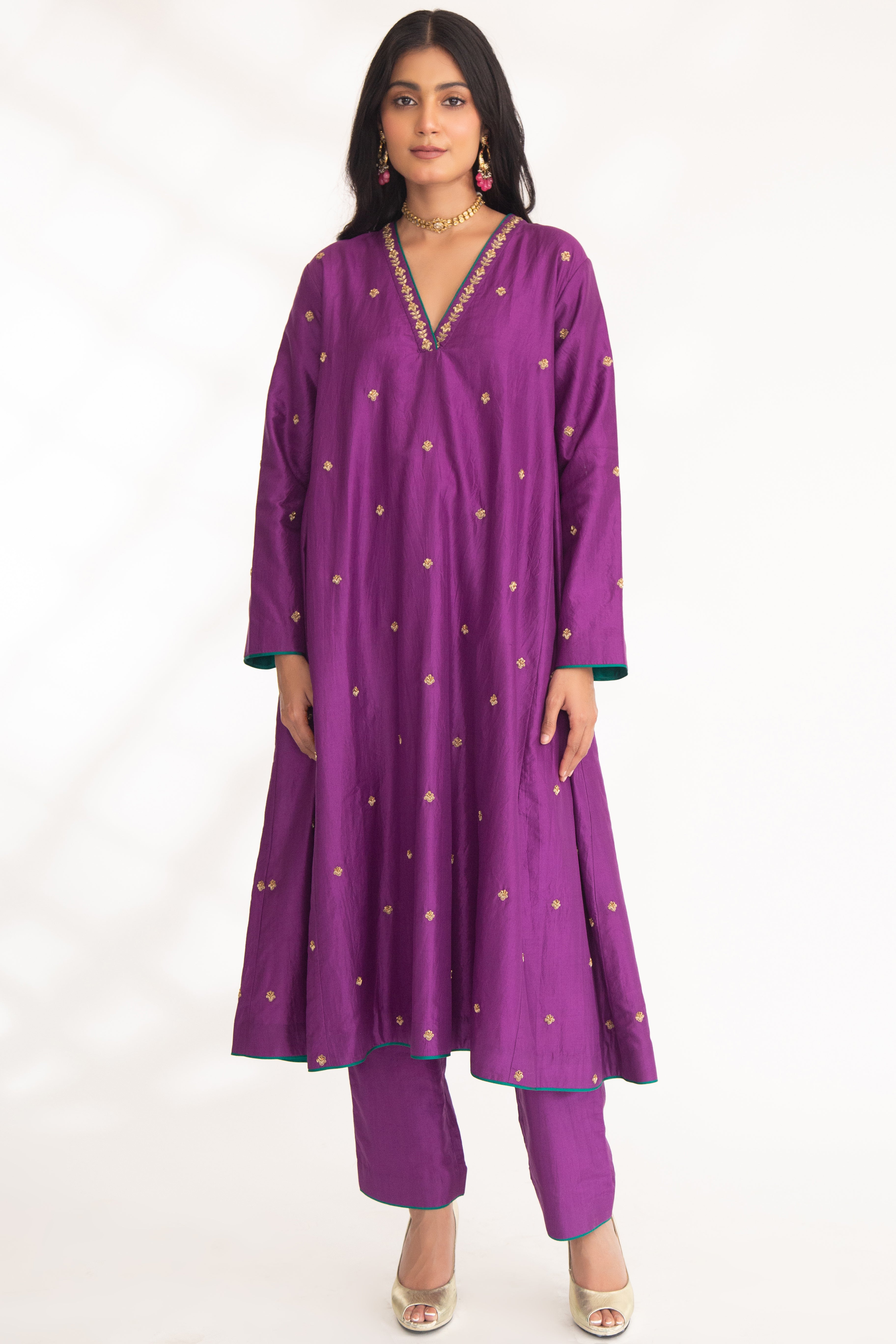 A purple kurta set, elegantly paired with straight pants, is elevated with intricate antique gold zardozi embroidery and adorned with contrast piping.
