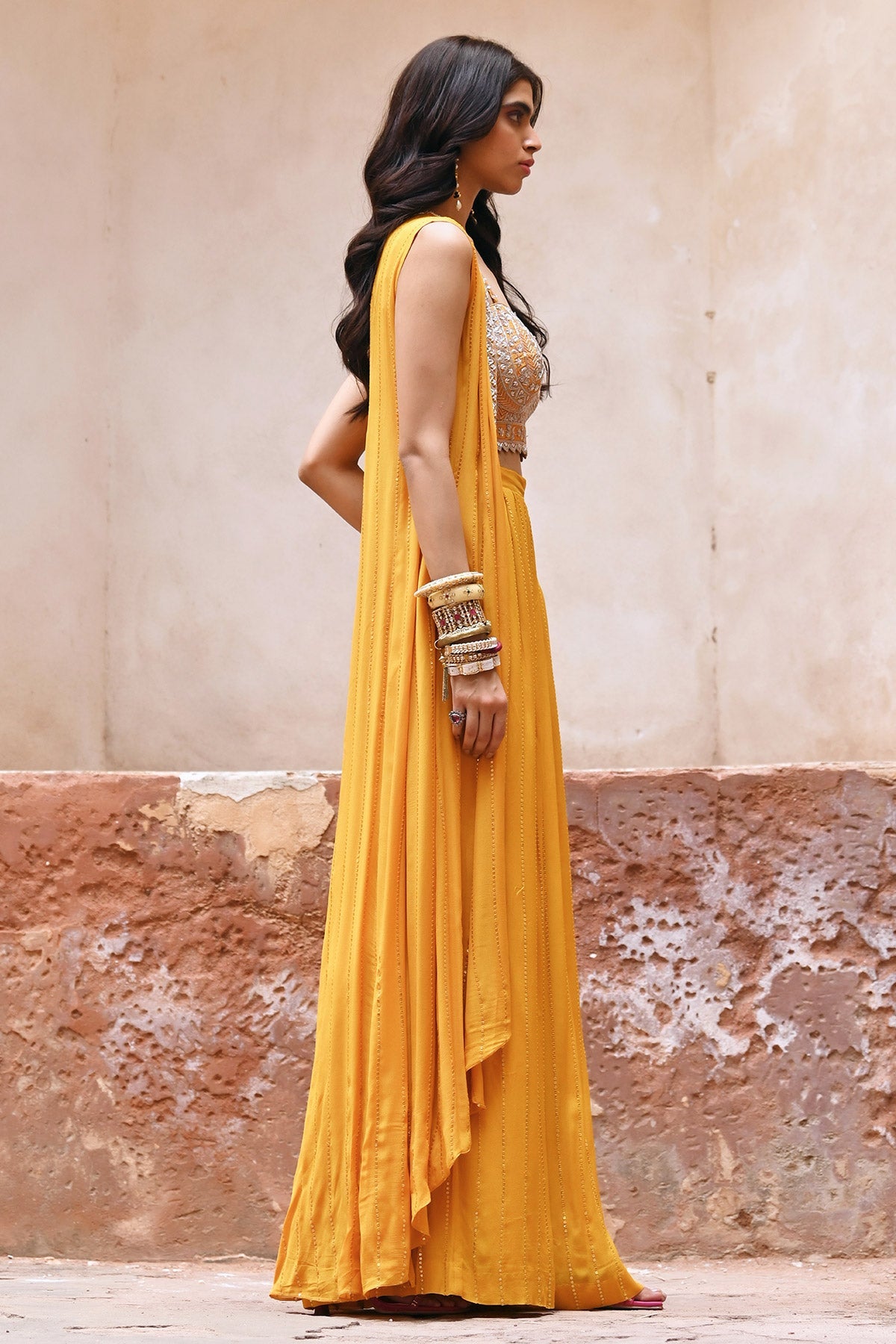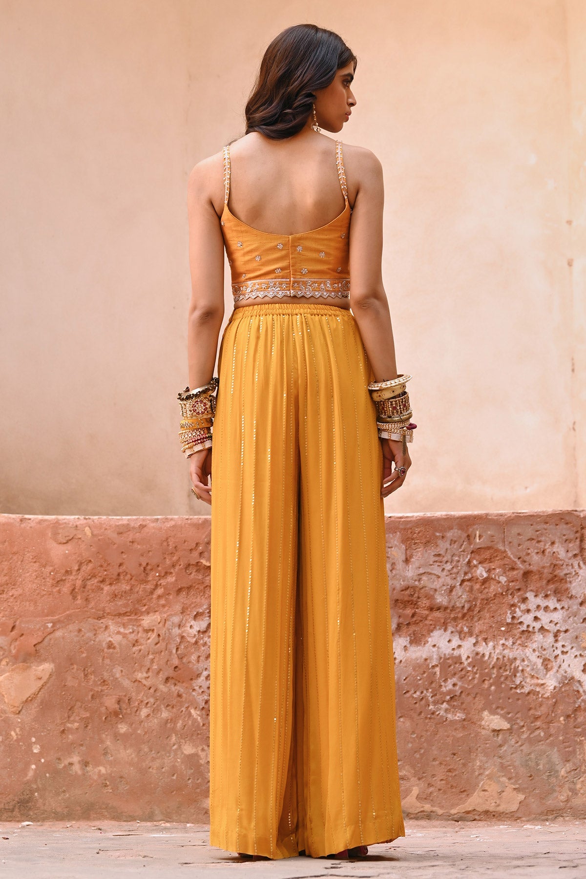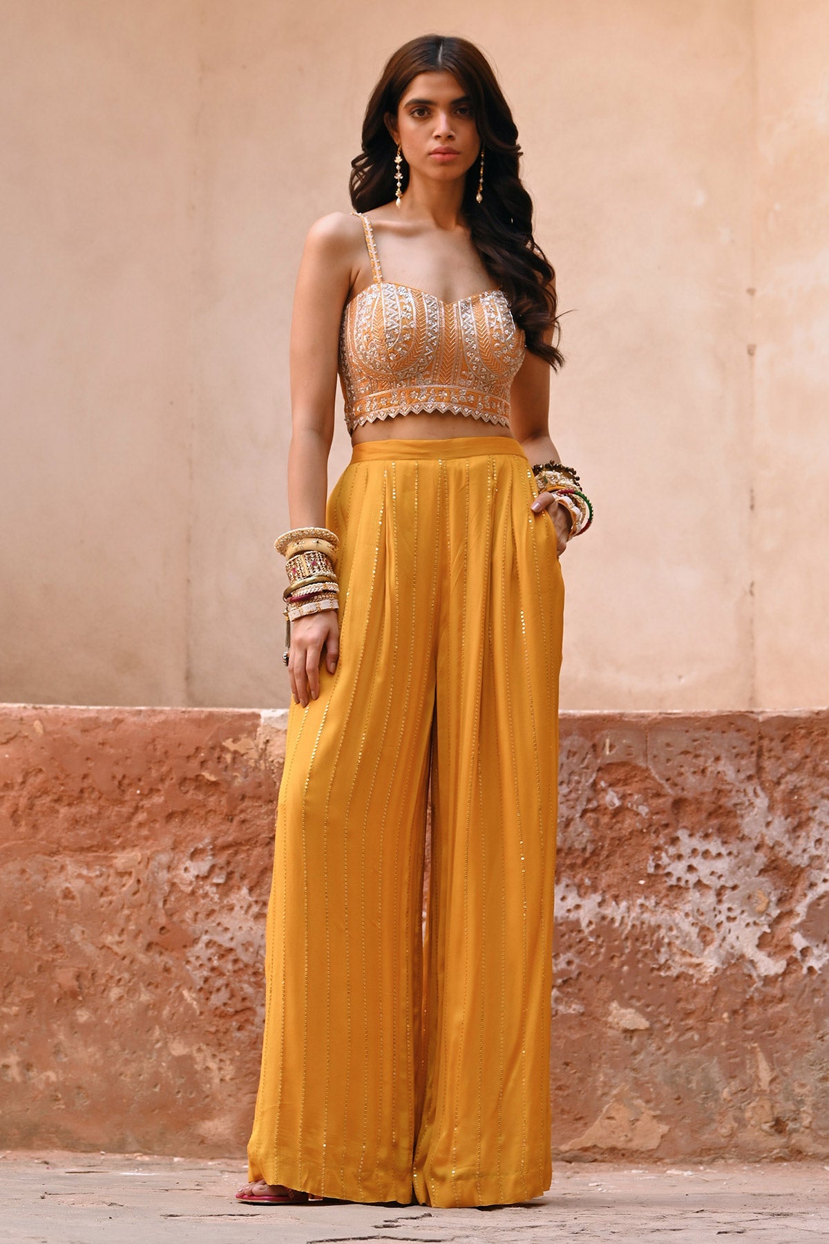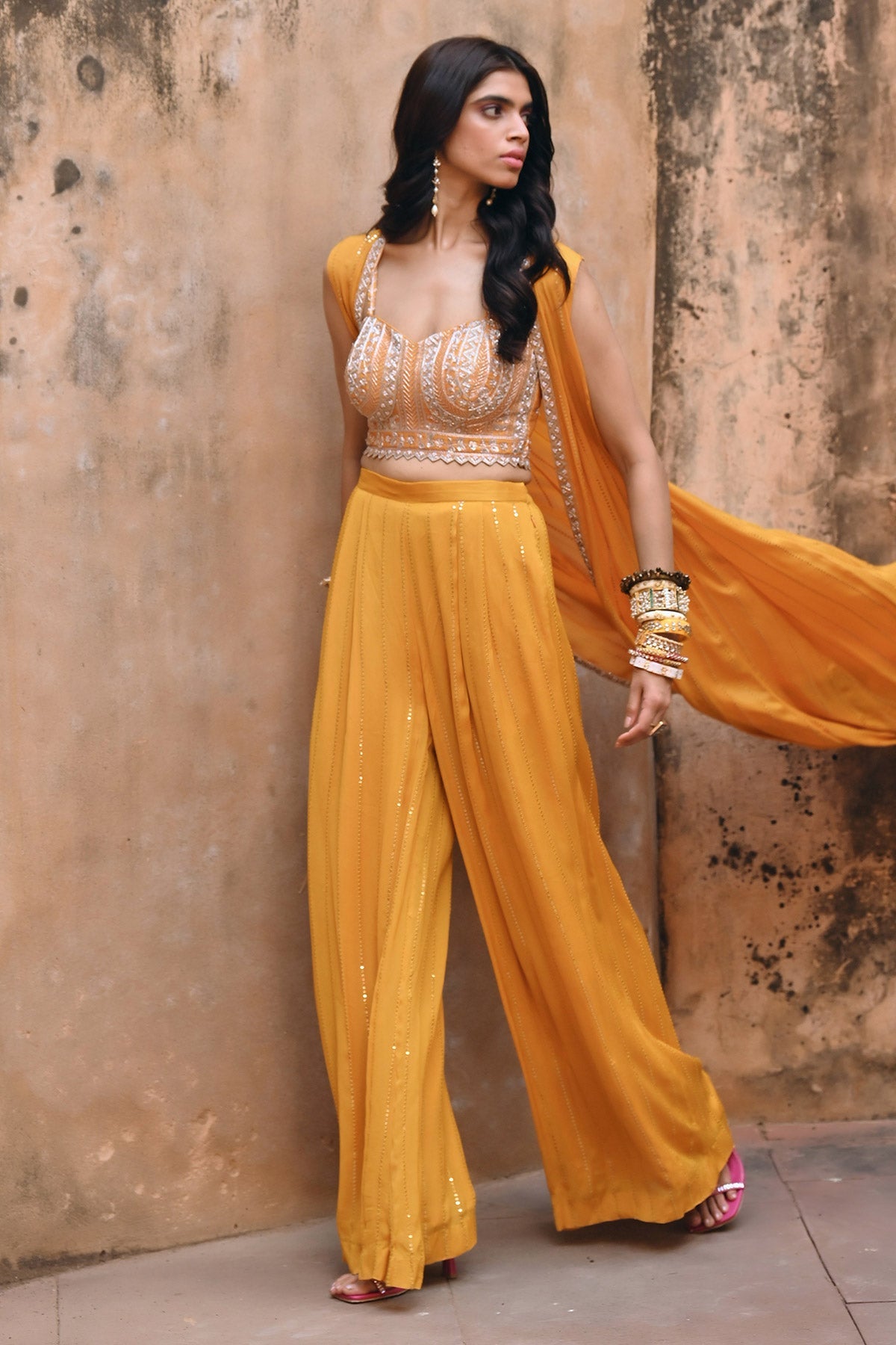 Glass bead, pearl, and zardozi blouse paired with georgette pants and jacket.