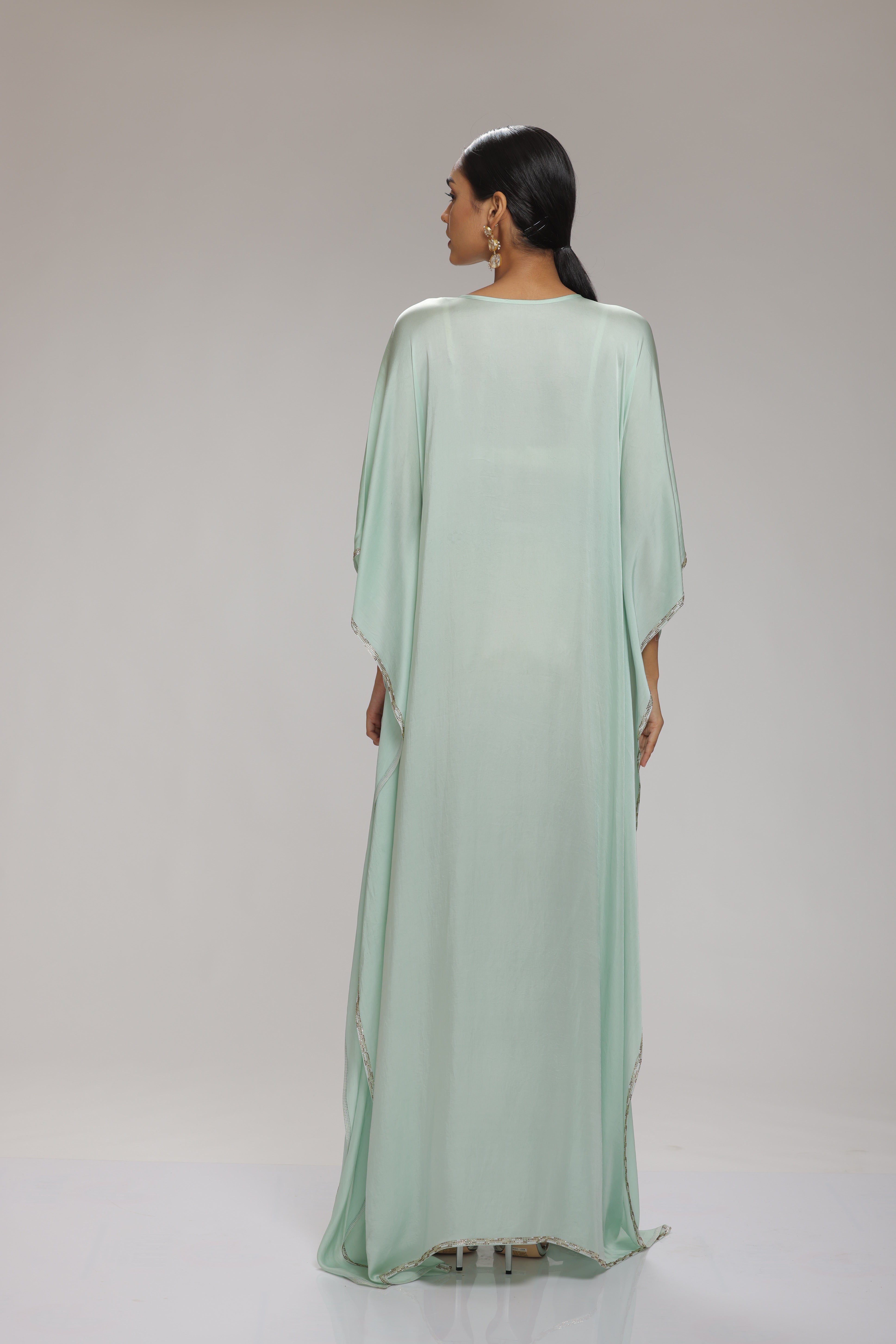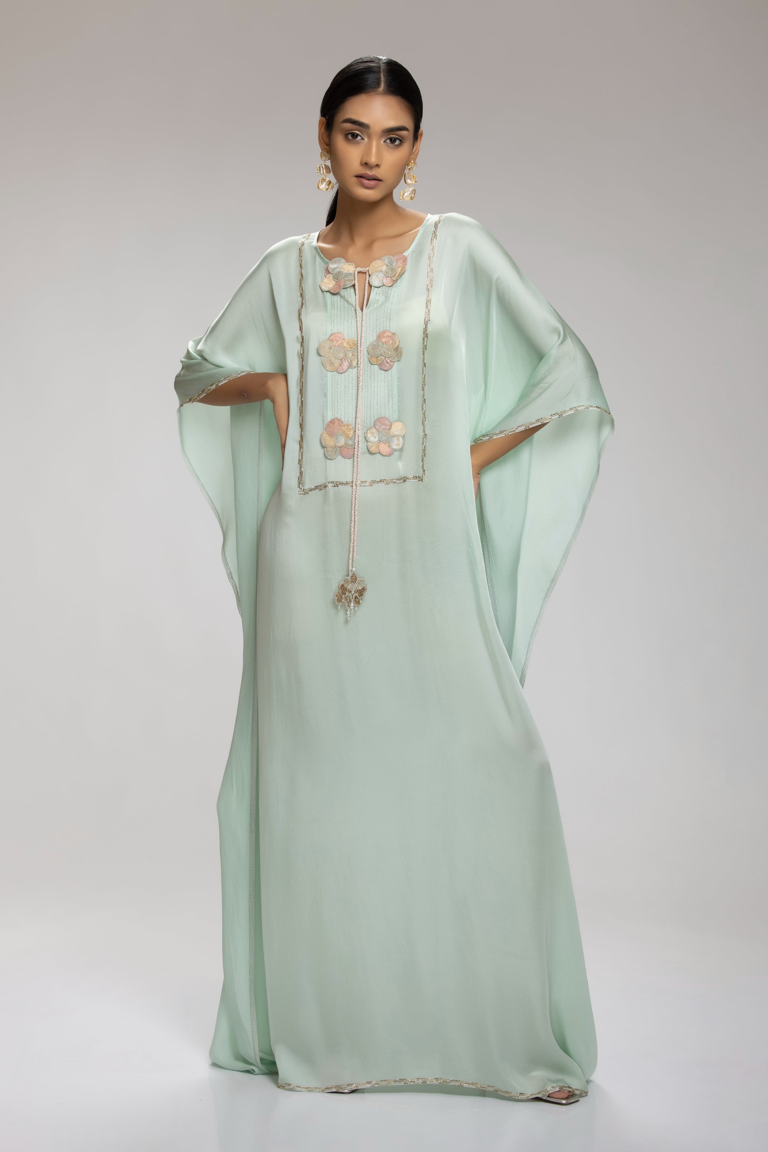 Super luxe and breezy mint chamoise satin kaftan, adorned with rhinestones along the hem and intricate Brocade applique details on the neckline. Handmade tassels and drawstring add a touch of artistry, creating a unique charm.