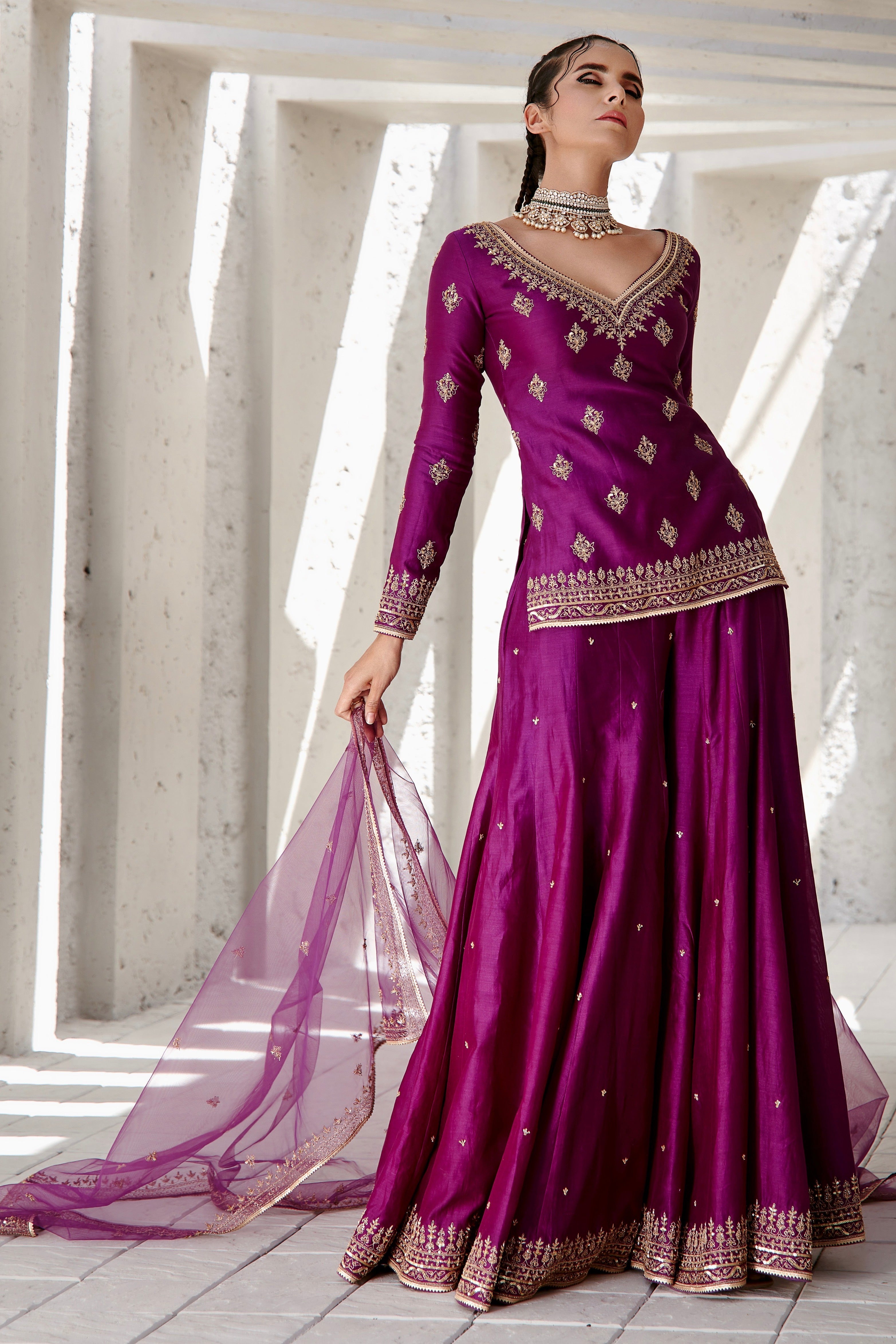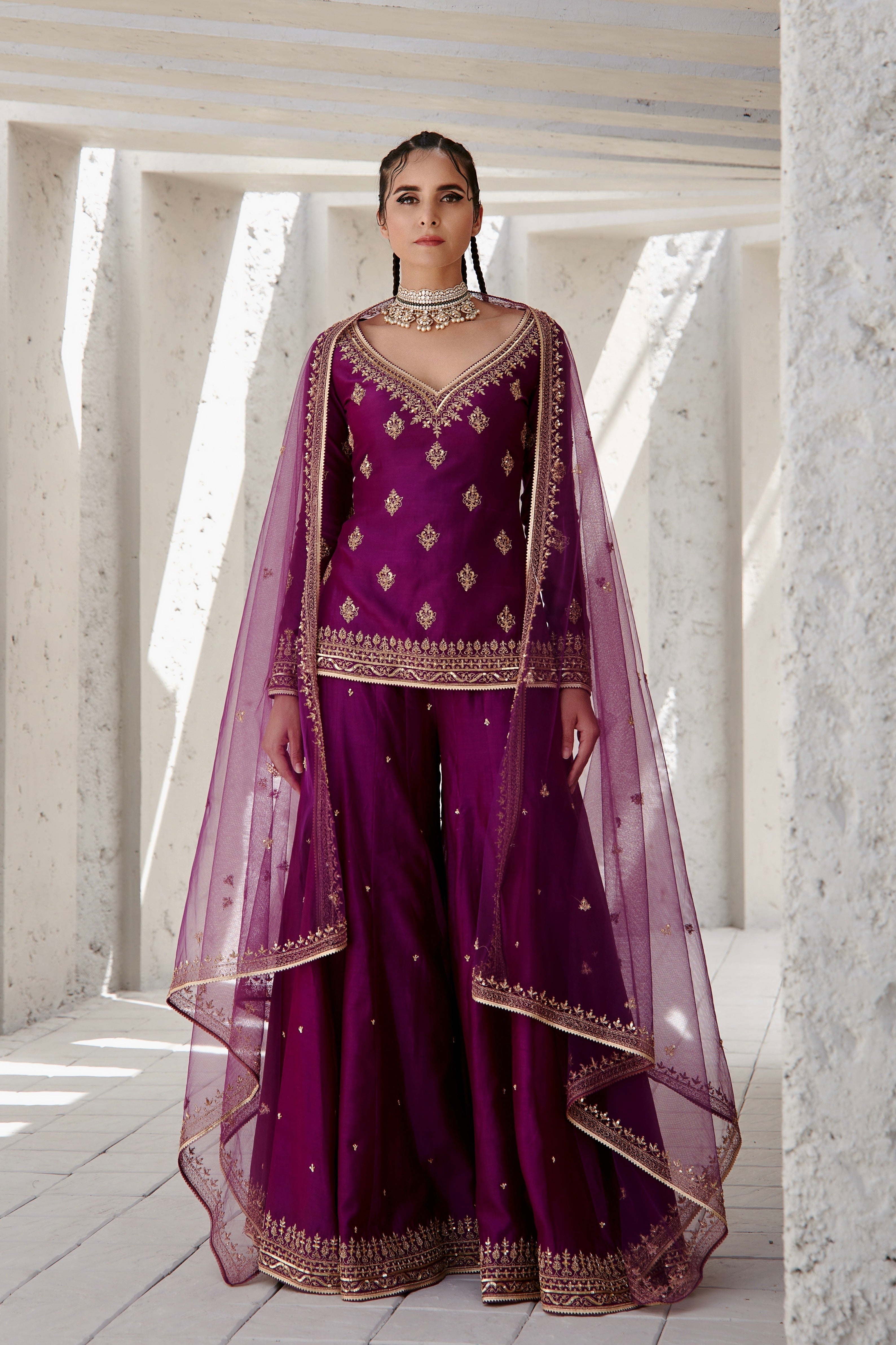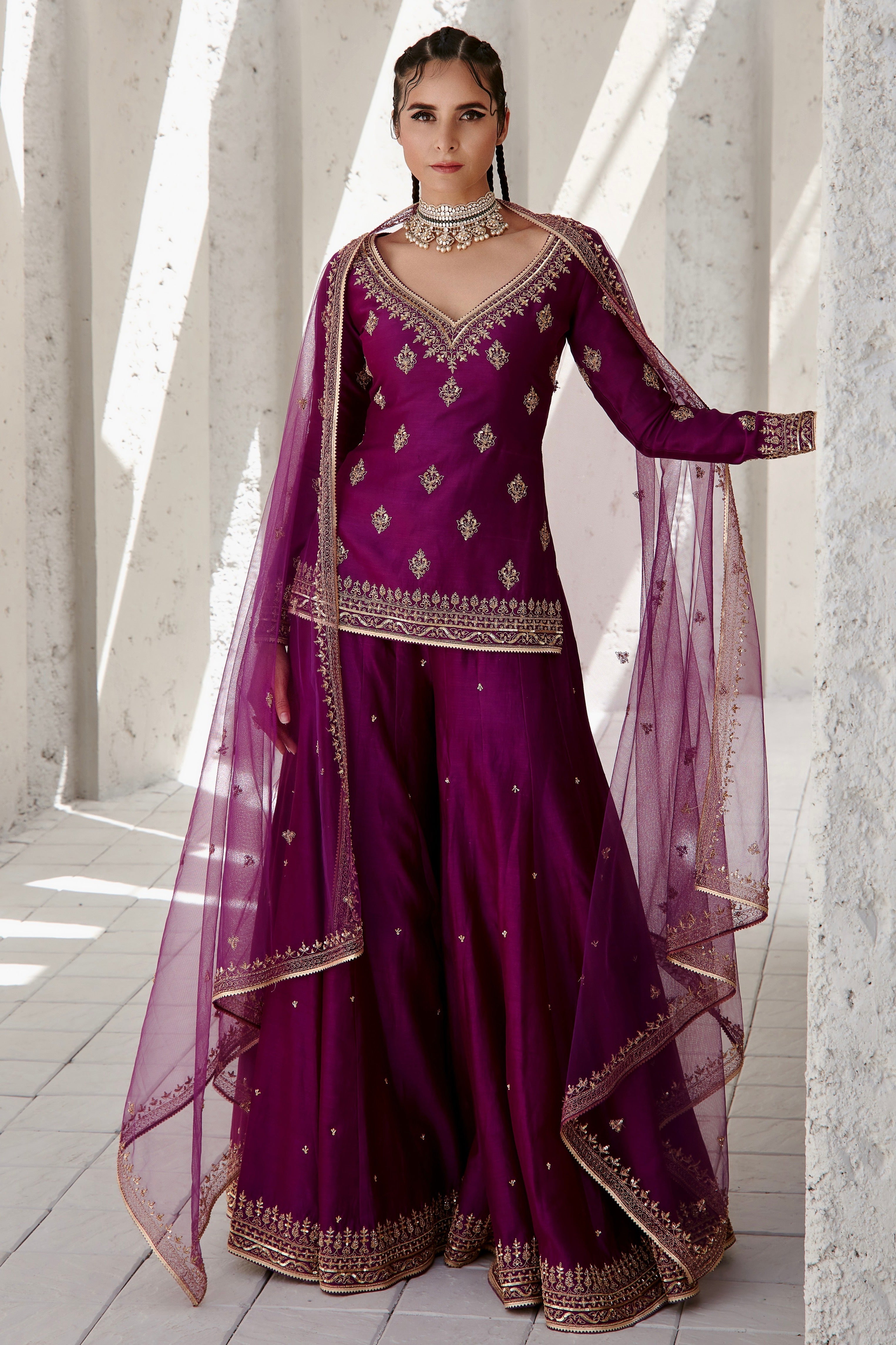 Featuring a purple Chanderi kurta sharara set paired with an organza dupatta with gold dori and aari embroidery