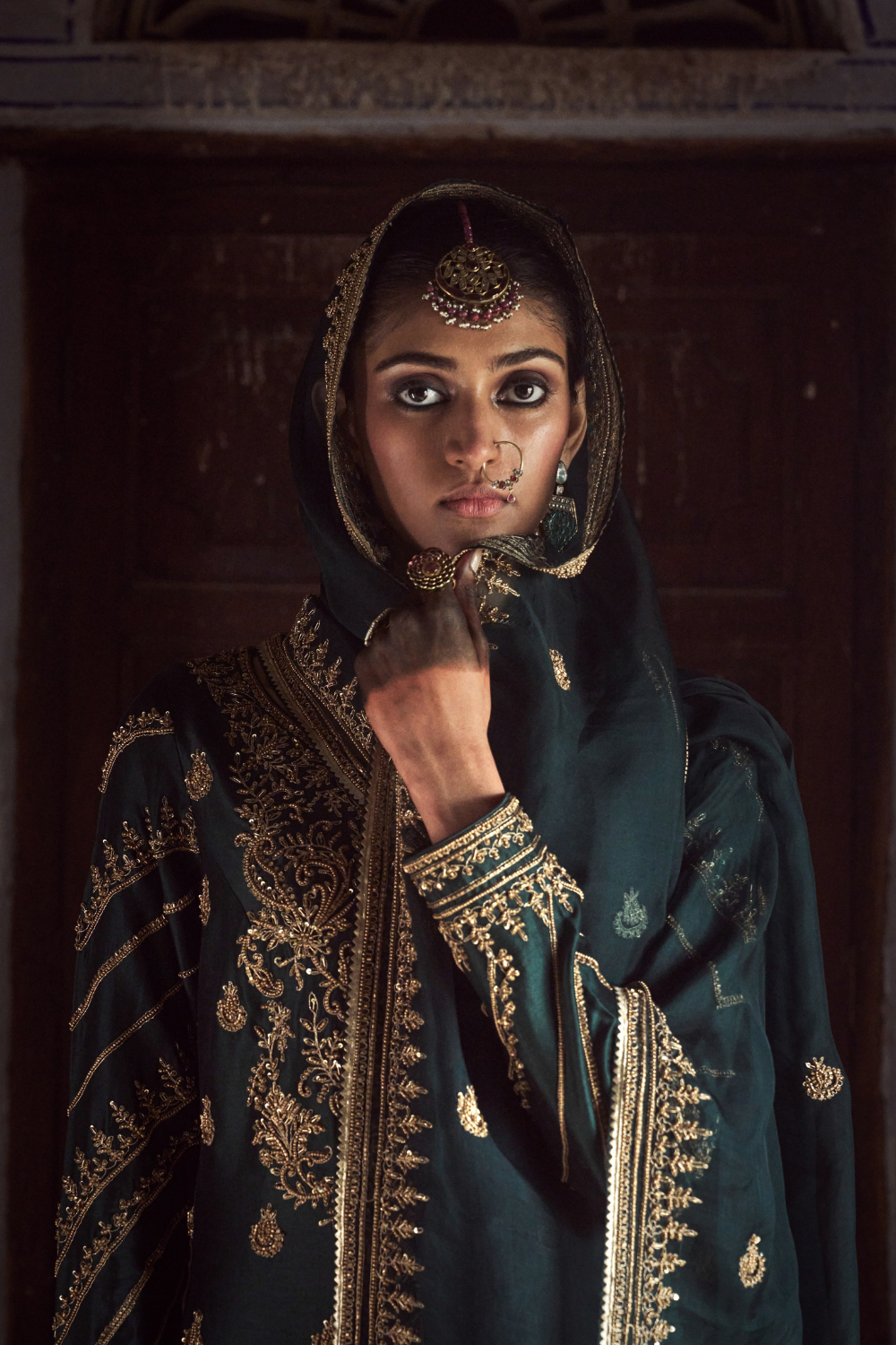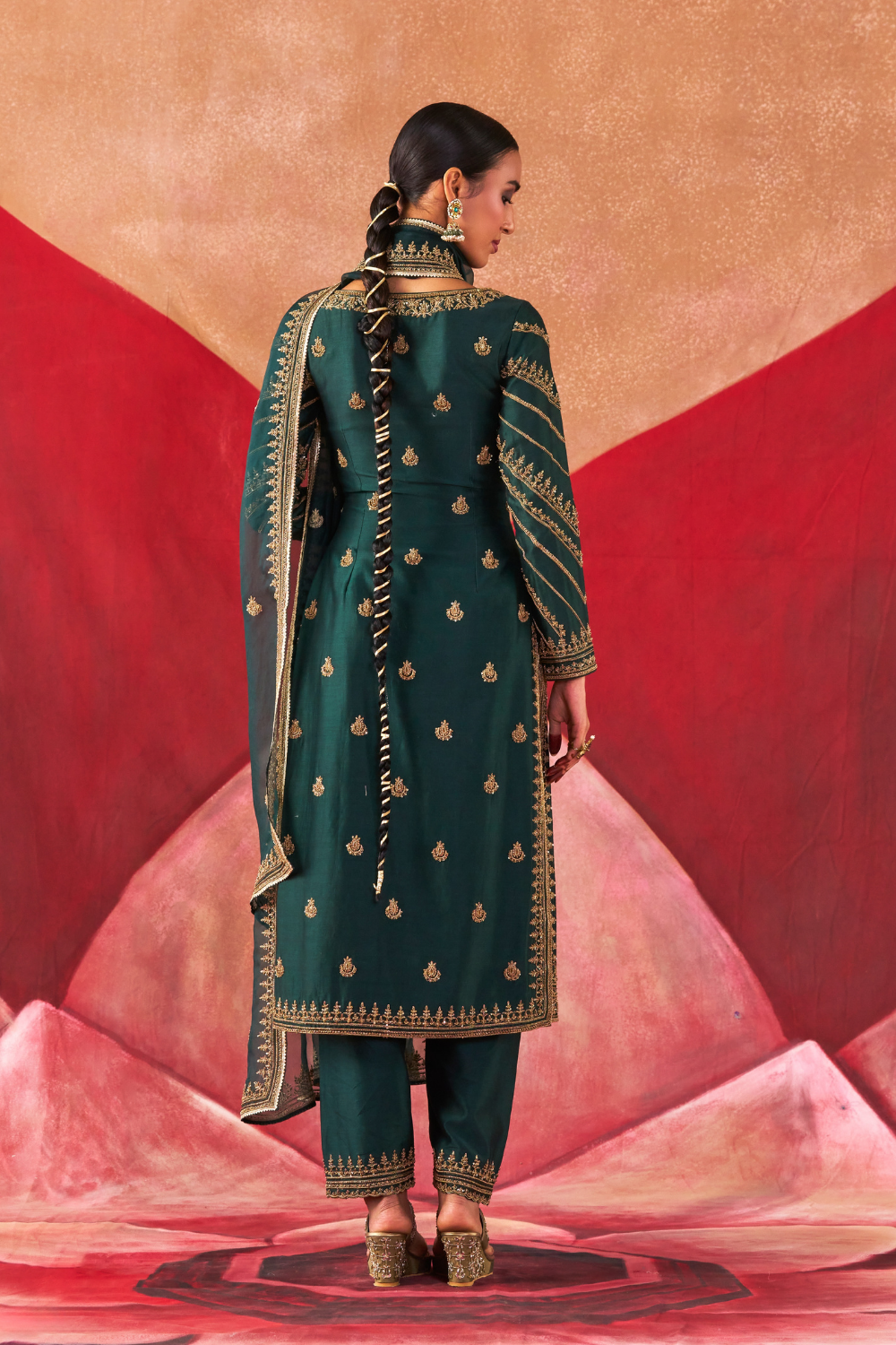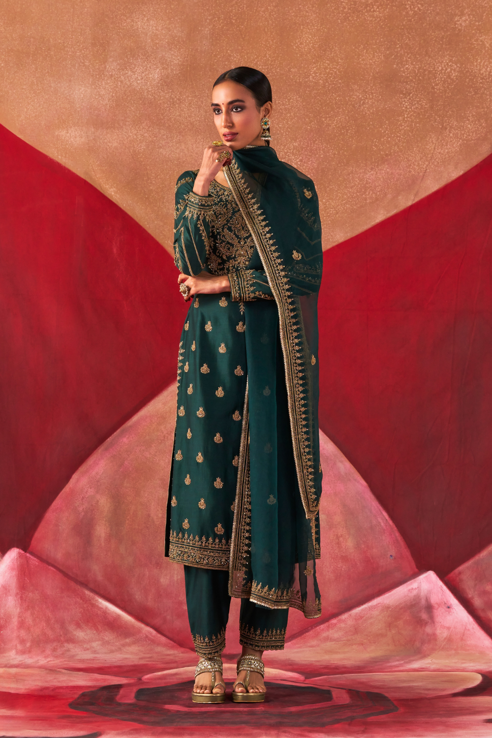 Featuring a bottle-greeen chanderi silk kurta set paired with an organza base dupatta with antique gold dori and embellished hand embroidery.