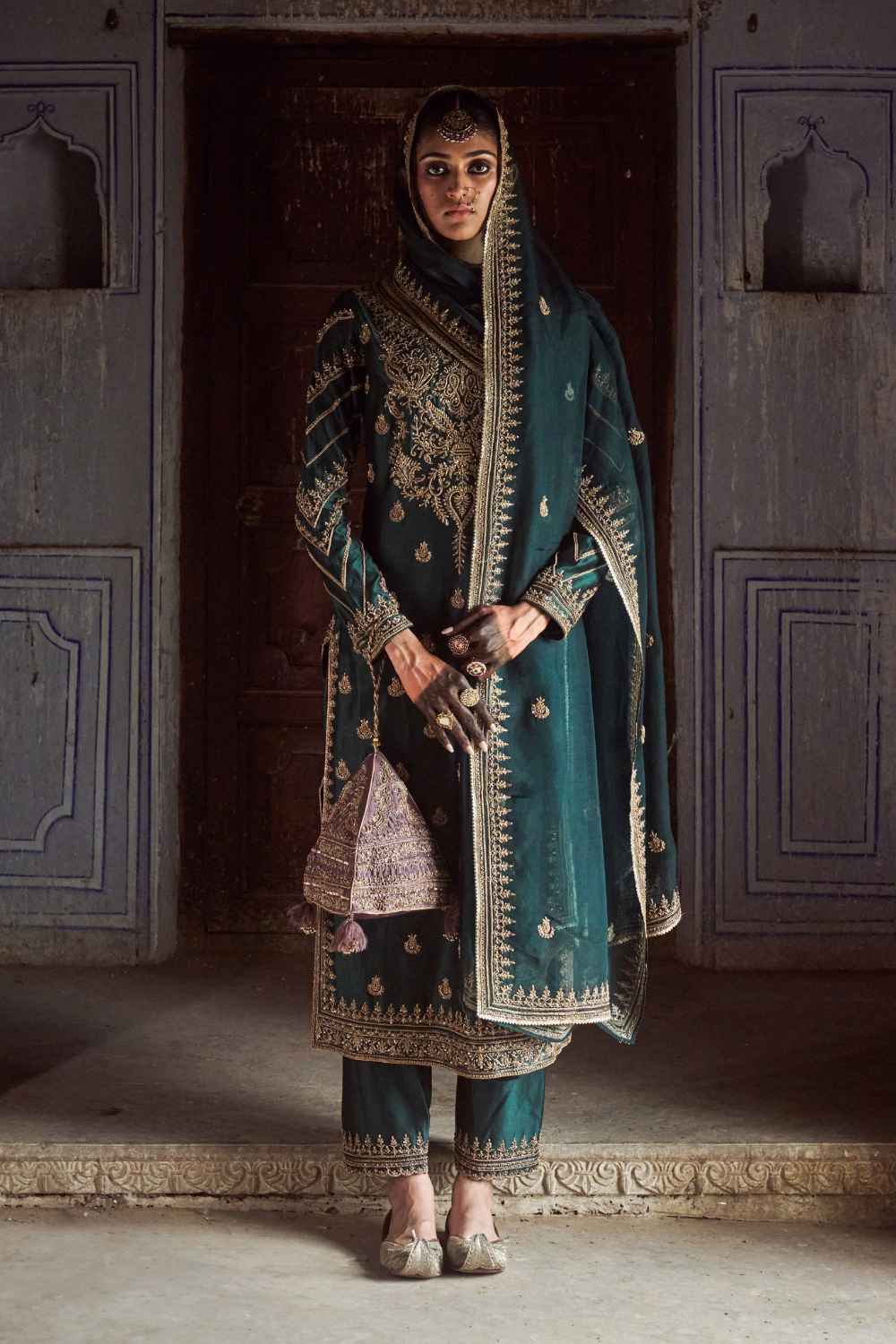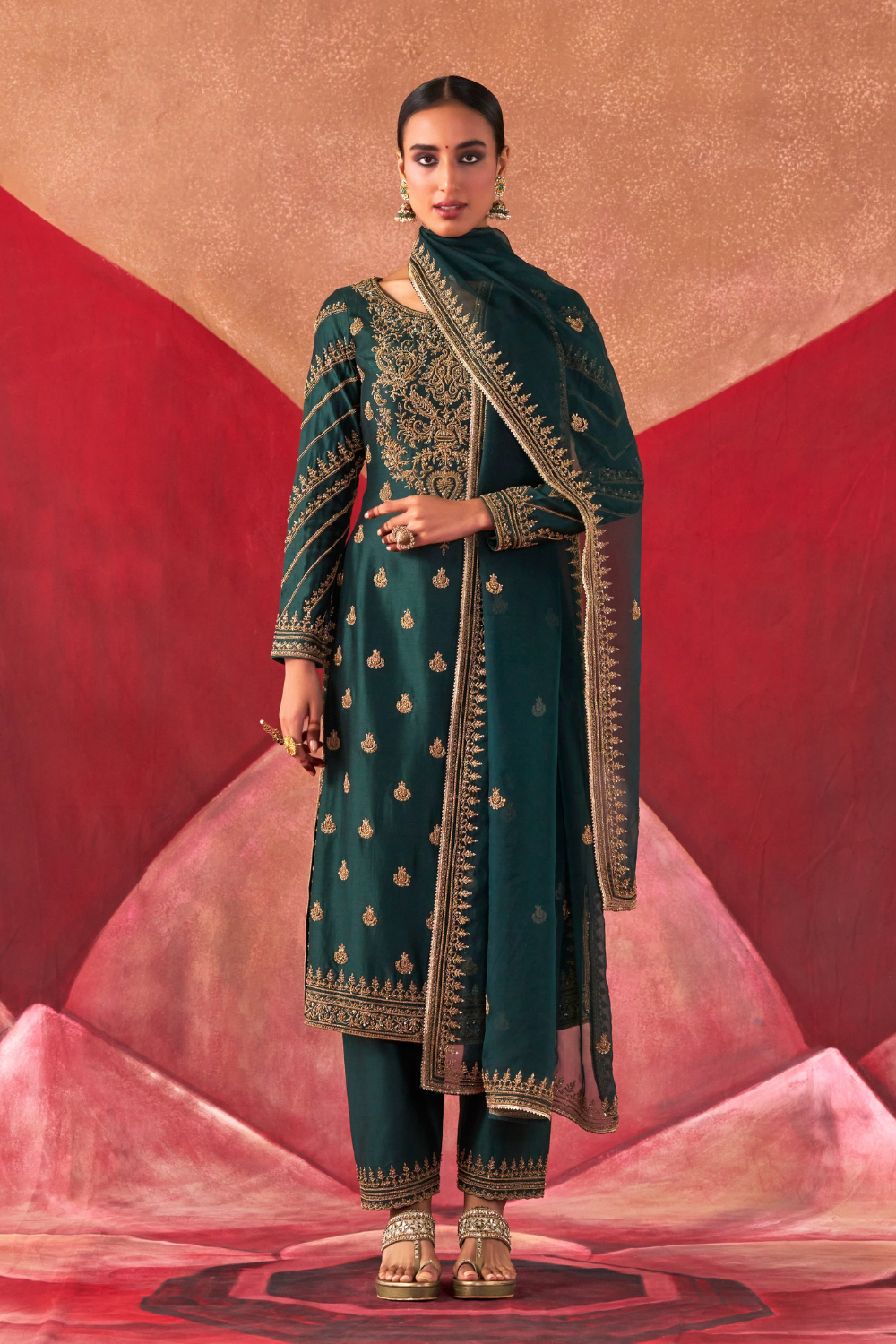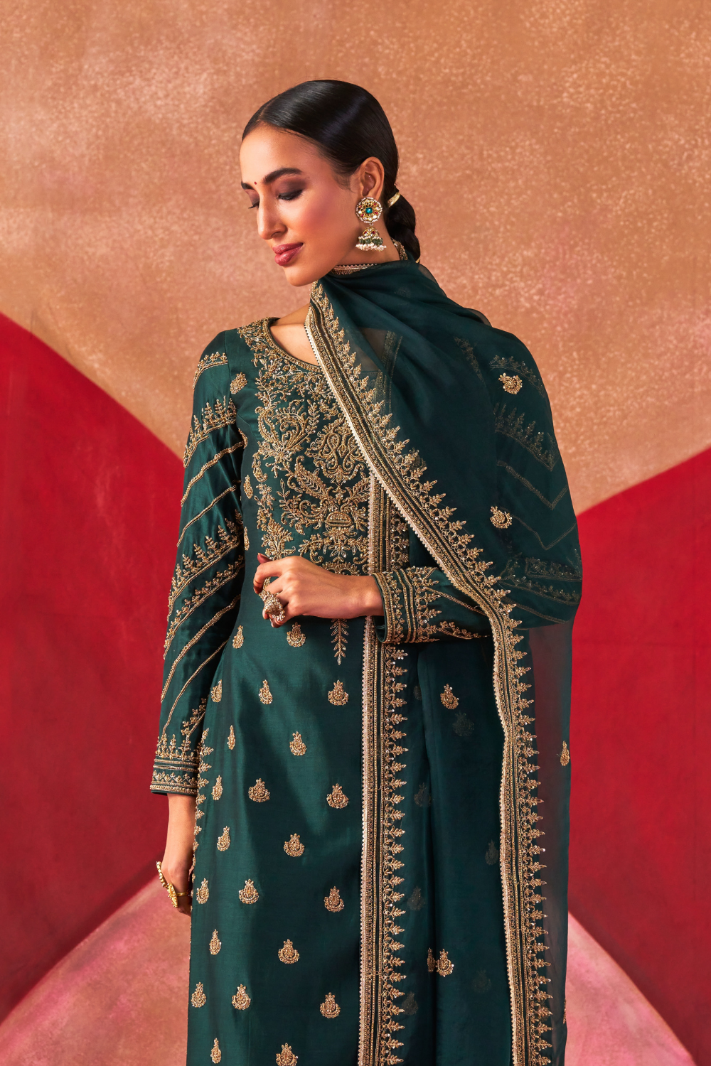 Featuring a bottle-greeen chanderi silk kurta set paired with an organza base dupatta with antique gold dori and embellished hand embroidery.
