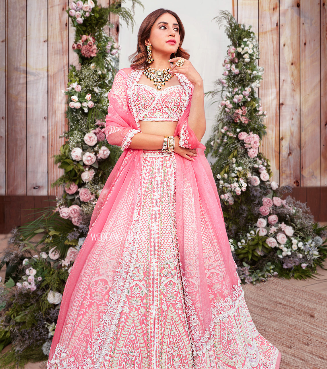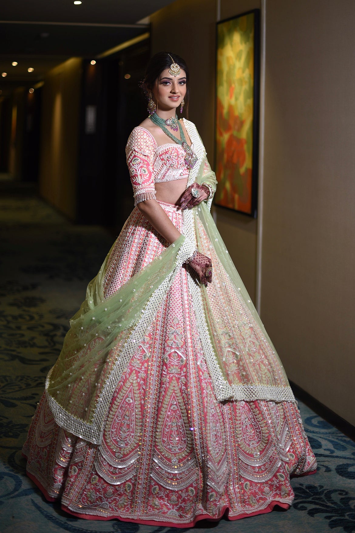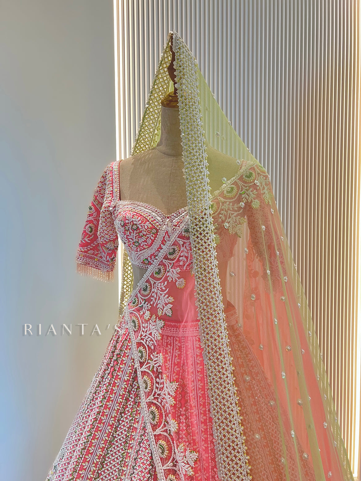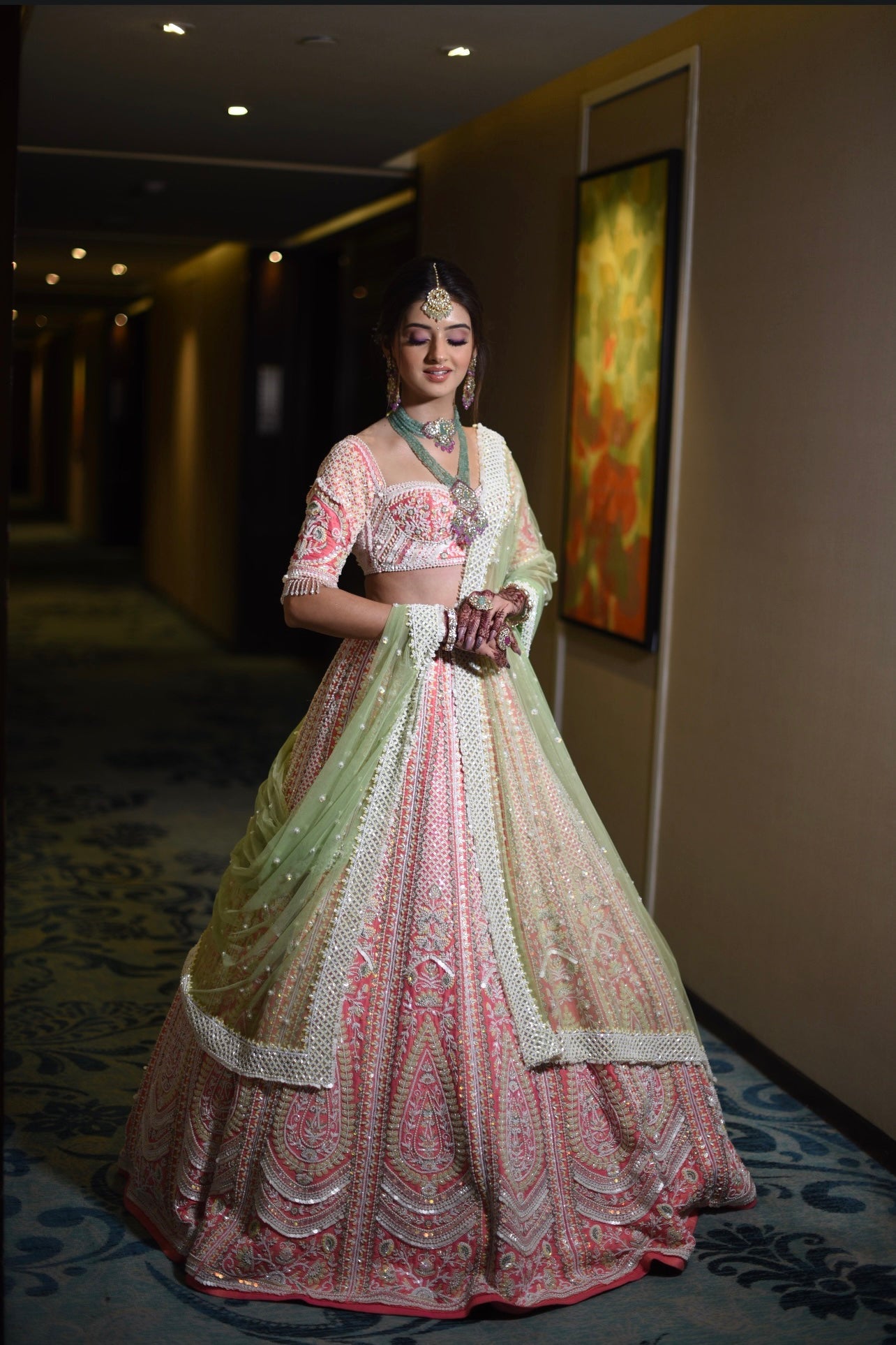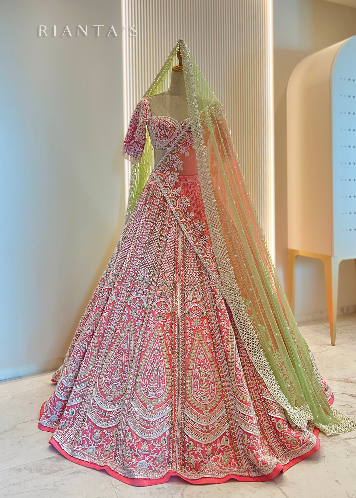 Fabric- Raw Silk lehenga and blouse, Silk organza dupatta and soft net dupatta