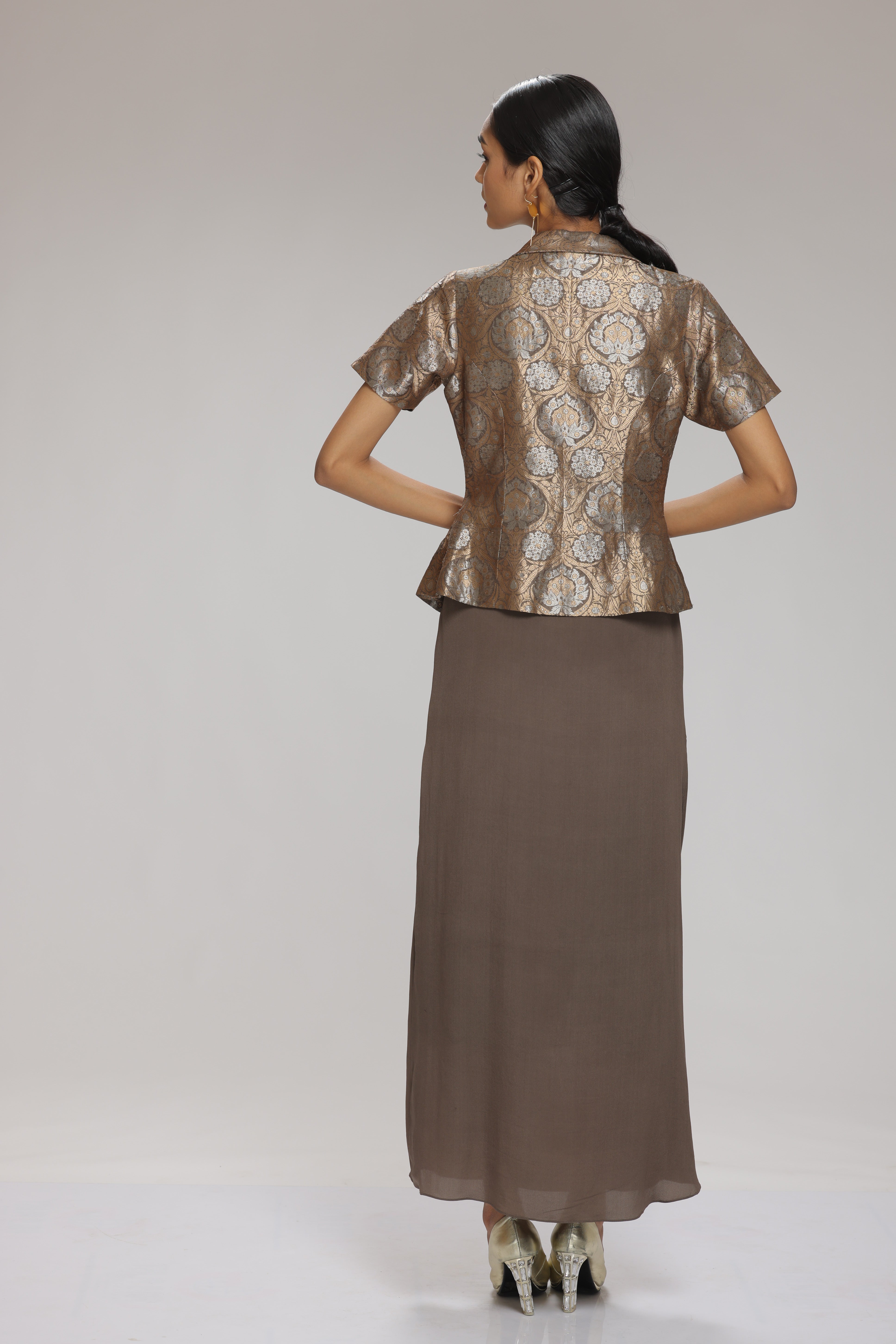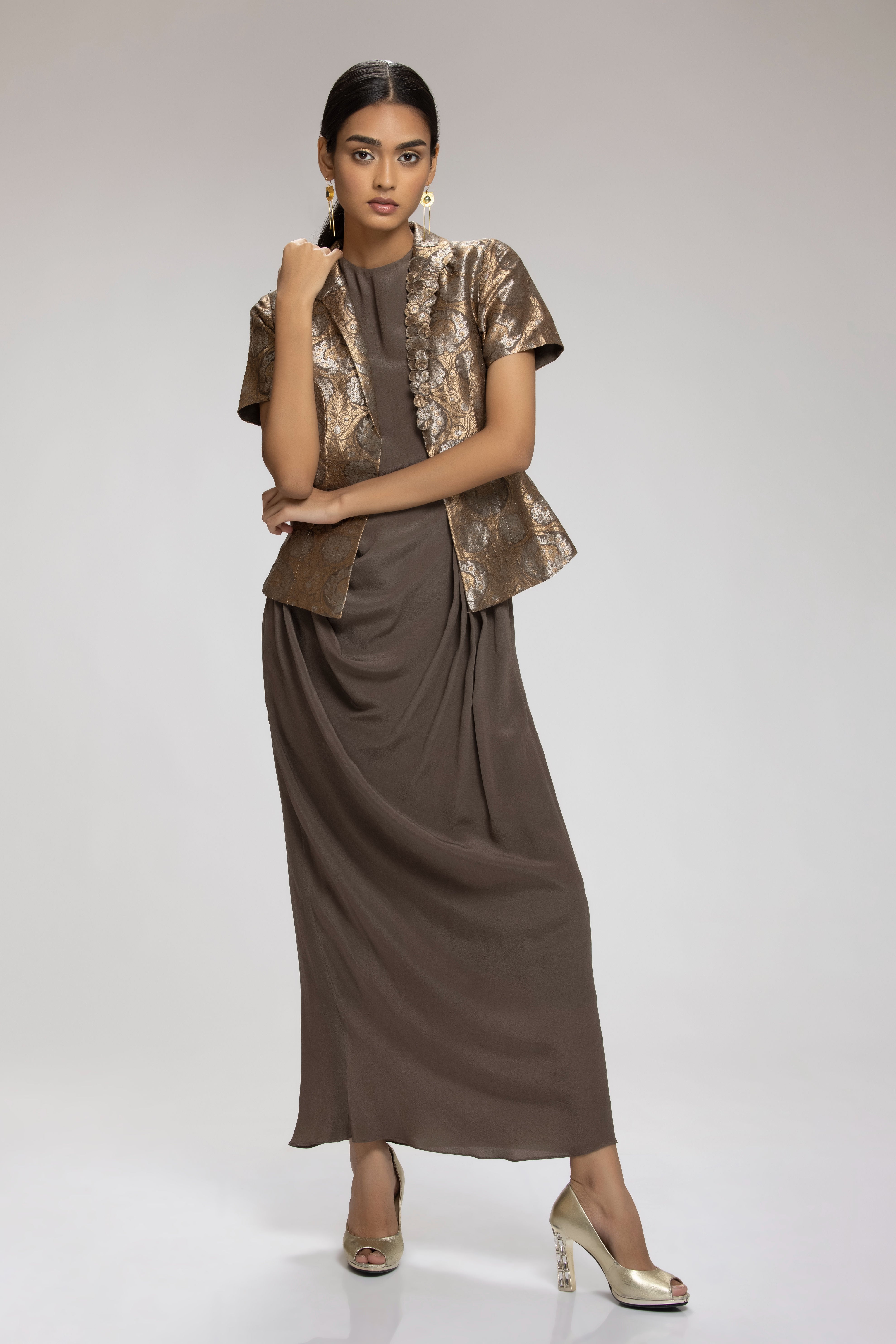 Cement grey banarsi brocade jacket, elegantly complemented by a draped silk crepe dress.