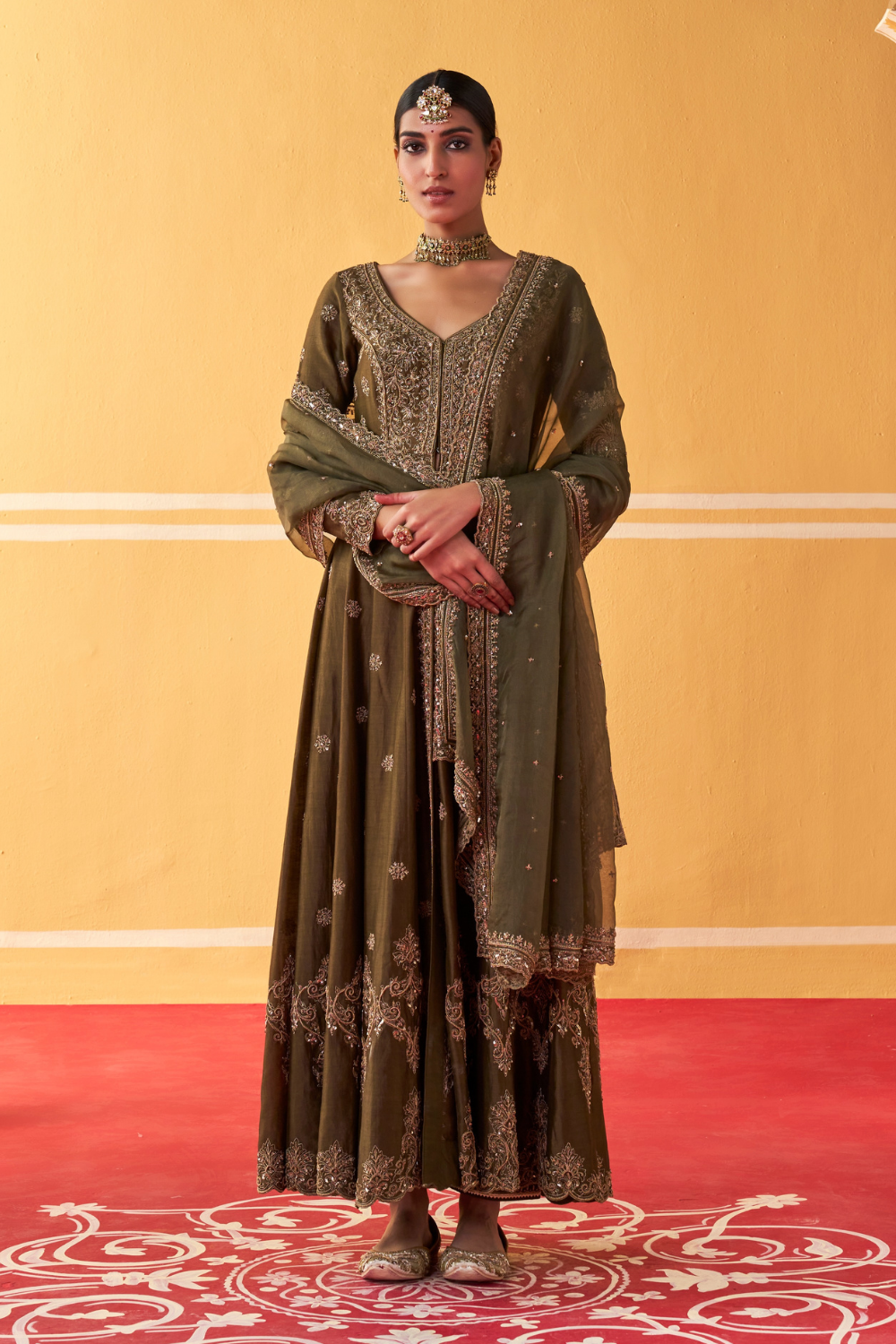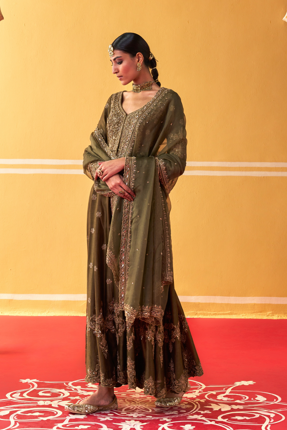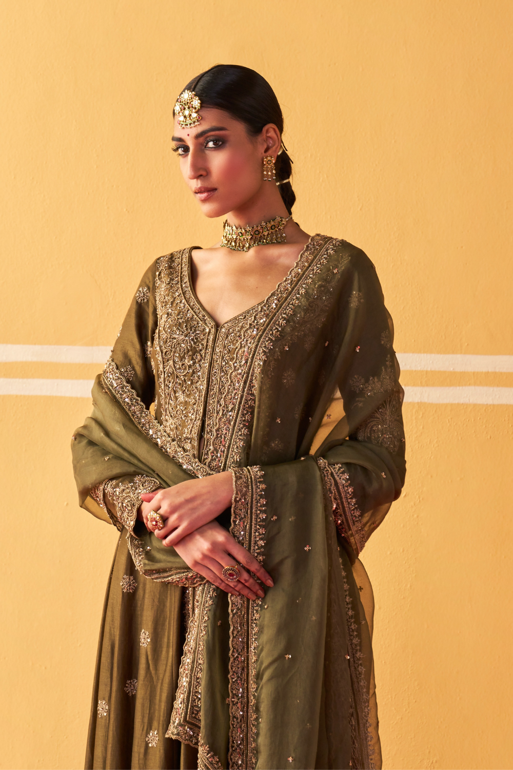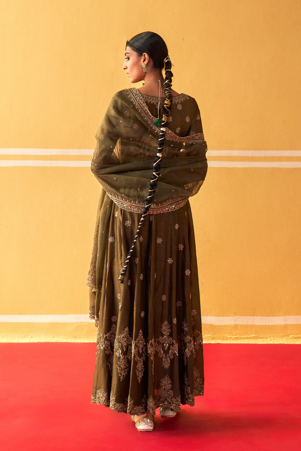 Featuring an olive green chanderi silk jacket set paired with an organza base dupatta with antique gold dori and embellished hand embroidery. Comes with a crinkled skirt