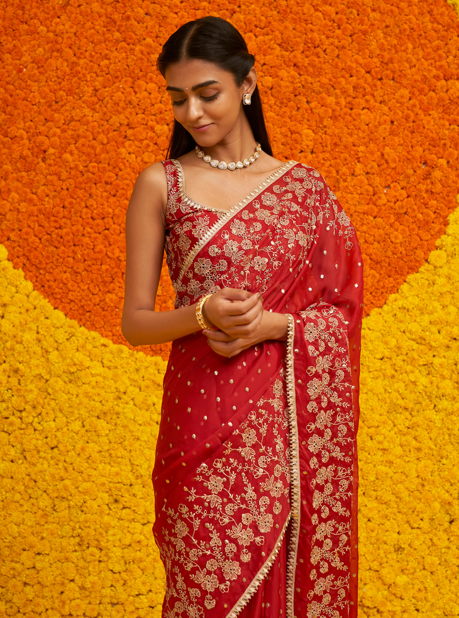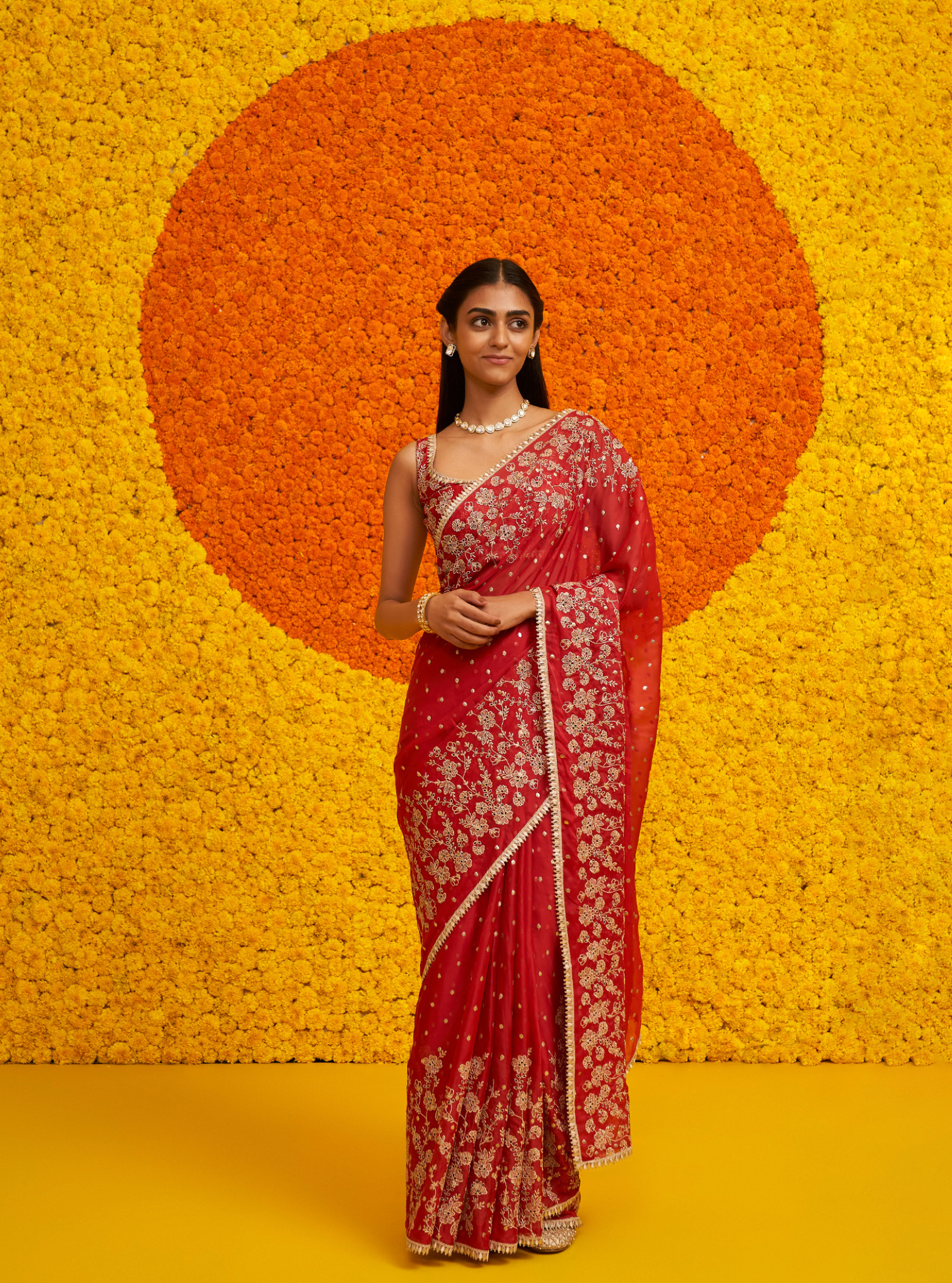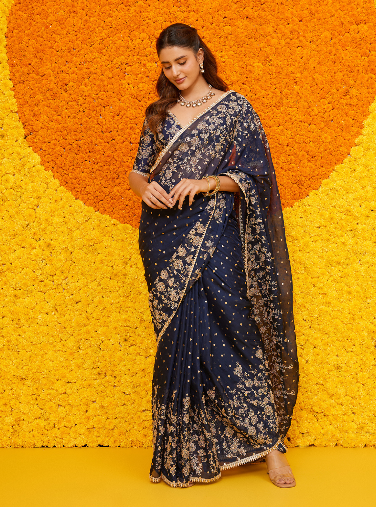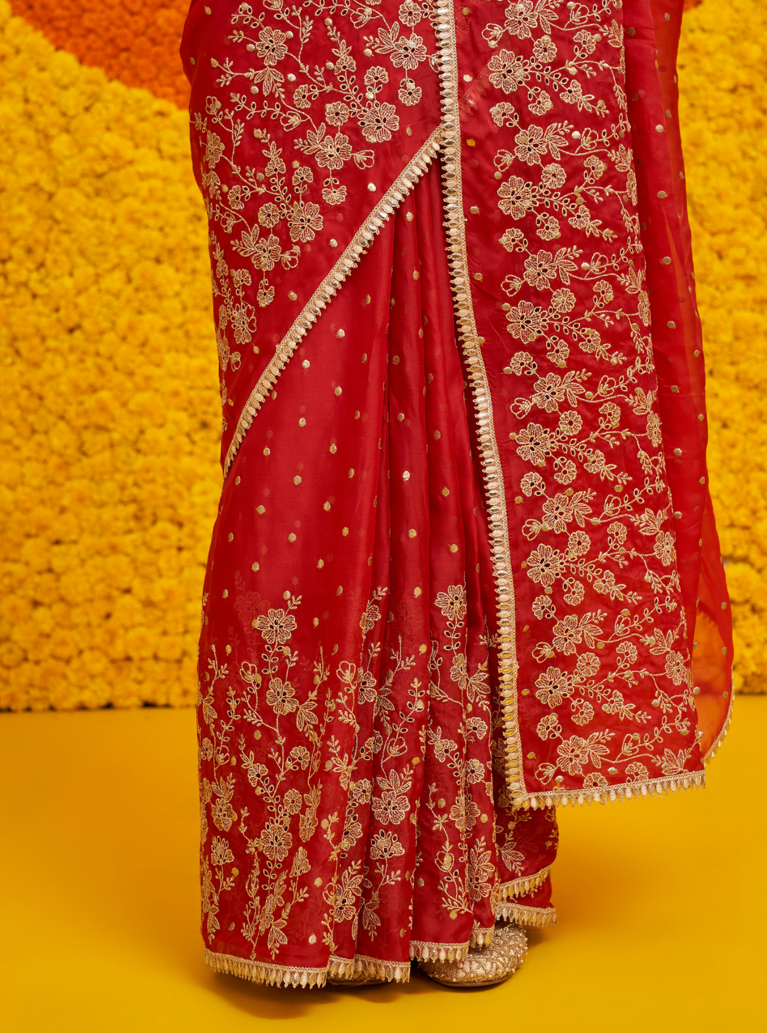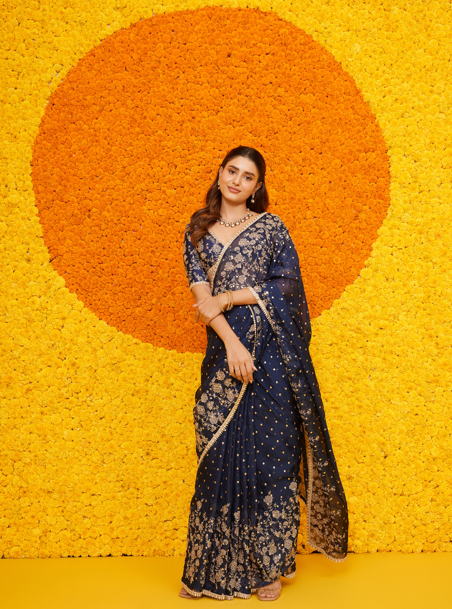 Step into the limelight with this radiant red/navy saree that perfectly captures the essence of festive opulence. The rich red fabric serves as a vibrant canvas for intricate silver and gold embroidery, with delicate floral motifs cascading gracefully across the length of the saree. Tinybooti embroidery throughout, adds a touch of sparkle that catches the light with every step you take. The border is finely detailed, framing the saree with a subtle yet elegant finish. Whether you're attending a wedding or a festive celebration, this saree ensures you'll make a lasting impression with its bold color and exquisite details. Paired with an unstitched blouse piece.