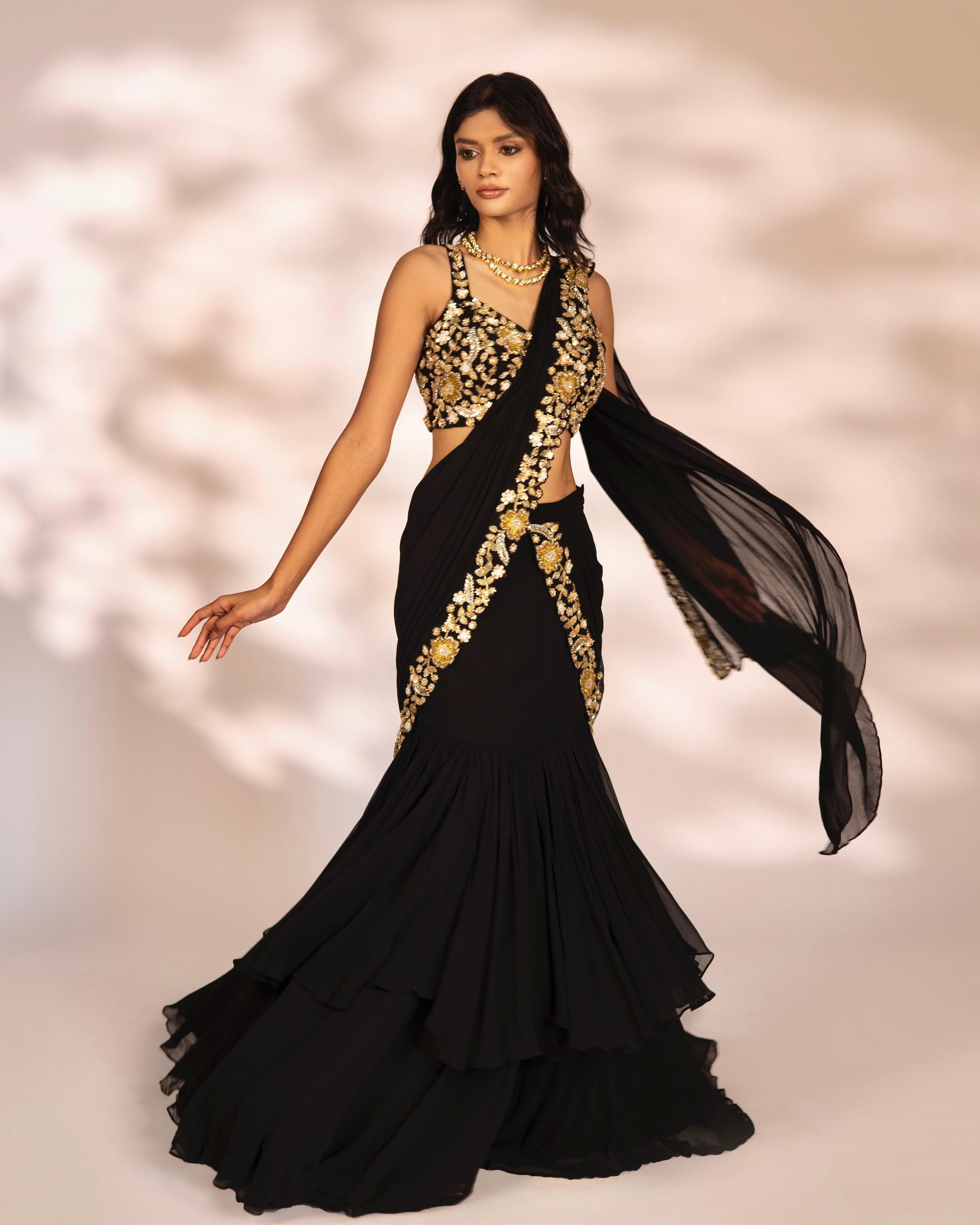Black pre-draped saree with embroidered drape and blouse.