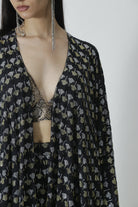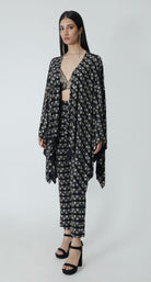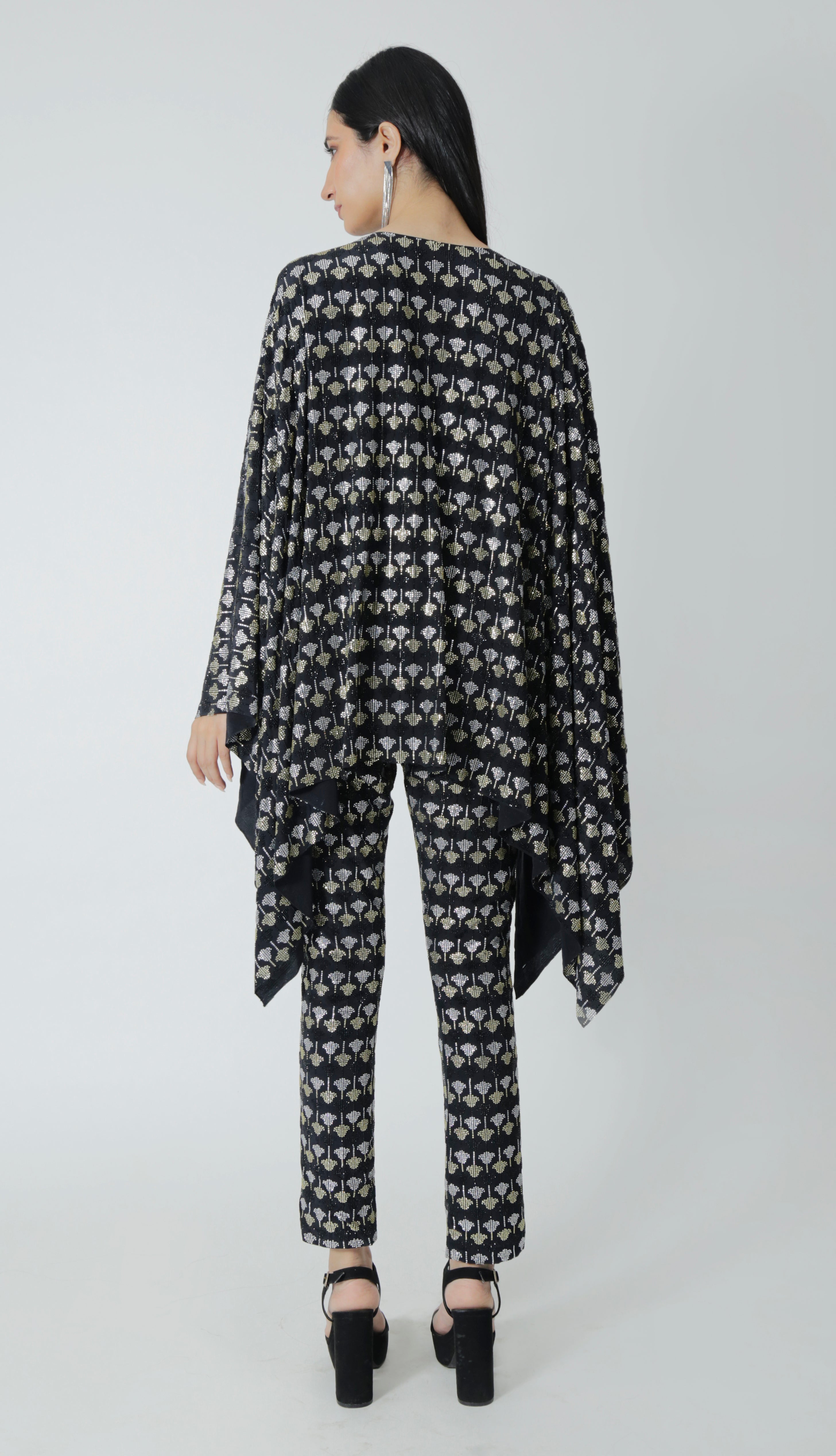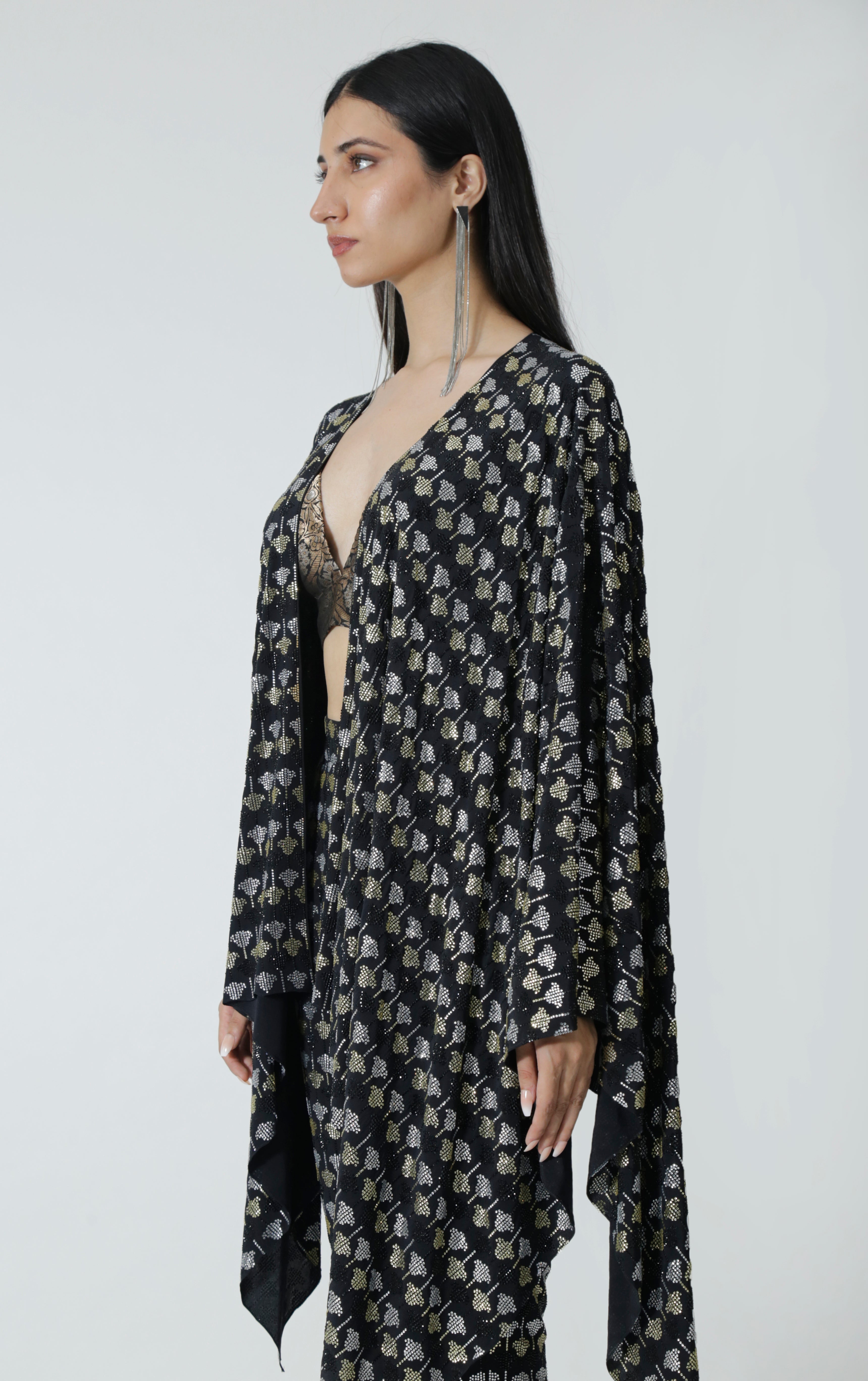 A Black silk crepe cape and pants encrusted with sparkling rhinestones, paired with brocade bralette.