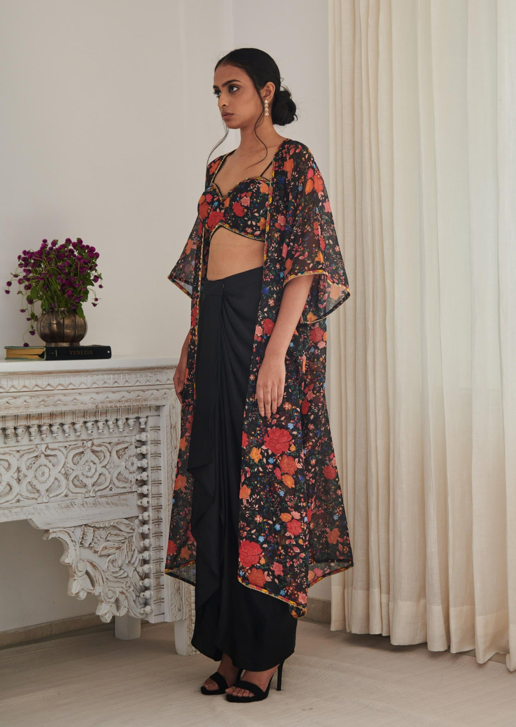 Black floral printed jacket , bralette and draped skirt which has hand embellished thread