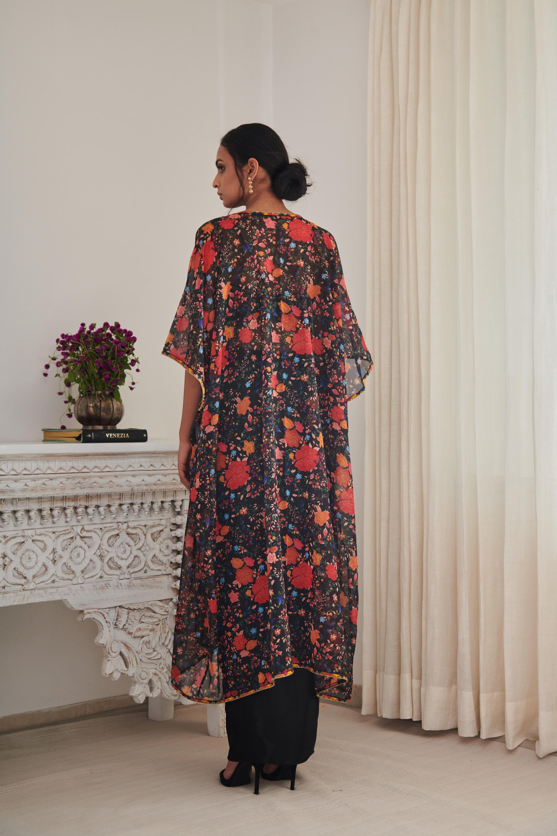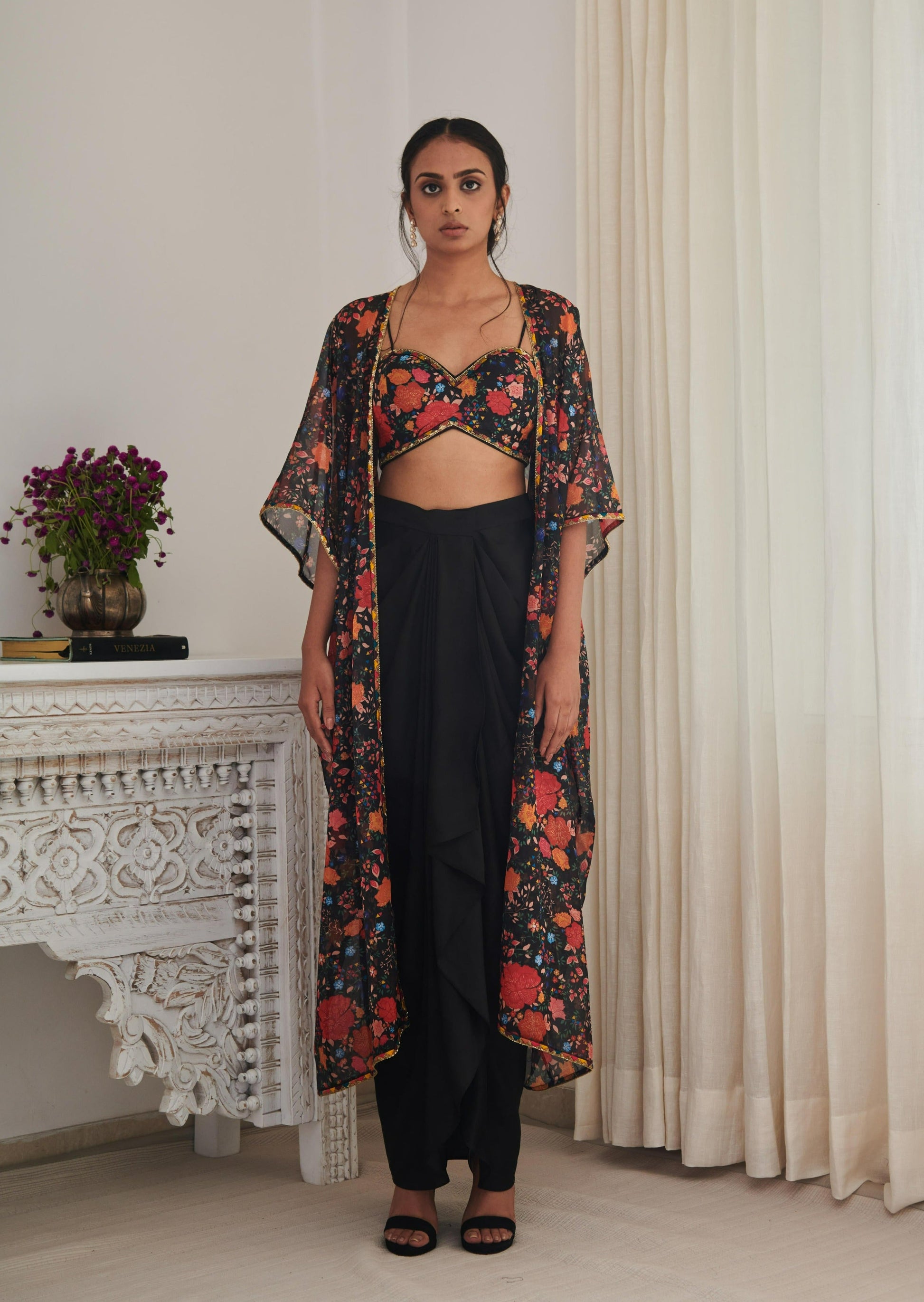 Black floral printed jacket , bralette and draped skirt which has hand embellished thread