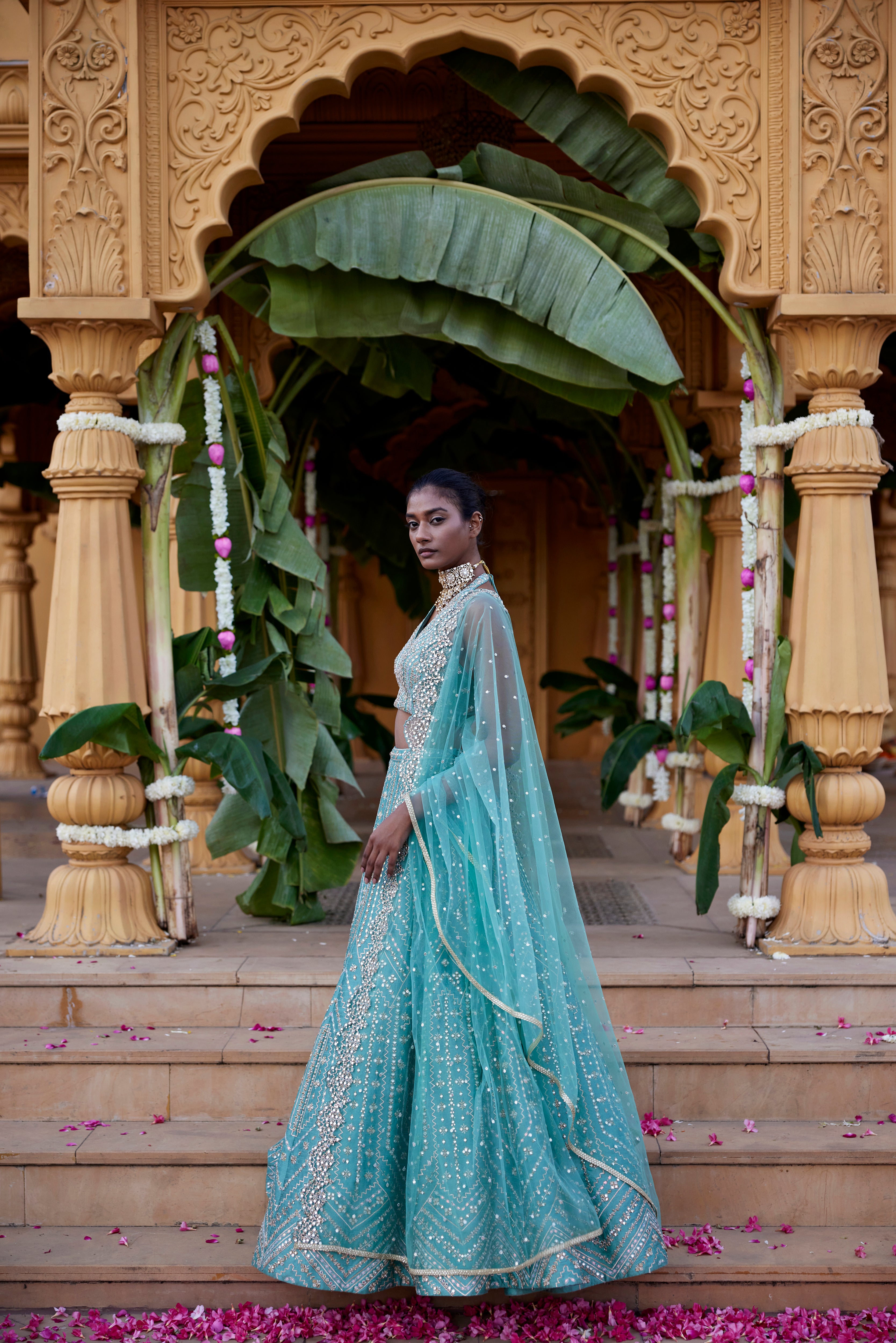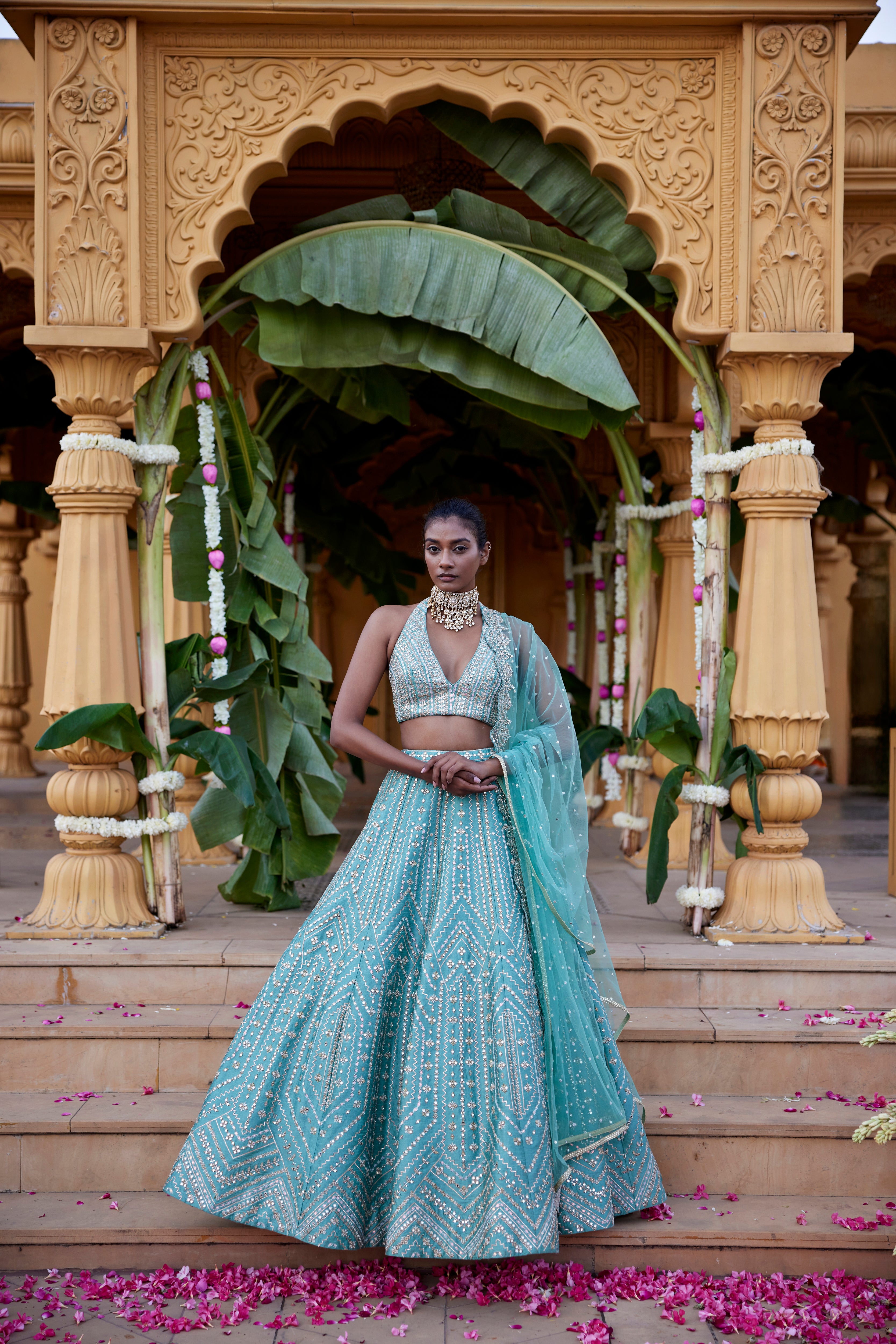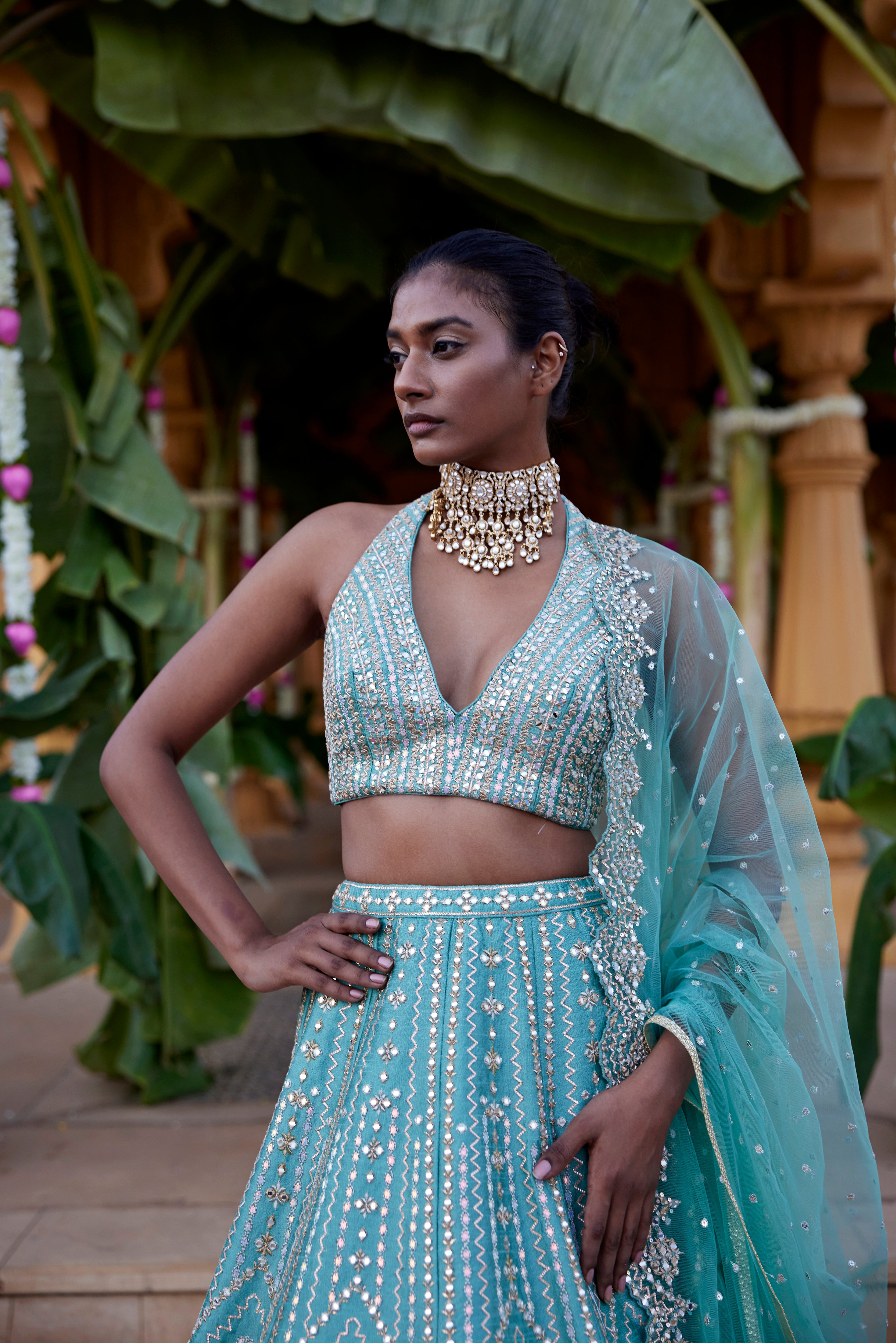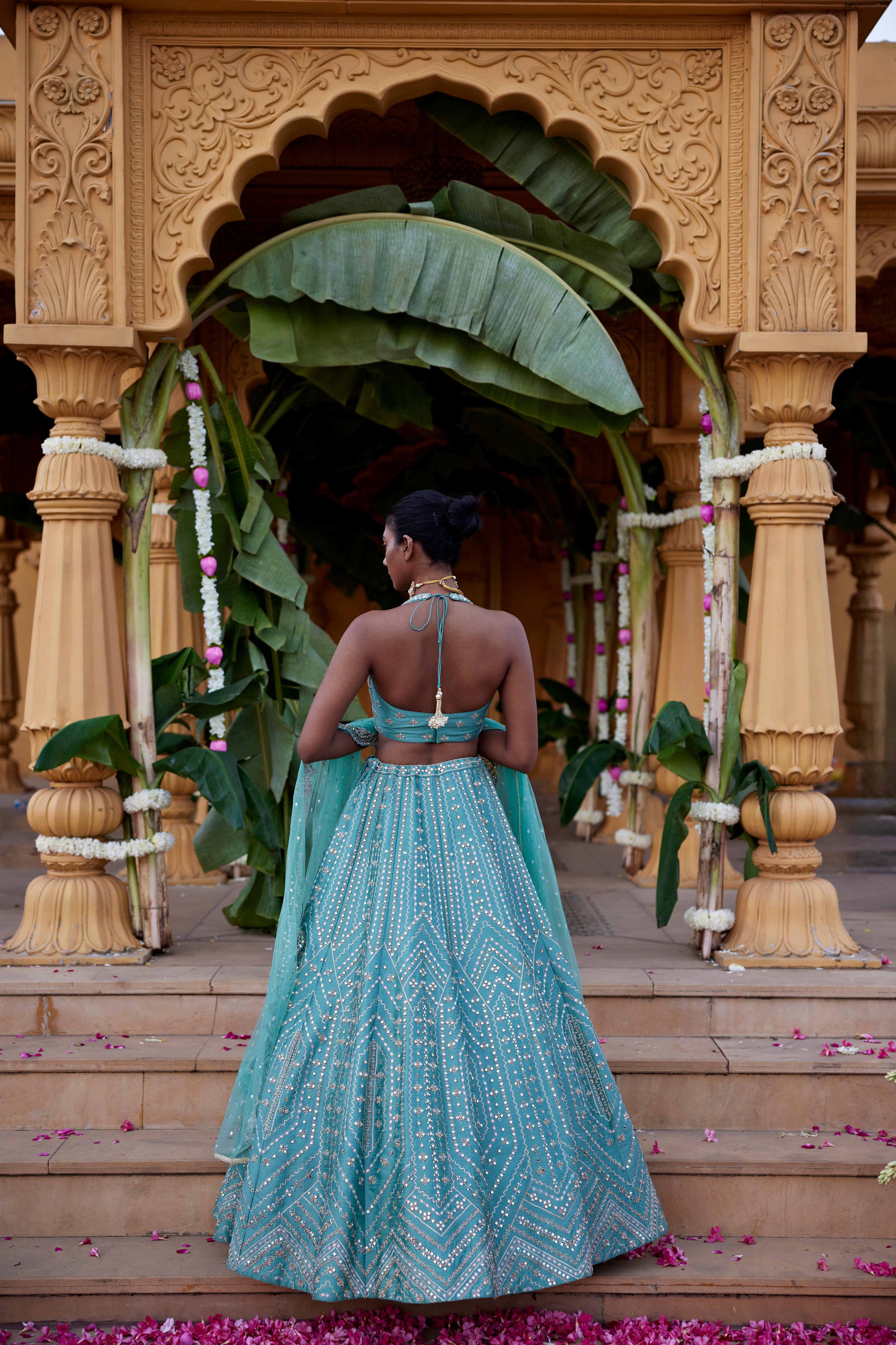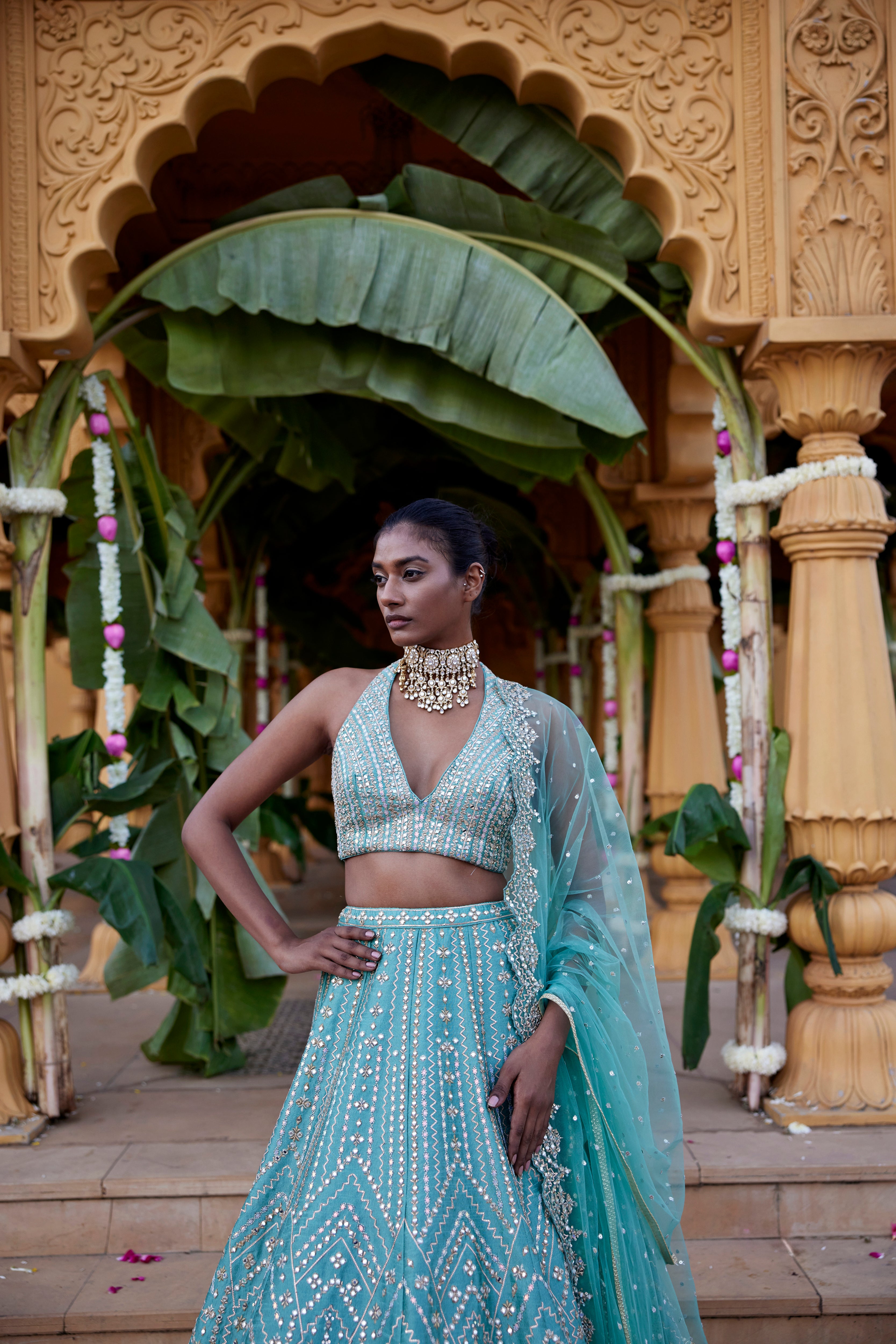 Green dupion silk geometric embroidered lehenga with mirror, zari and gota detailing paired with halter neck blouse and tulle scallop edged dupatta.
