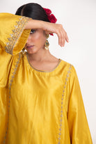A yellow kurta set complemented with salwar, embellished with intricate antique gold zardozi embroidery.