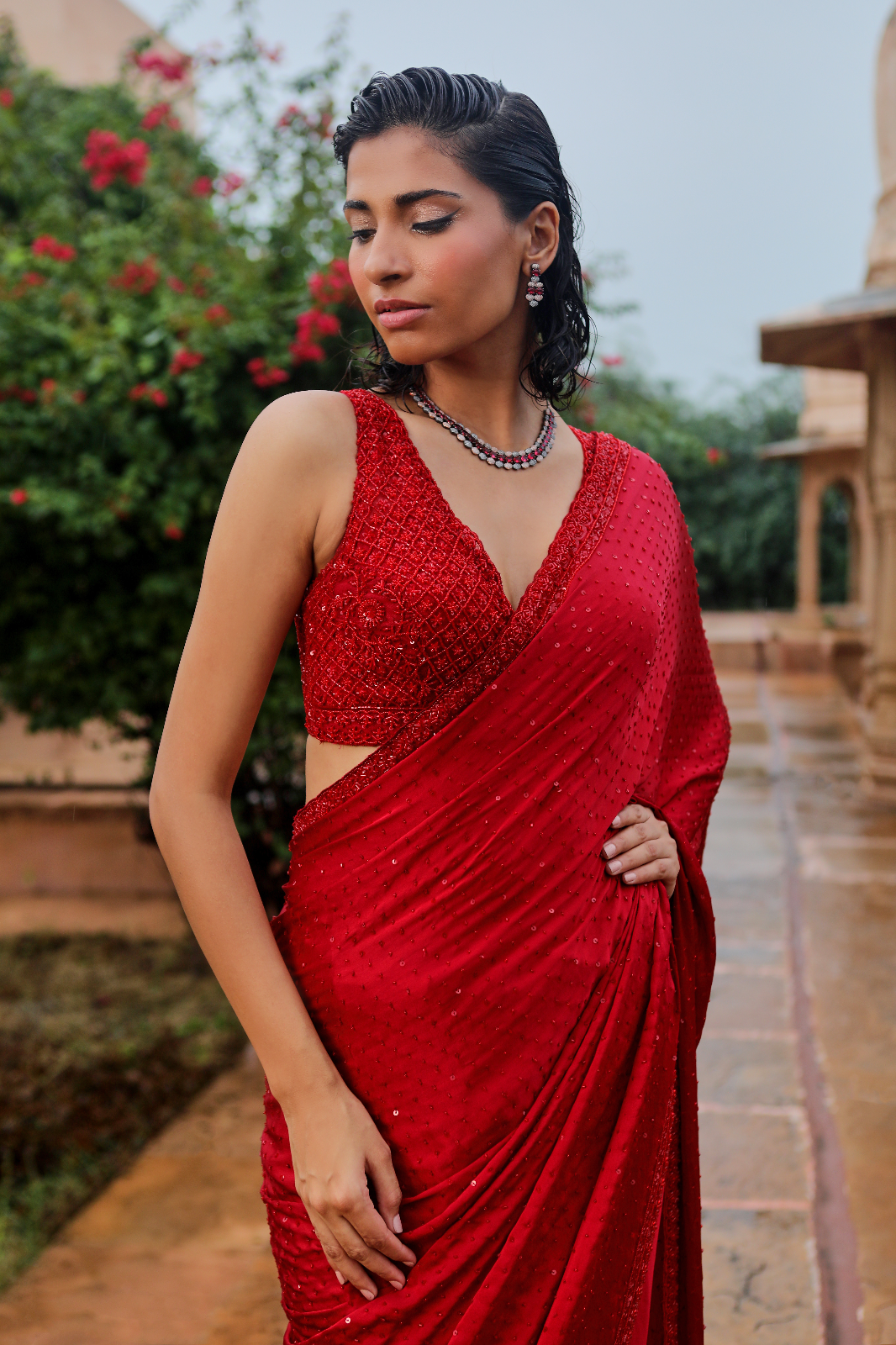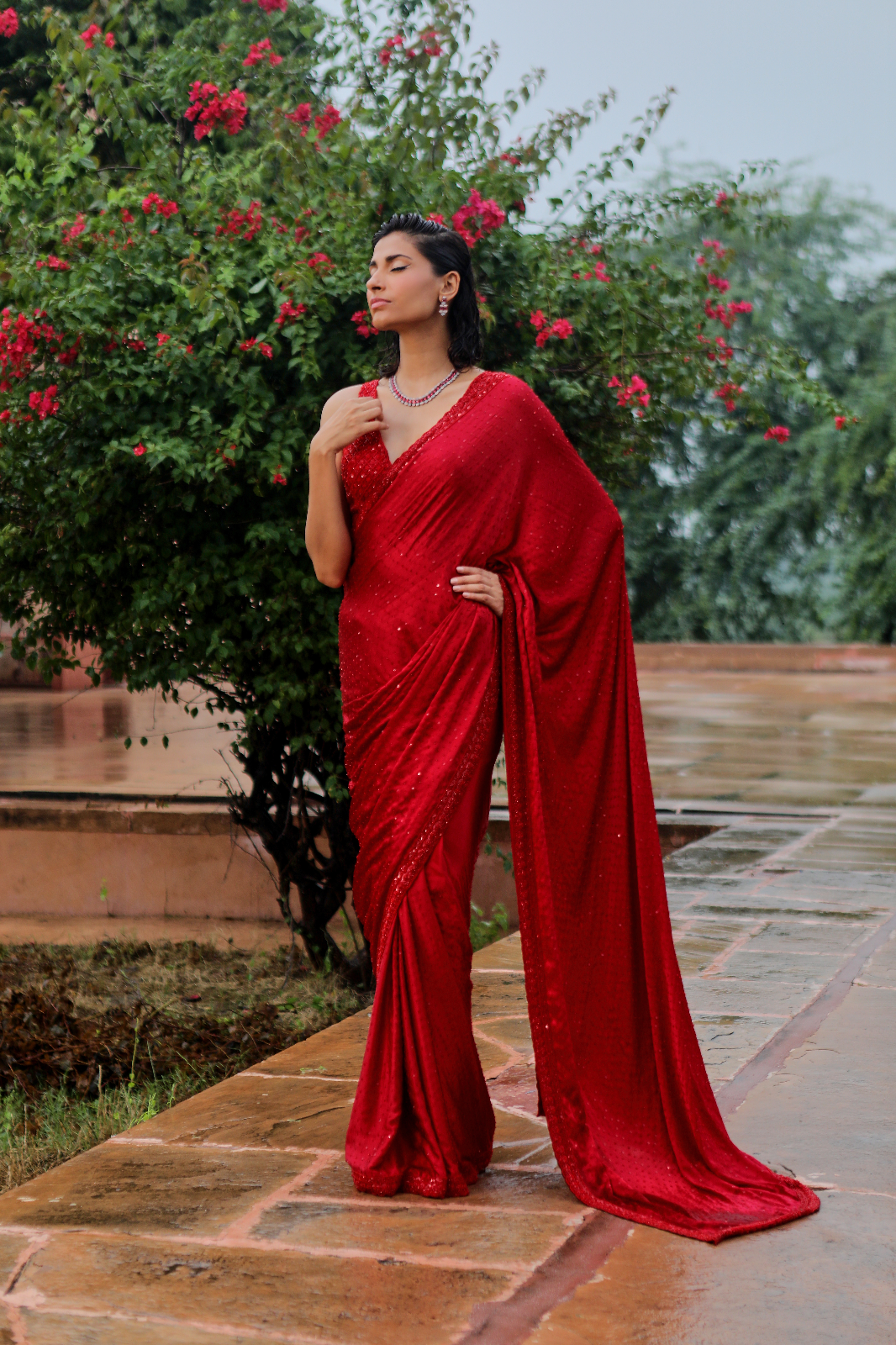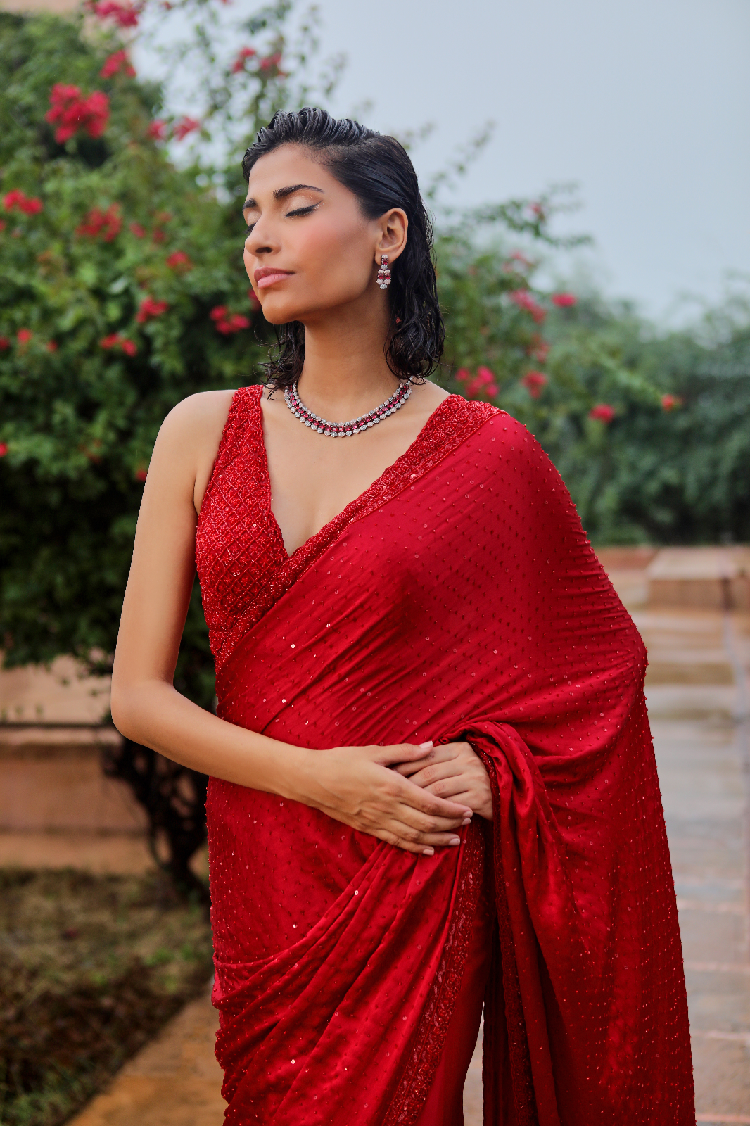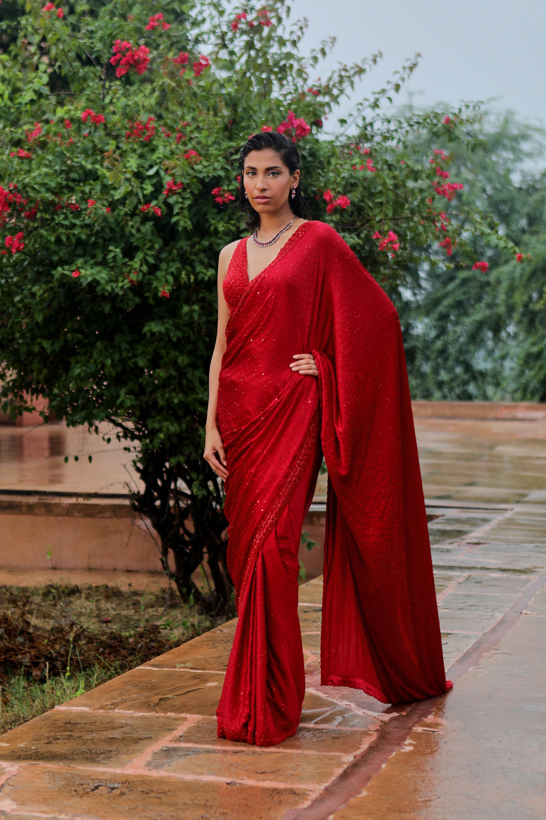 Featuring a red Pure Satin saree paired with a net blouse with tone-on-tone sequin embroidery