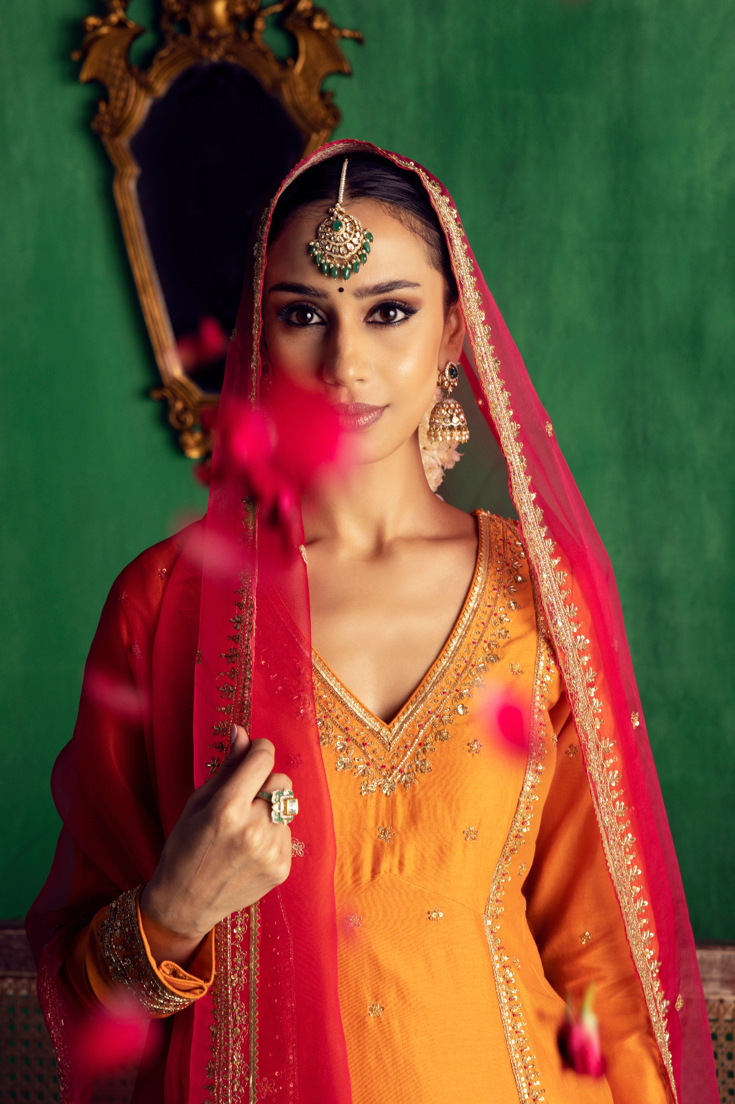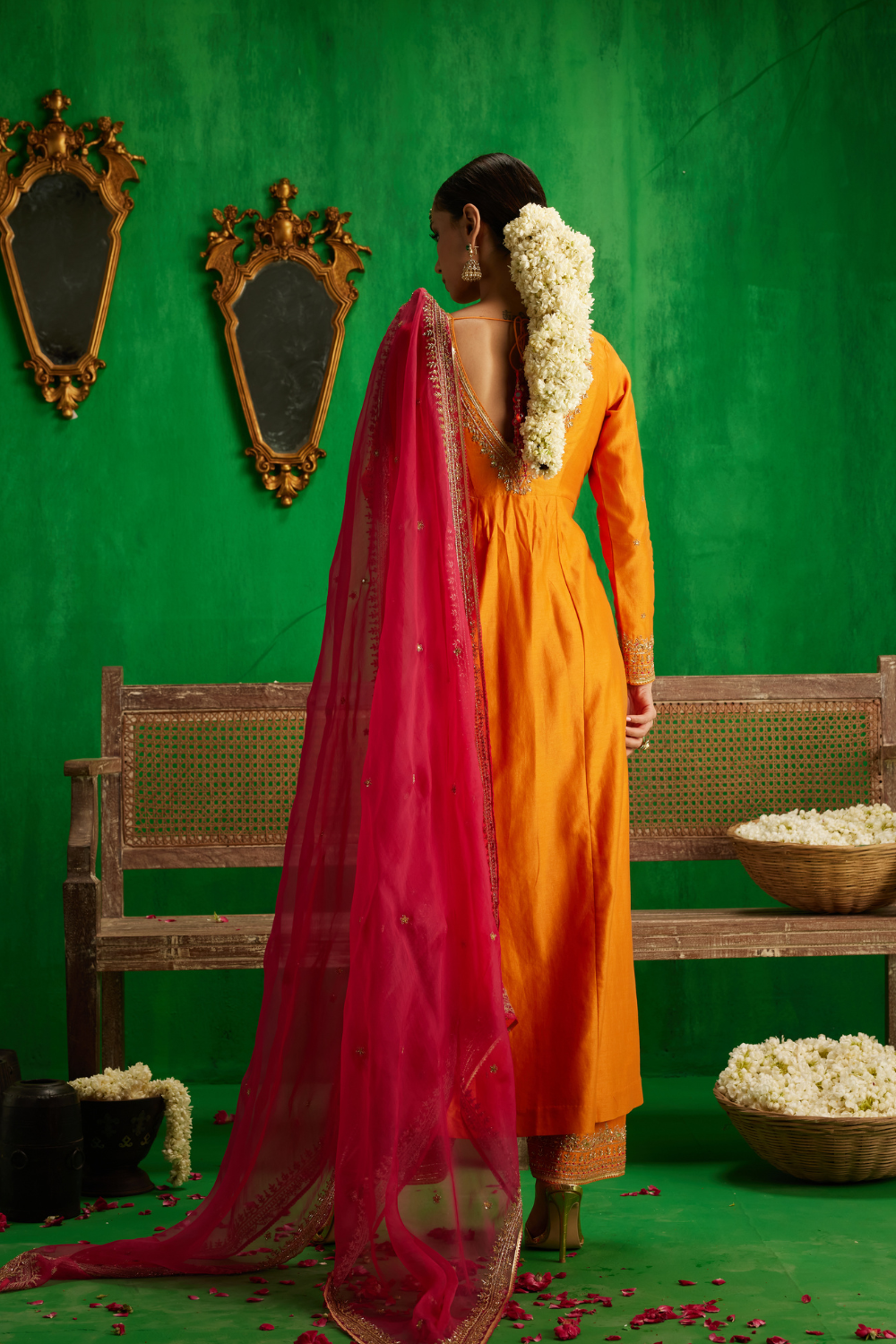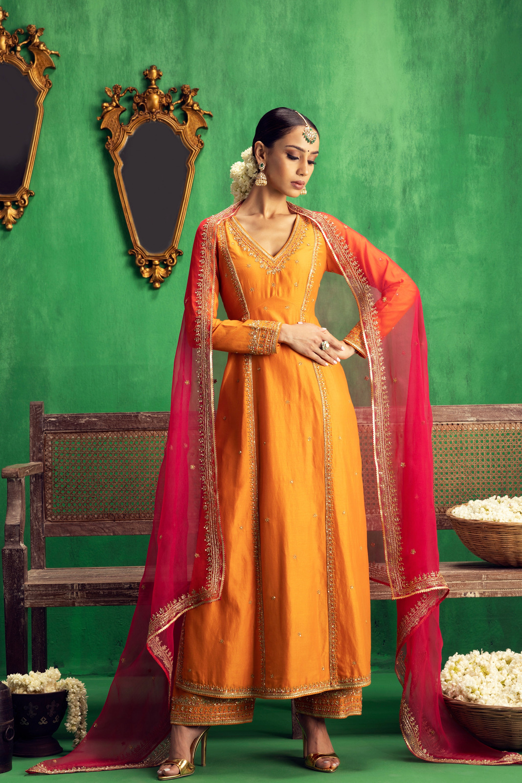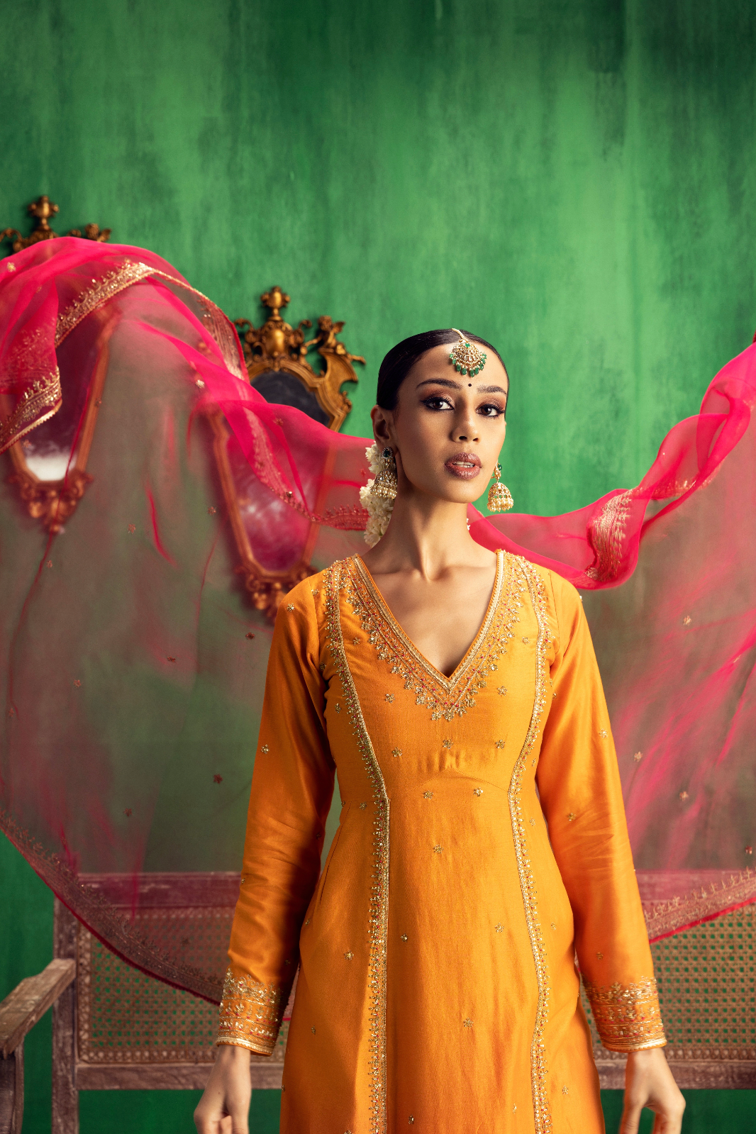 Featuring an orange Chanderi straight suit set paired with chanderi pants and a hot pink organza dupatta with gold dori and aari embroidery