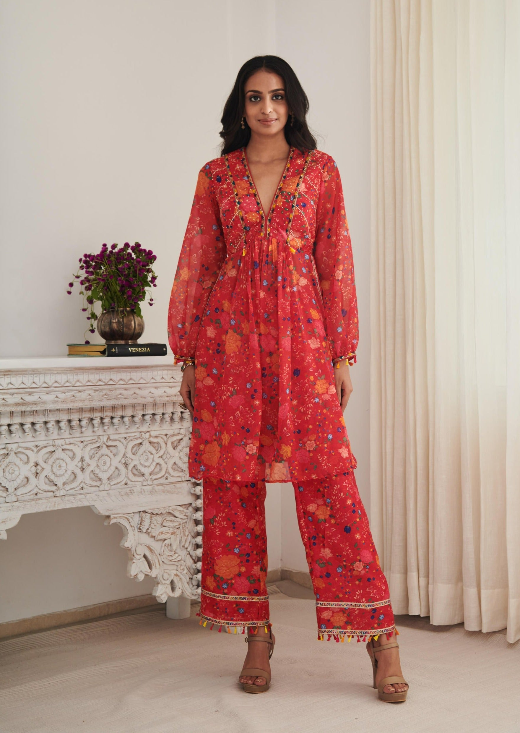 Bright red floral printed kurta with hand embellished thread work with multicolored thread and sequence details , comes with flared pants and hand made latkans.