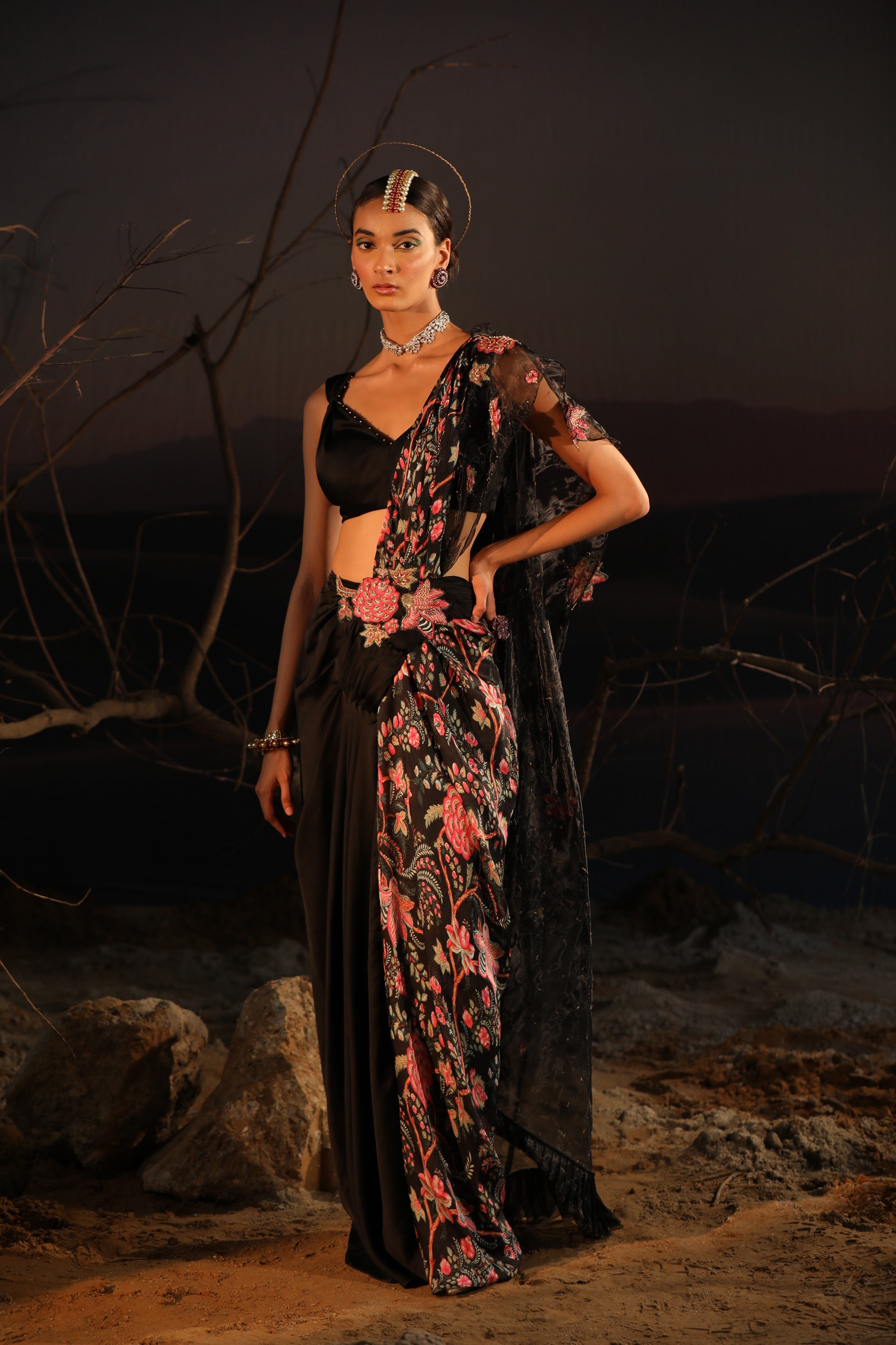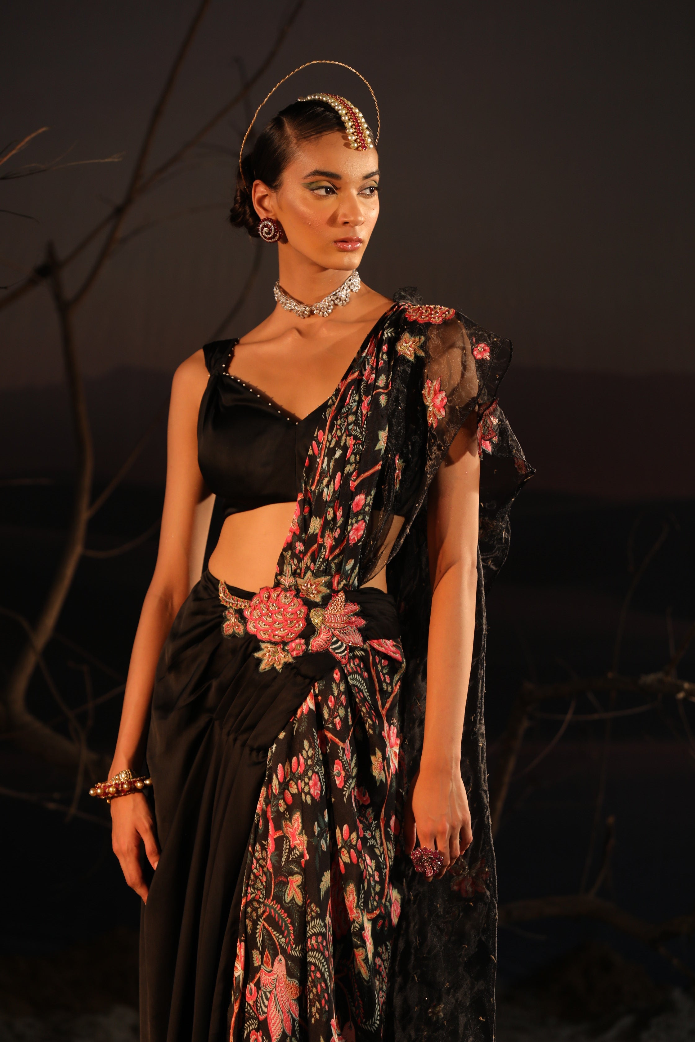 Black floral saree feature an intricate pink blossom pattern with vines all over the drapes and palla beautifully hand embroidered, V-neck sleeveless blouse with beads stitched at the neckline and unique drapes at the waist paired with mirror belt. Sheer black ruffles at the end of the palla.