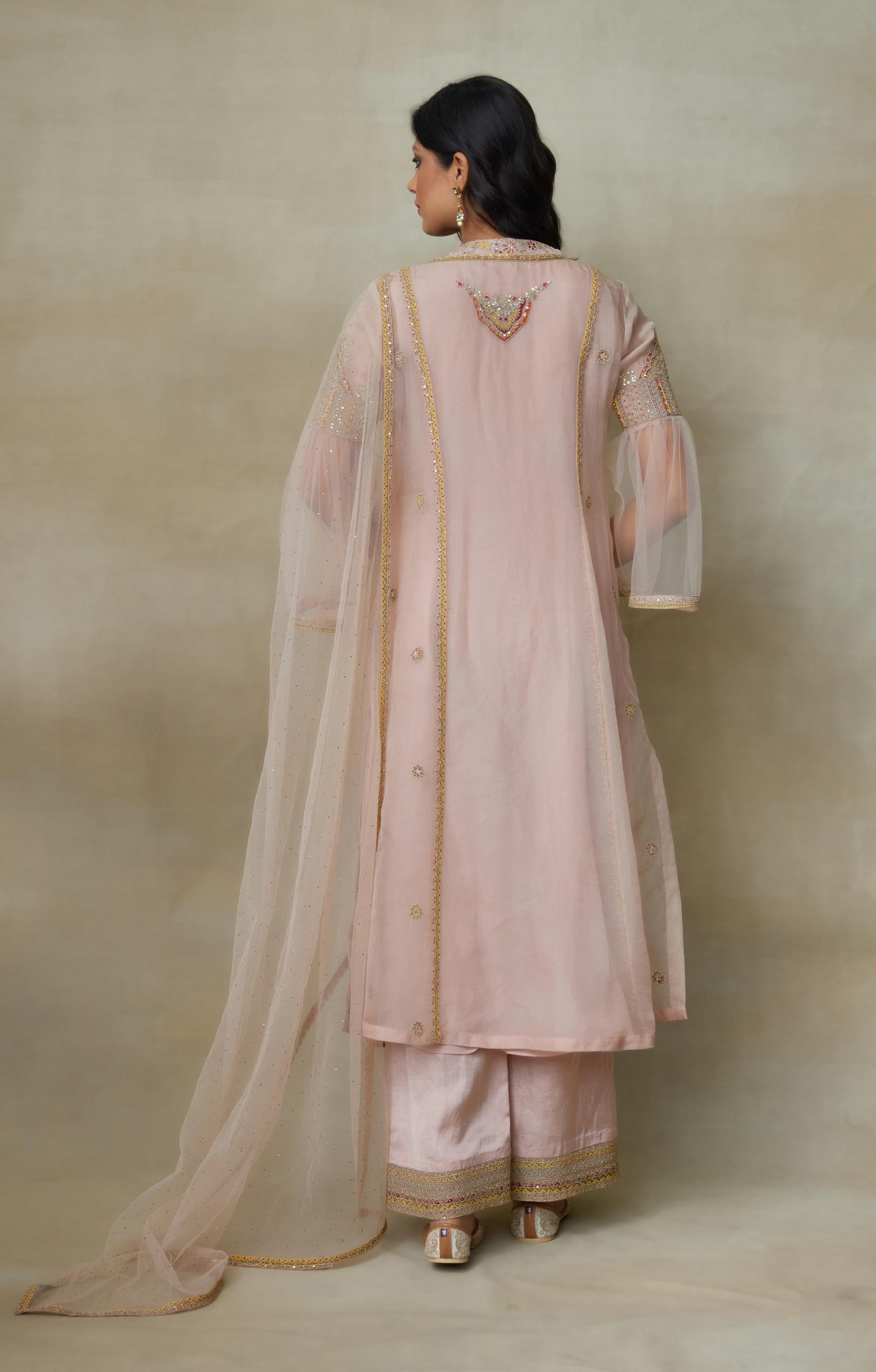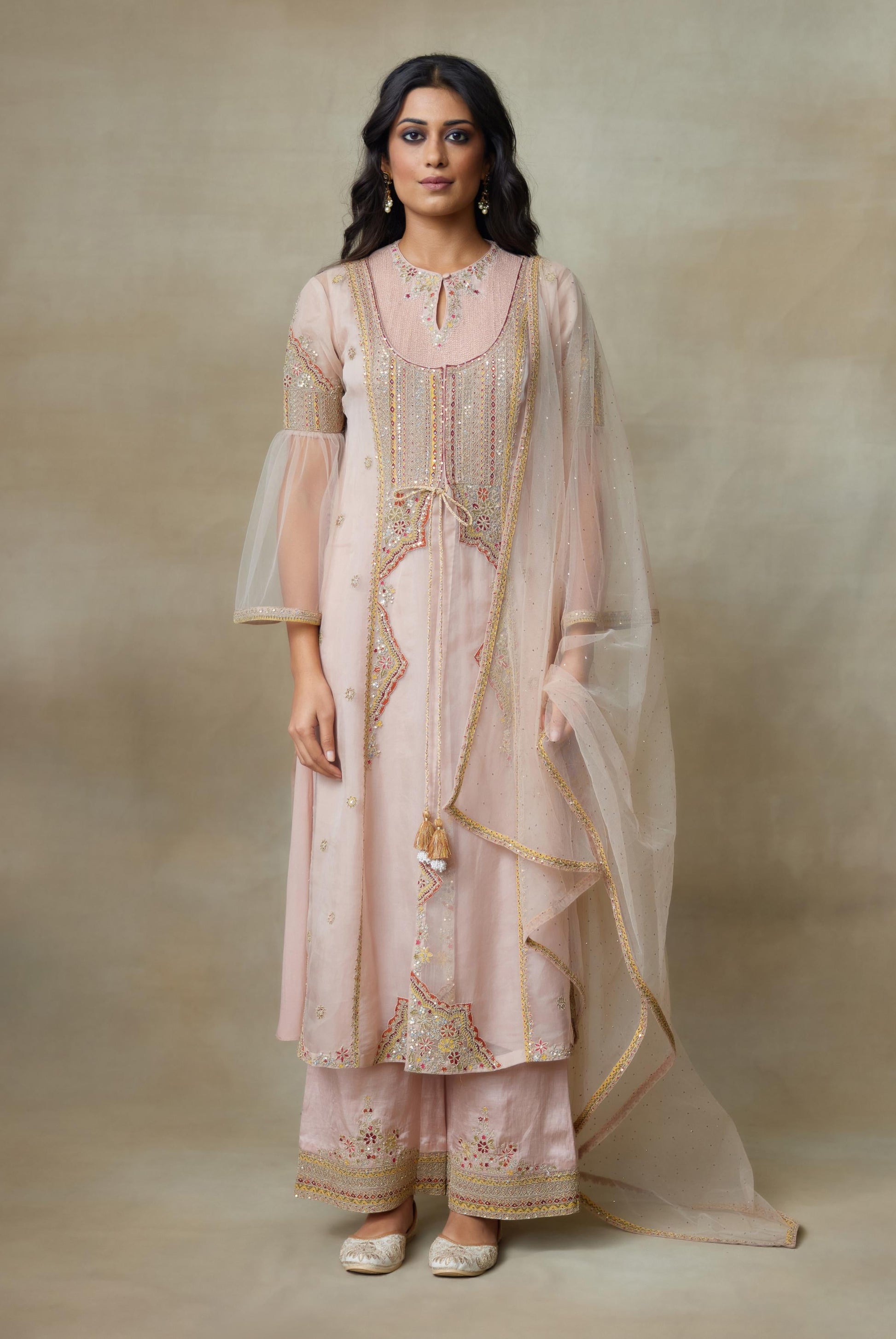 Our Silk Organza Rose Coloured Kurta Set With Jacket Style Top Has Zari And Resham Work With Sequence Spread All Over Making It A Enchanting Ensemble.