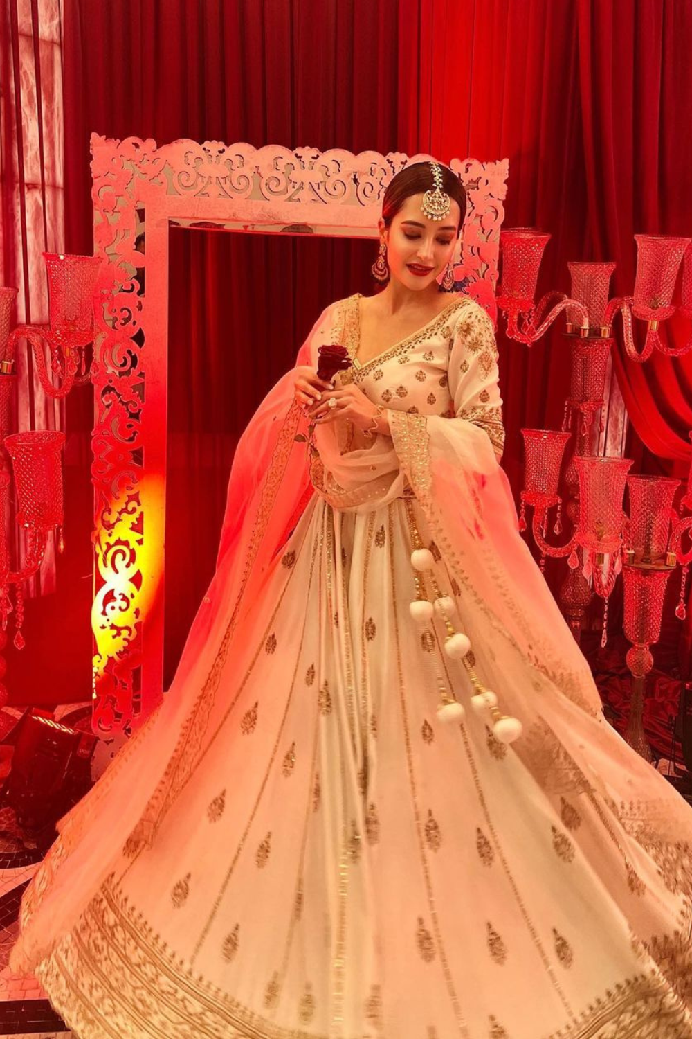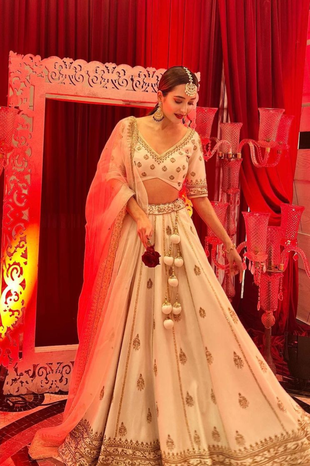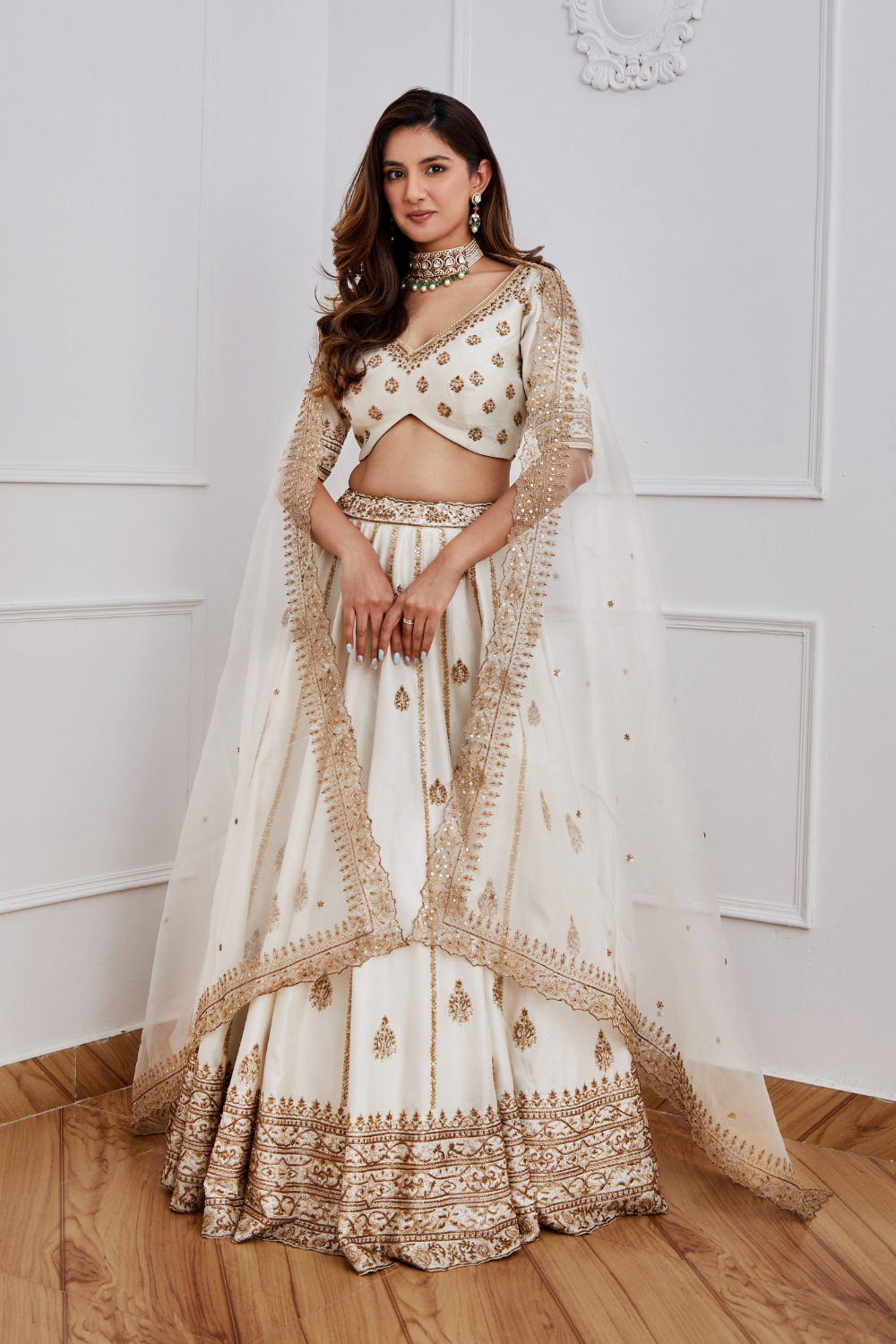 Featuring a pearl white chanderi lehenga set paired with an organza base dupatta with gold dori & aari embroidery on it.