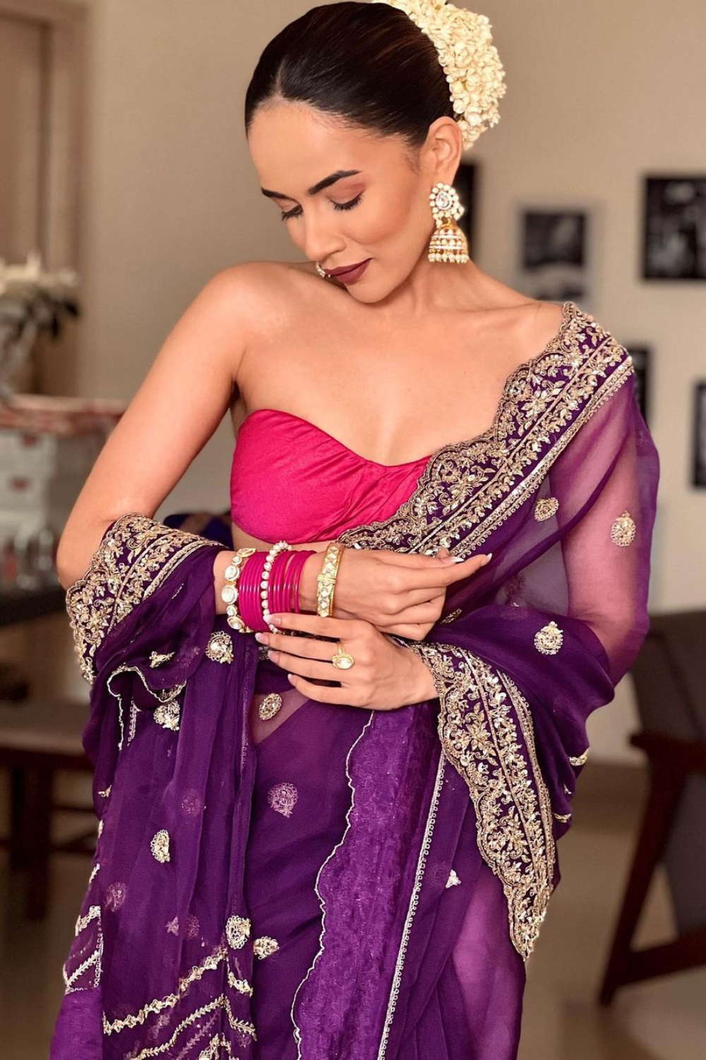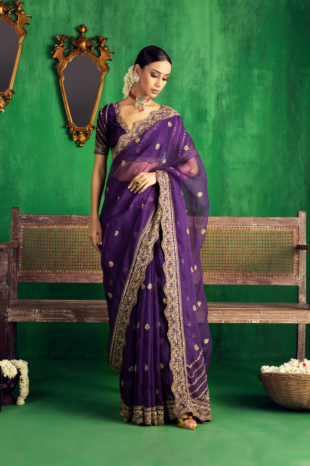 Featuring an Irish purple Organza saree paired with a raw silk blouse with gold dori and aari embroidery