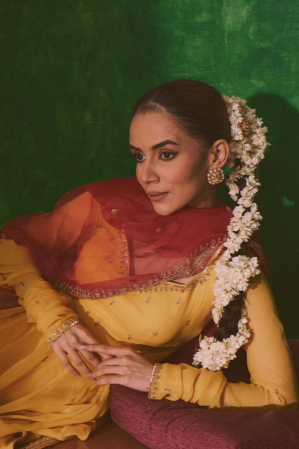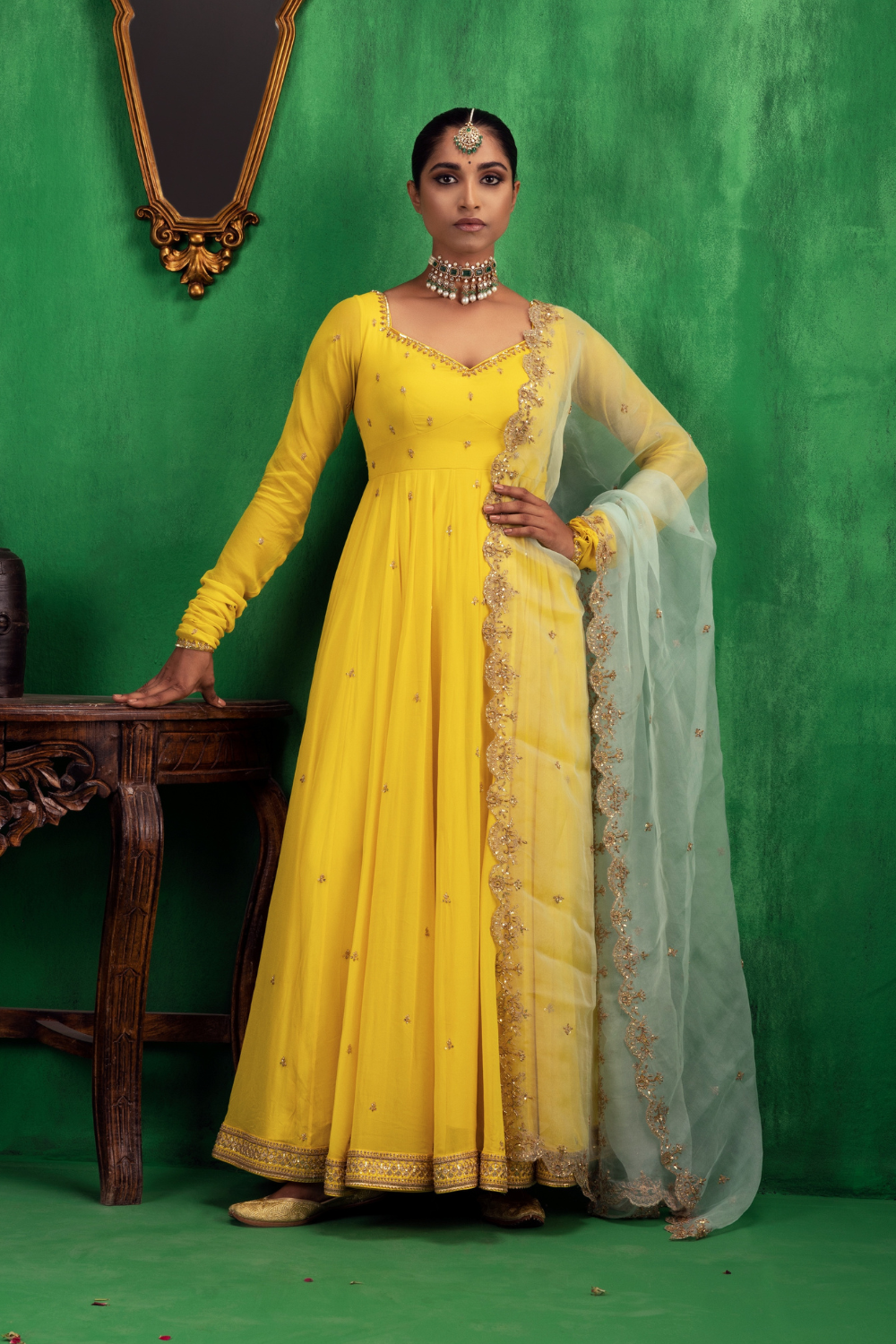Featuring a yellow Georgette Anarkali paired with a cotton silk churidar and an aqua coloured Organza dupatta with gold zari and aari embroidery