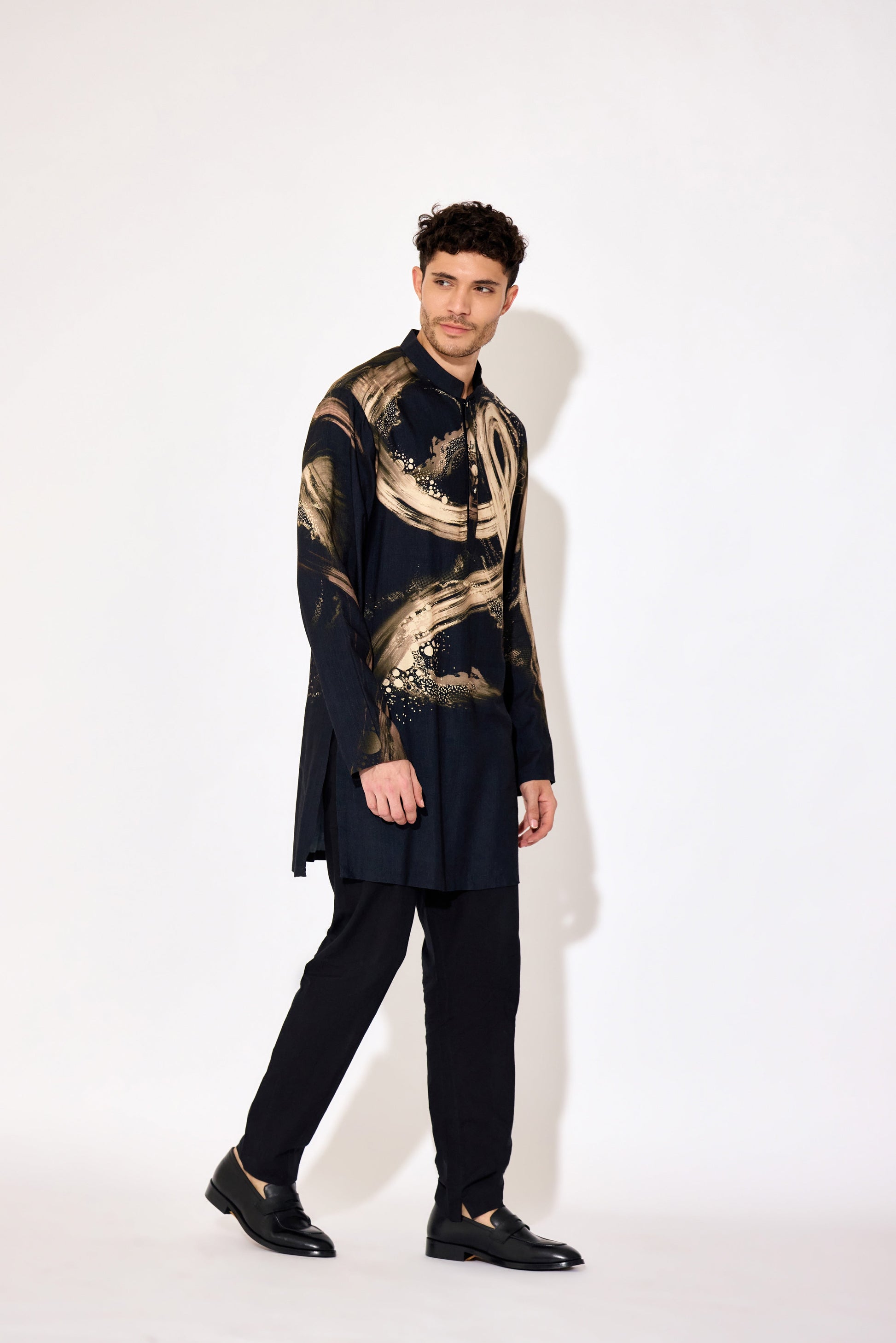 Elevate your traditional wardrobe with this expertly tailored kurta featuring a contemporary abstract print. Crafted from breathable fabric, it ensures comfort while offering a distinctive style statement. This versatile kurta combines modern design with classic menswear aesthetics, making it suitable for festive occasions and casual gatherings alike.