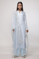 A Crew neck kurta Set, adorned with sparkling rhinestones and paired with Crinkled Satin pants and a rhinestone embellished dupatta, complete with an attached slip for added convenience.