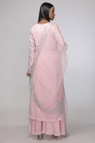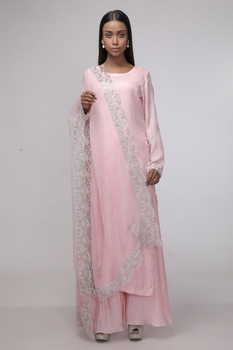 A Straight kurta set, intricately adorned with a rhinestones and paired with sharara, creating a harmonious blend of traditional and contemporary styles. Completing the look is a rhinestone embellished scalloped dupatta, accompanied by a slip for added comfort.