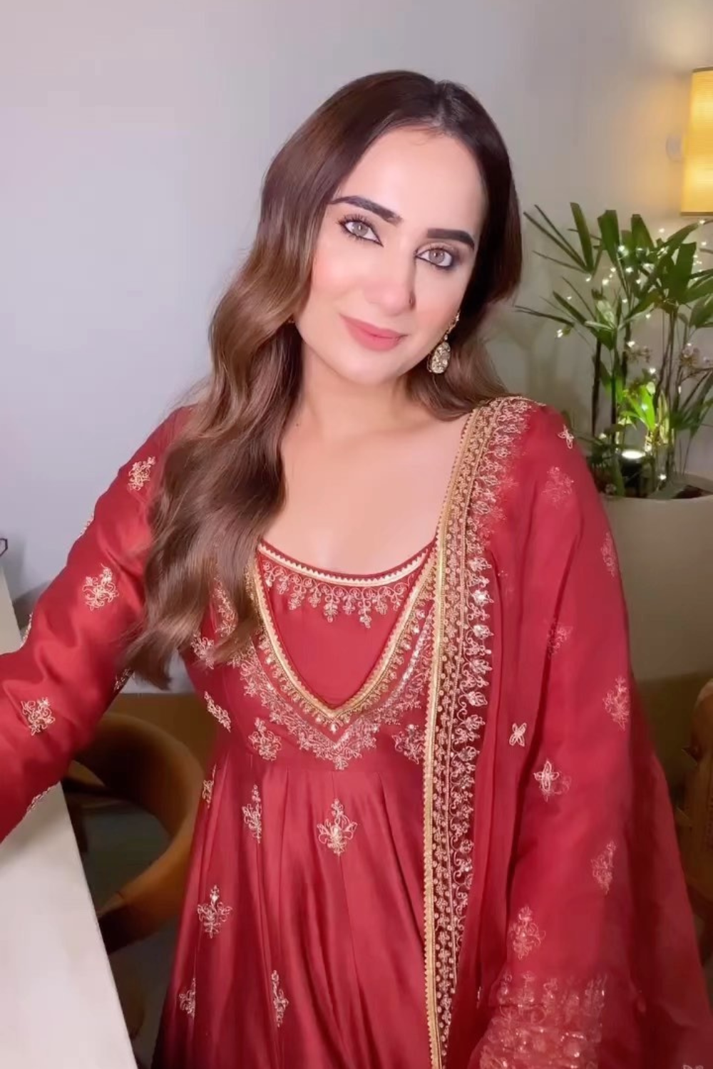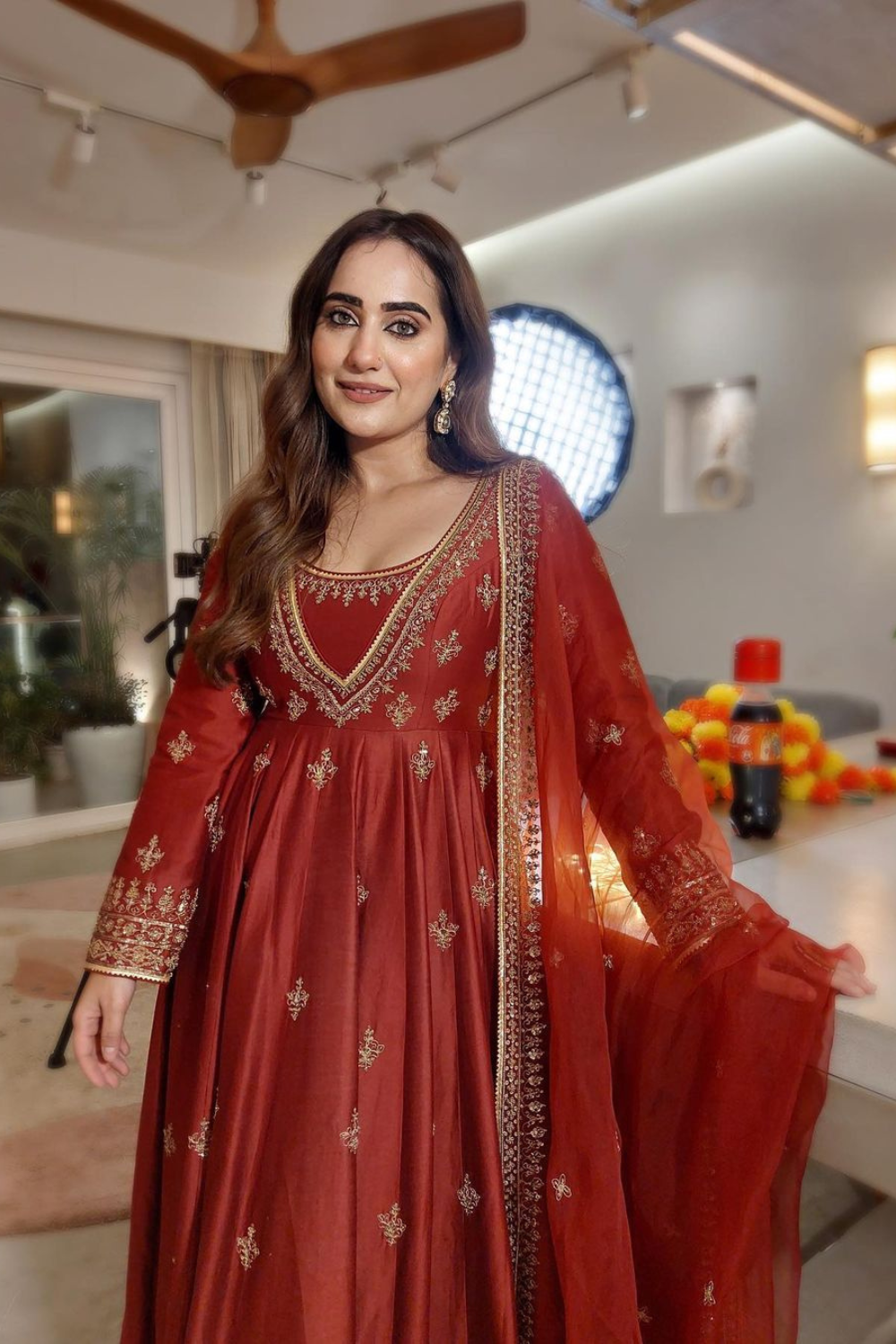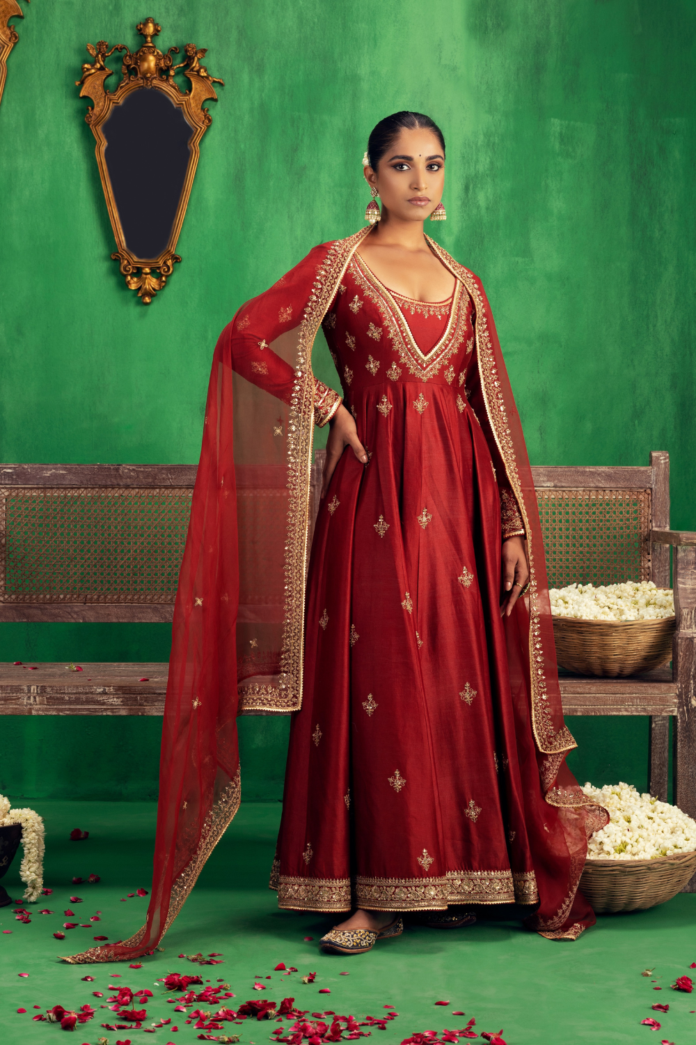 Featuring a red Chanderi Anarkali paired with a cotton silk churidar and an organza dupatta with gold dori and aari embroidery