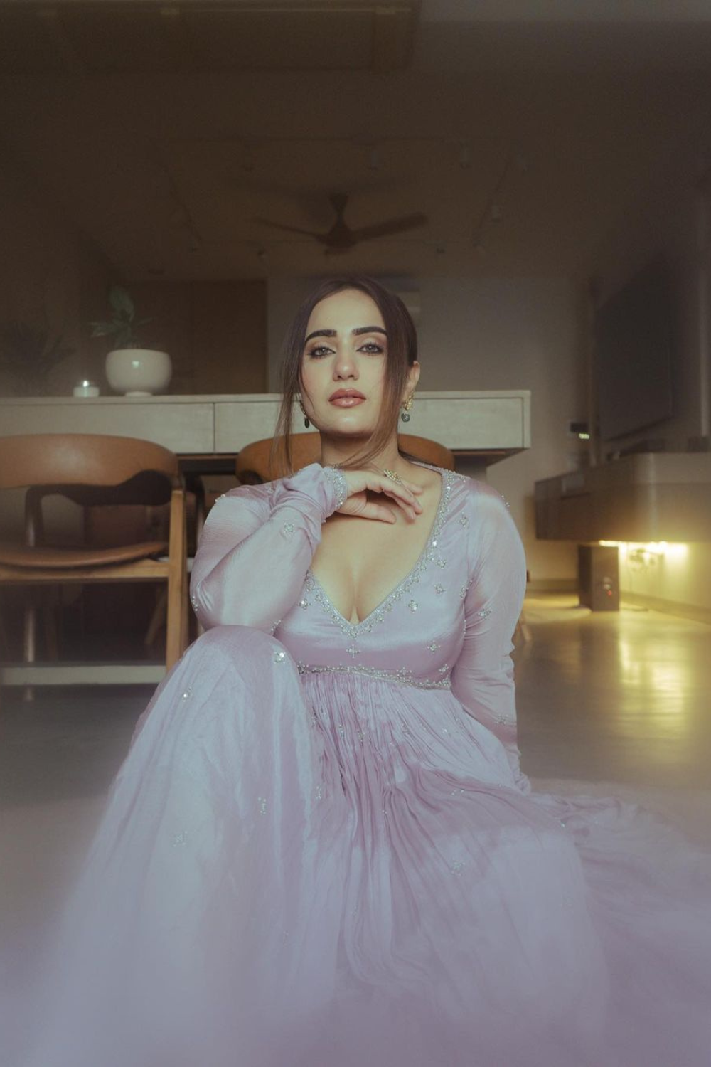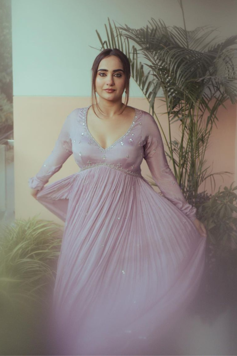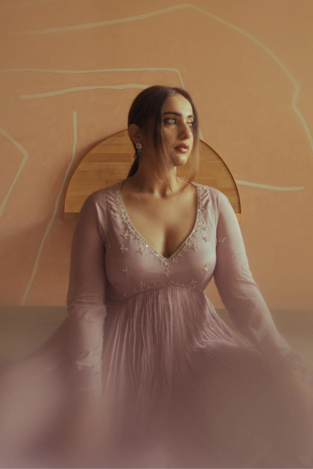 Featuring a Lavendar Chiffon Anarkali paired with a cotton silk churidar and an organza dupatta with tone-on-tone and aari embroidery