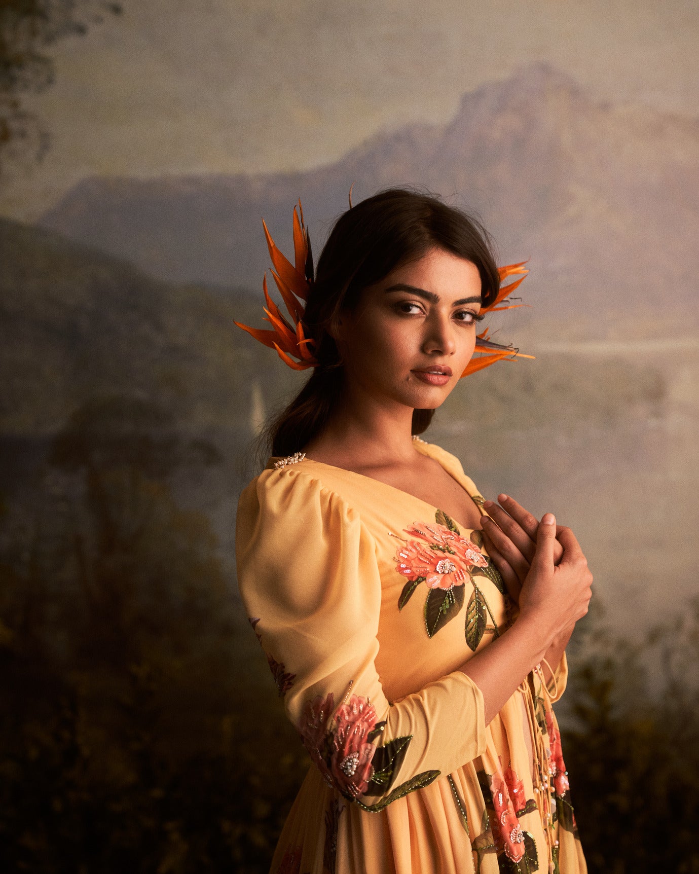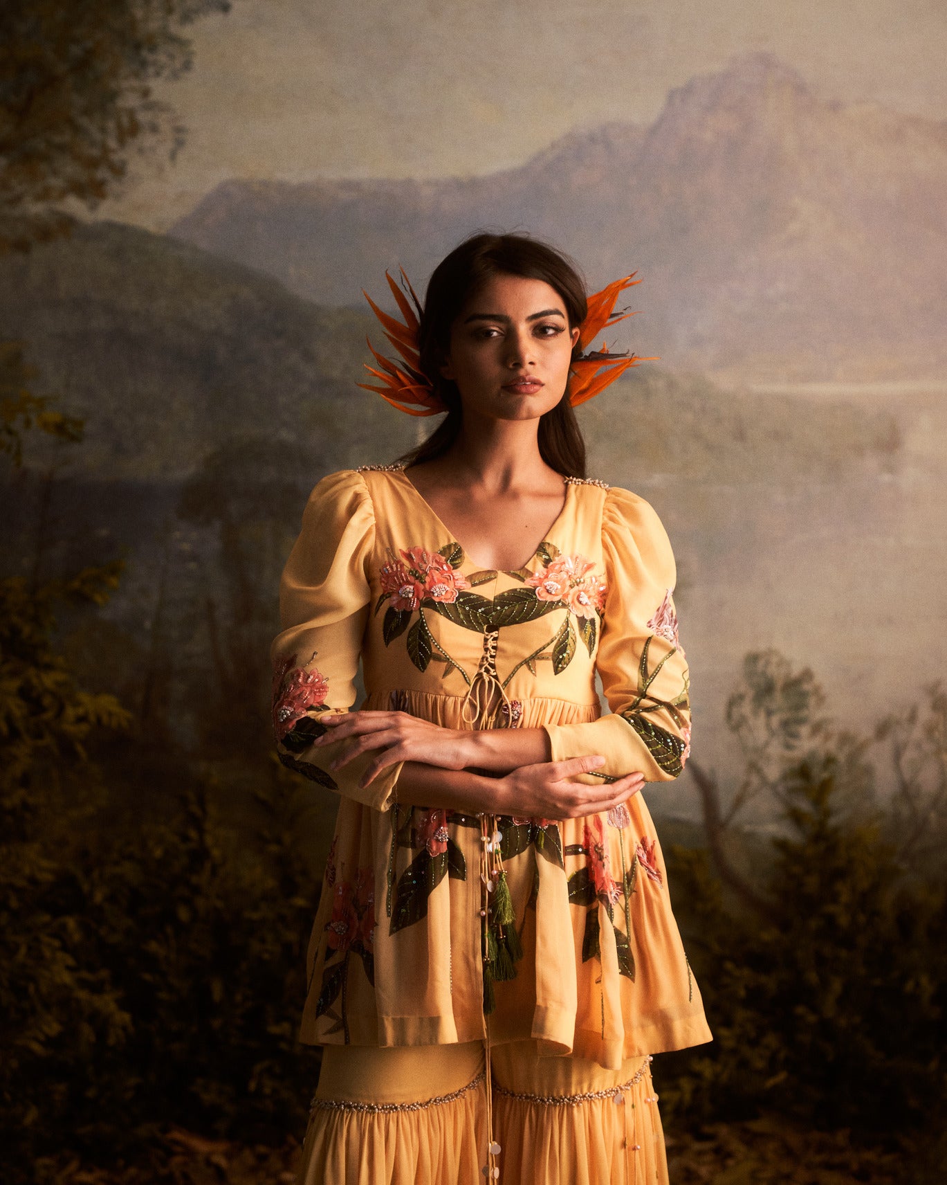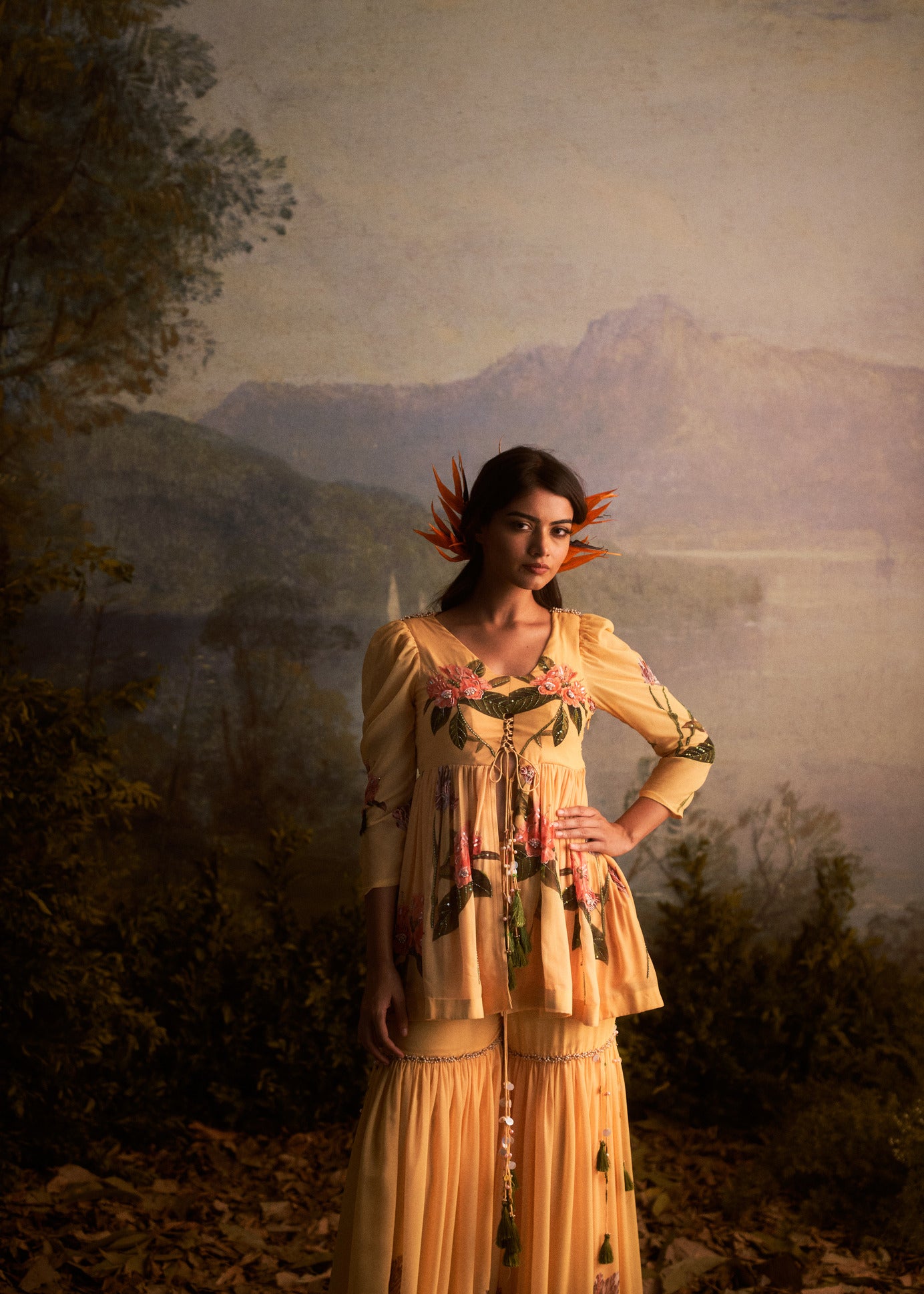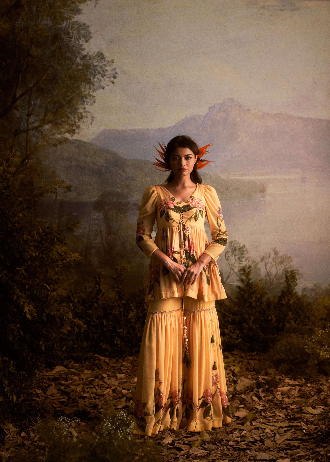 A champagne yellow floral sharara set is a charming and vibrant traditional outfit that consists of a matching top, flared pants (sharara), and a dupatta. The color yellow brings a joyful and sunny vibe, while the floral pattern adds a touch of femininity and grace. This ensemble is perfect for festive occasions, weddings, or celebrations, radiating a lively and stylish look that is sure to turn heads.