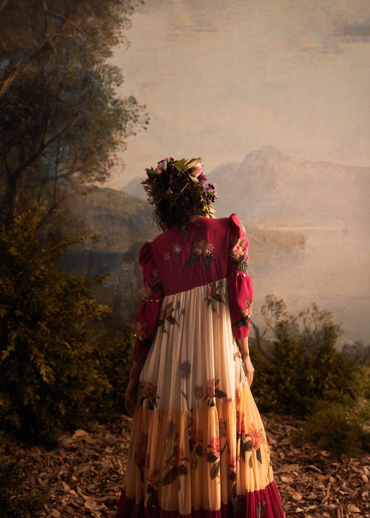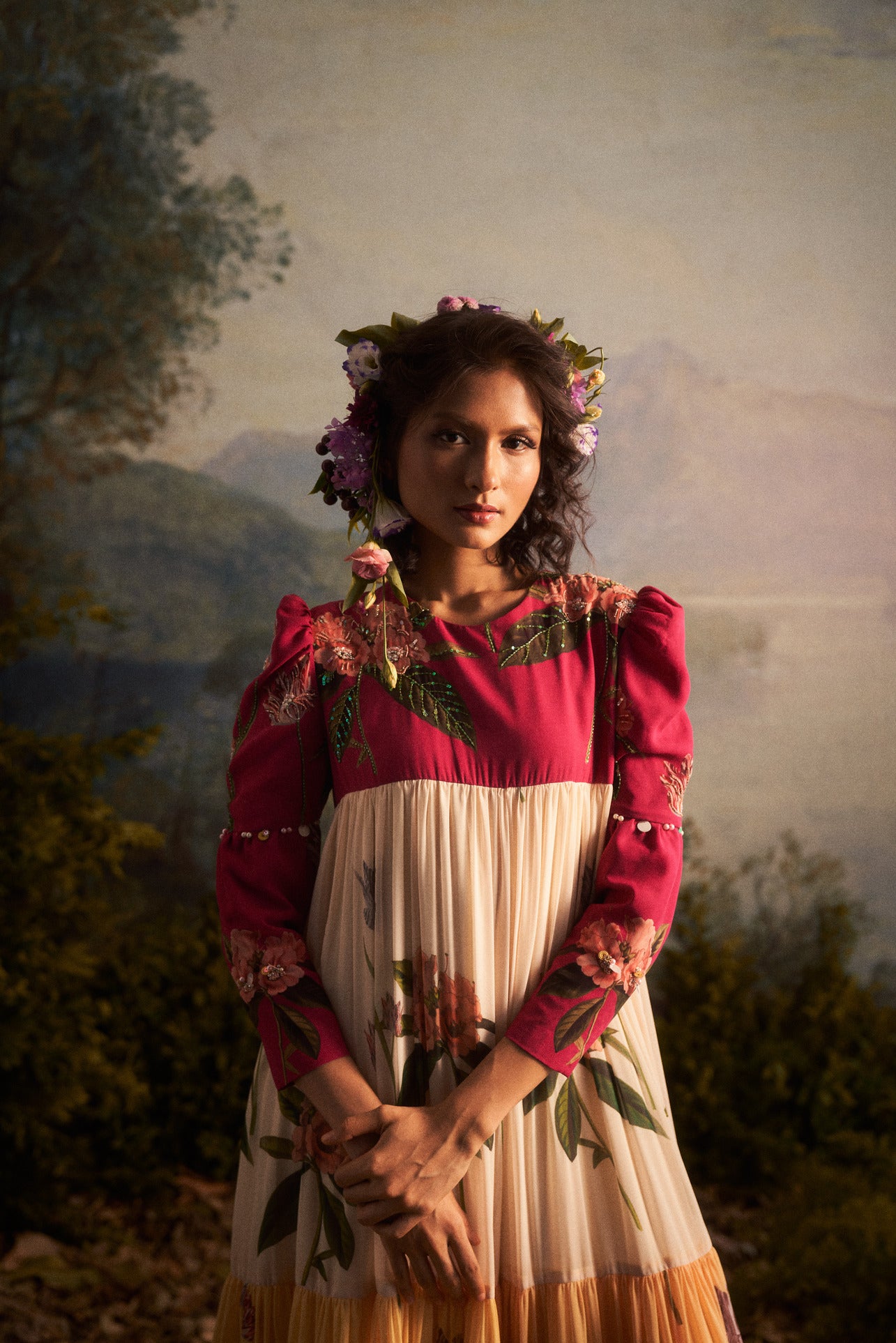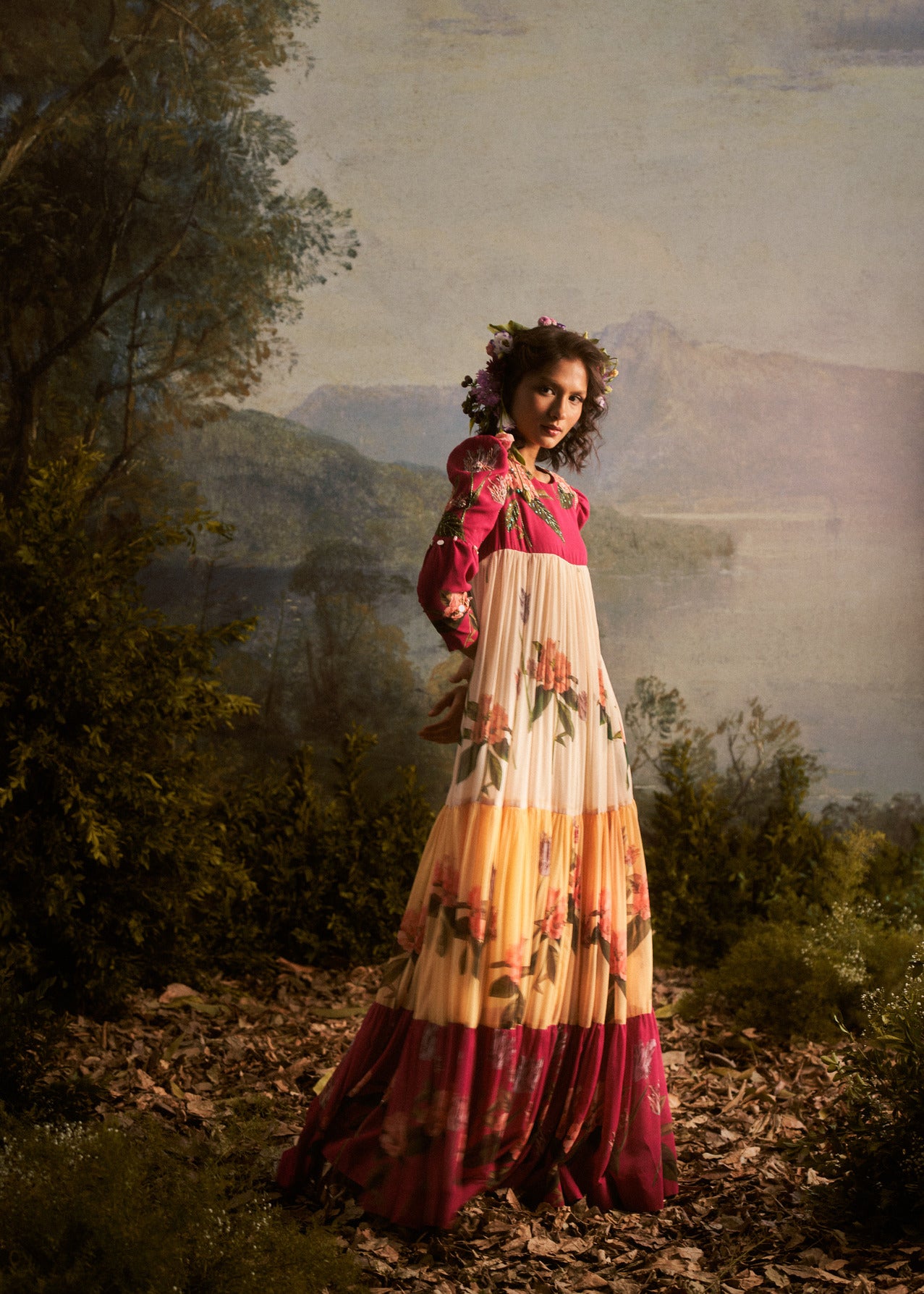 A floral multicolored long dress is a vibrant and lively garment that showcases a delightful array of colors and floral patterns. The dress features a flowing and flattering silhouette, usually reaching ankle length. The multicolored floral design adds a touch of playfulness and femininity, creating a cheerful and refreshing look. This dress is perfect for casual outings, garden parties, or summer events, exuding a carefree and bohemian vibe that effortlessly embraces the beauty of nature.