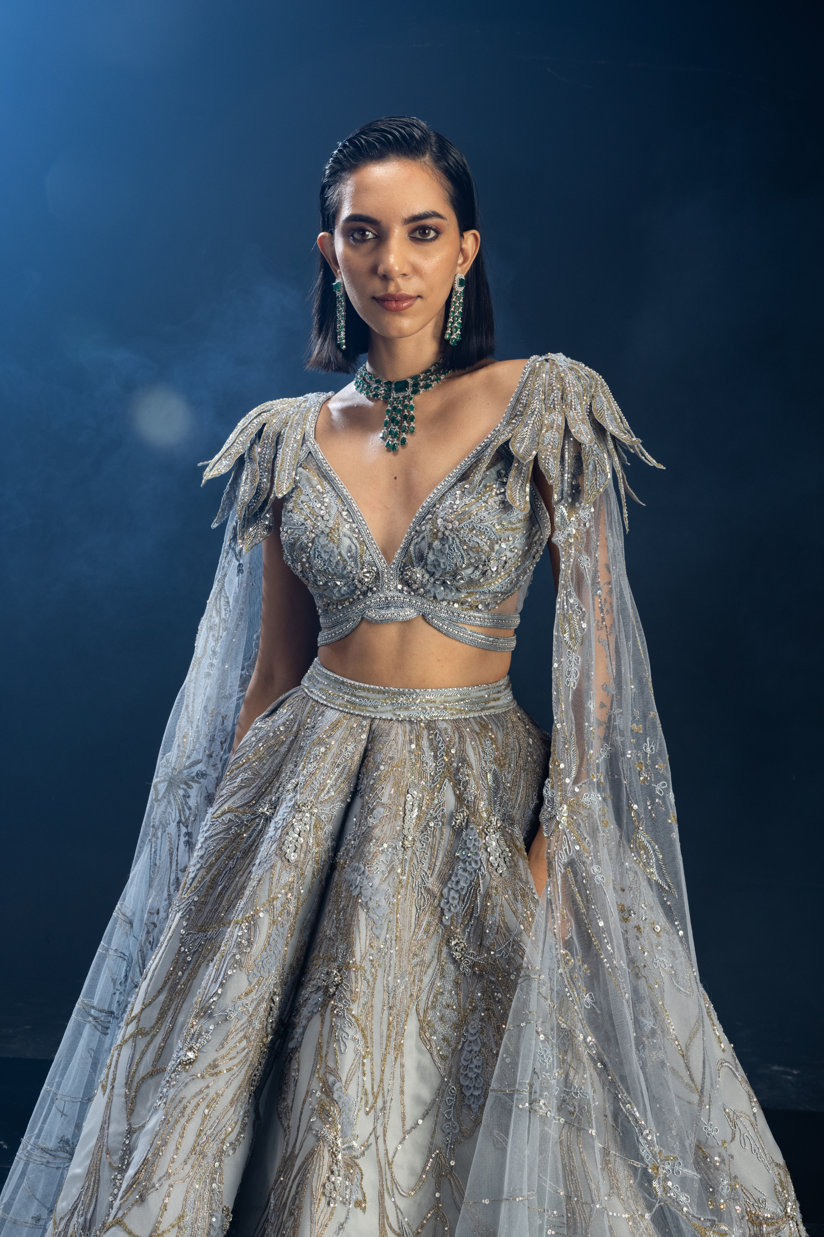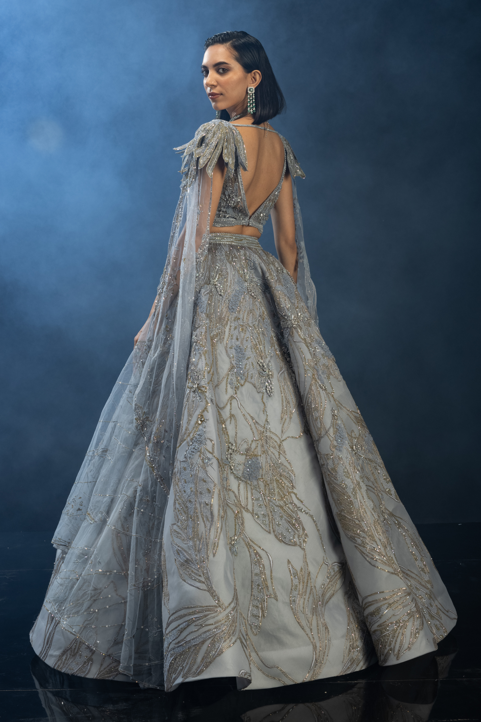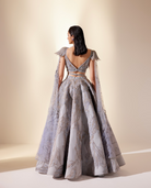Cloudart Top & Skirt has bejeweled corsages on shoulders and brimming dramatic drapes.