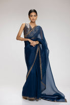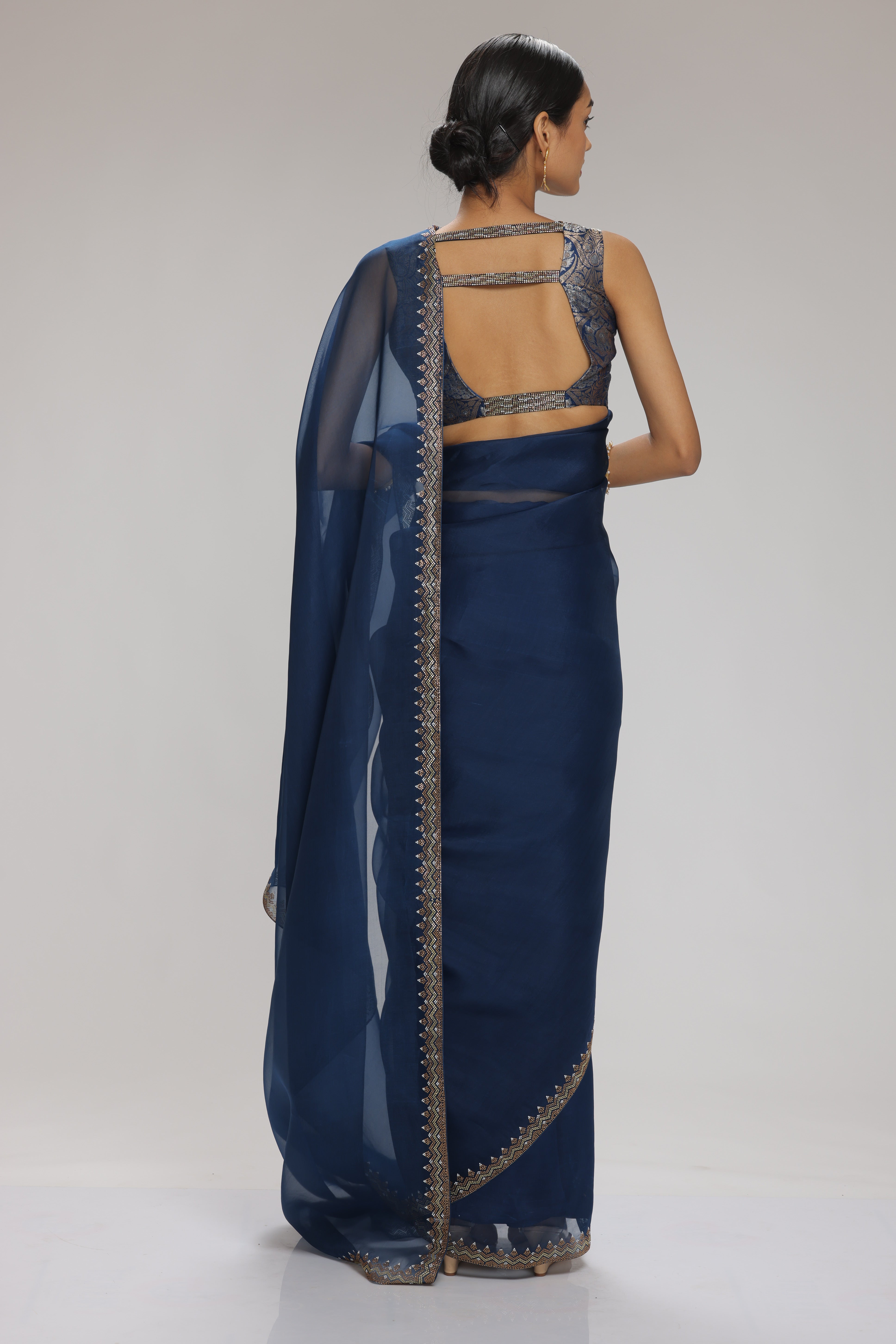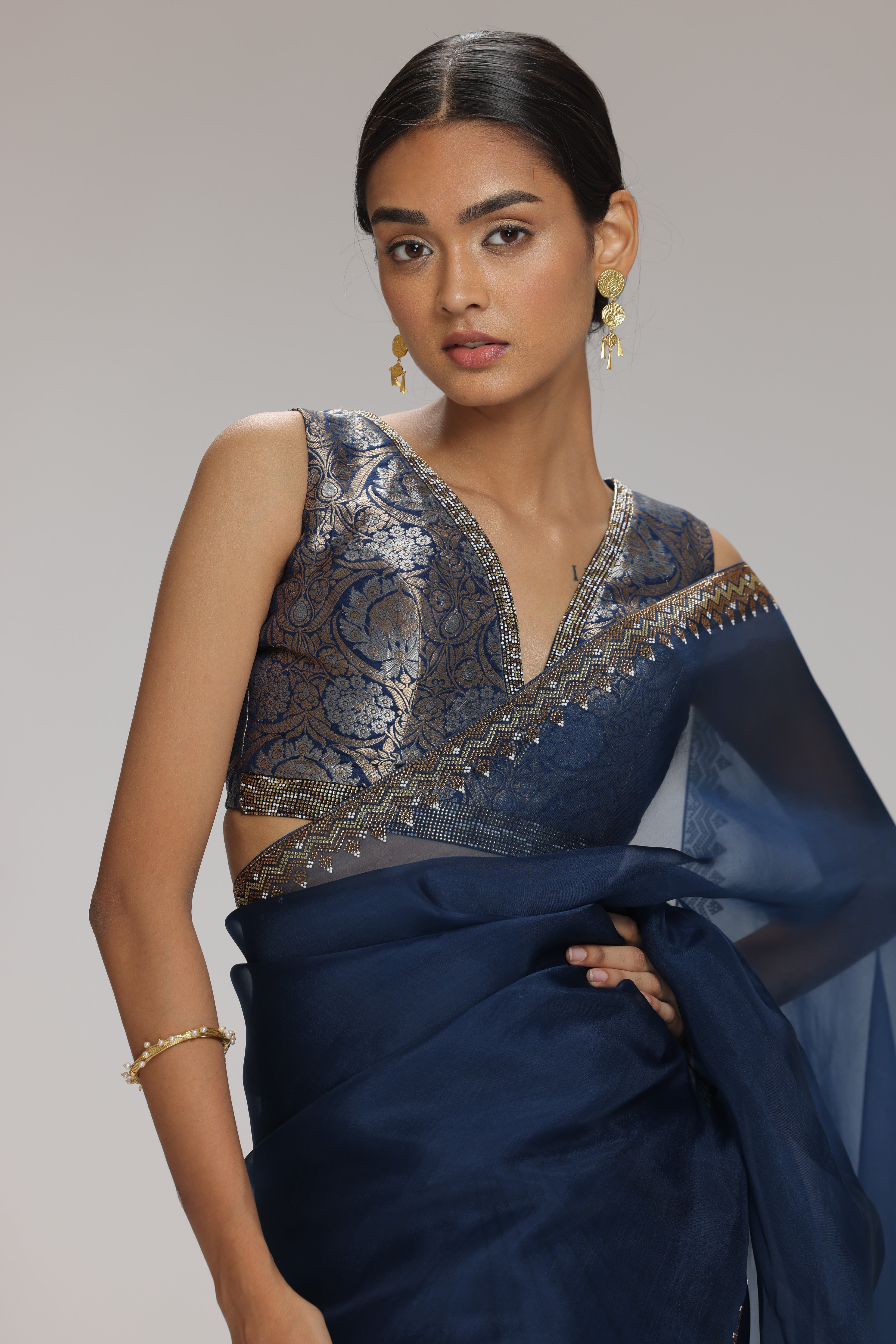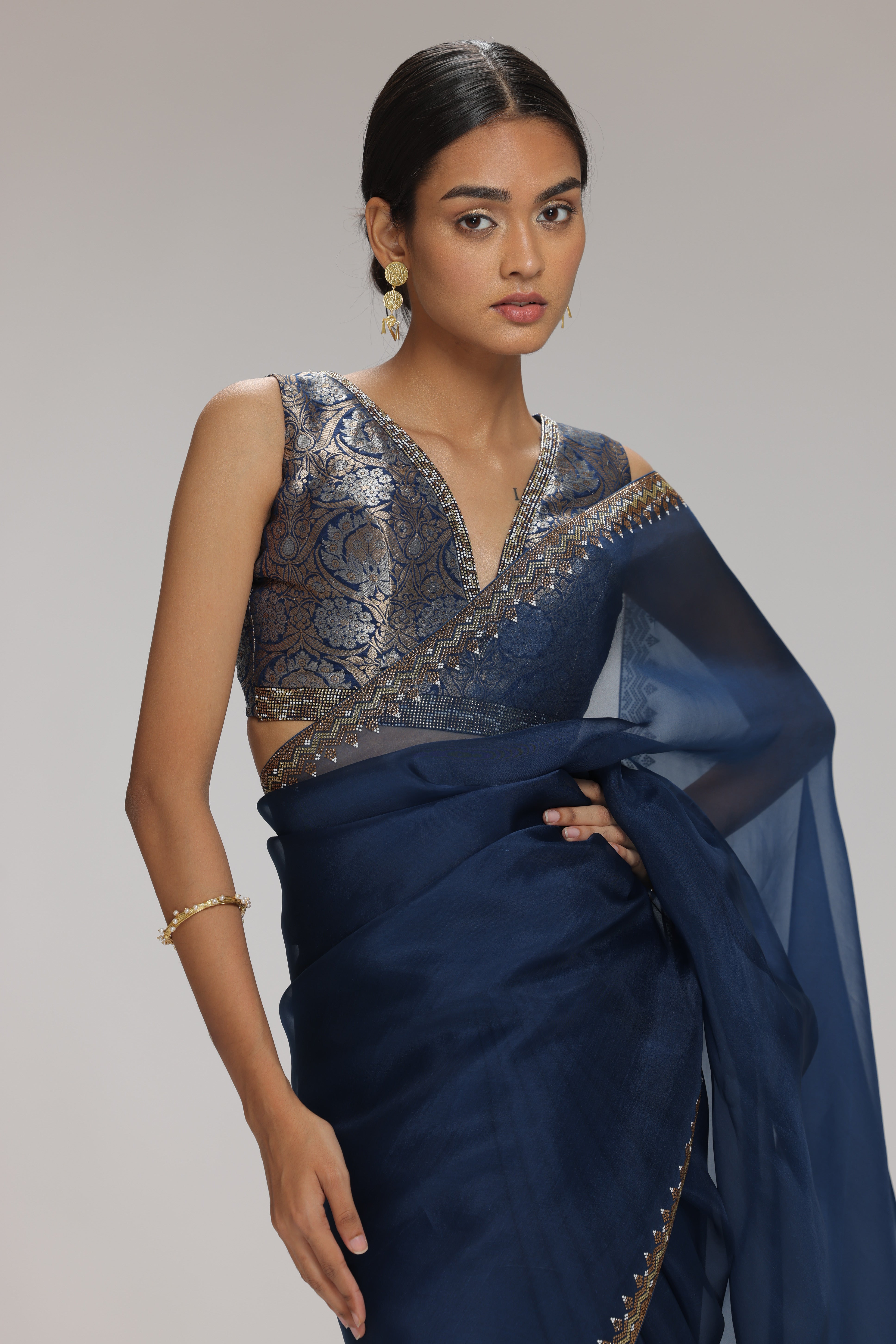 A navy blue organza saree, elegantly embellished with rhinestone accents along its hem. Complementing this is a sleeveless banarasi brocade blouse, adorned with shimmering rhinestones. The ensemble creates a harmonious balance of textures and embellishments for a touch of elegance.