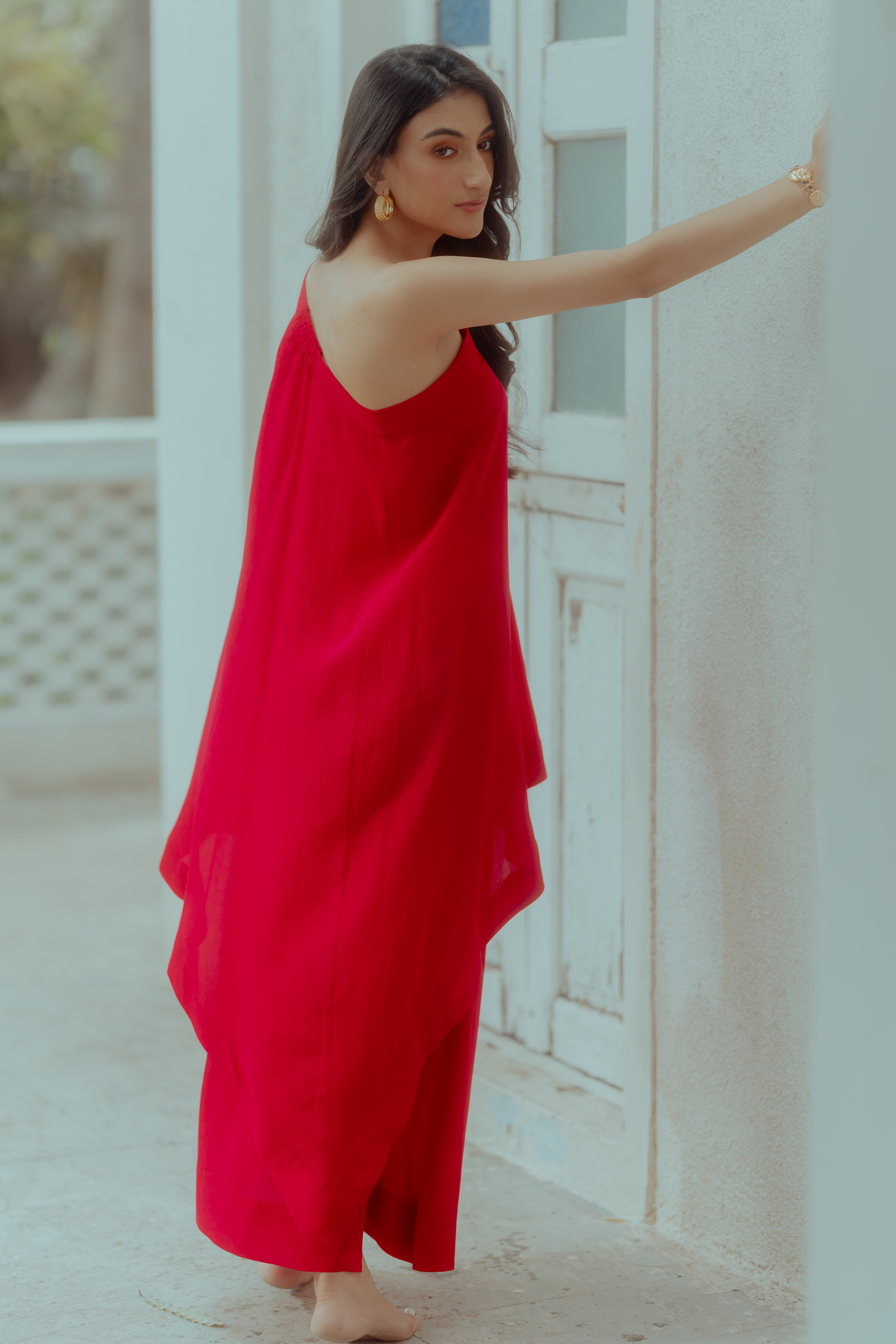 A rani pink one shoulder top and drape skirt. The skirt has a bow detailing on the side. An extremely easy to wear ensemble.