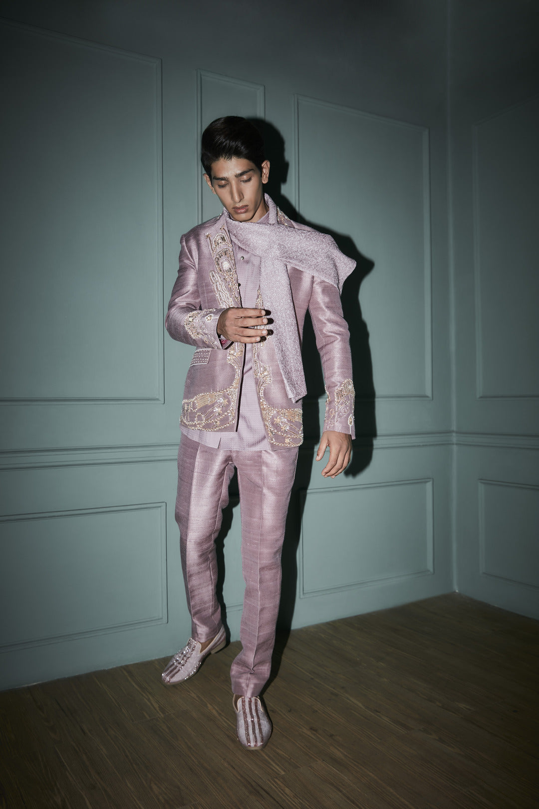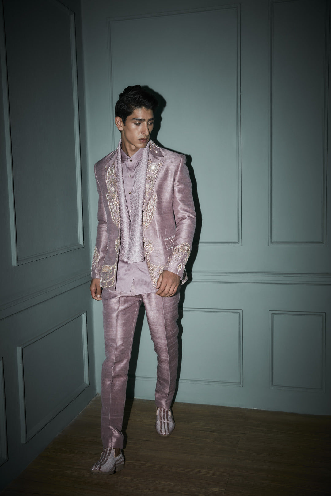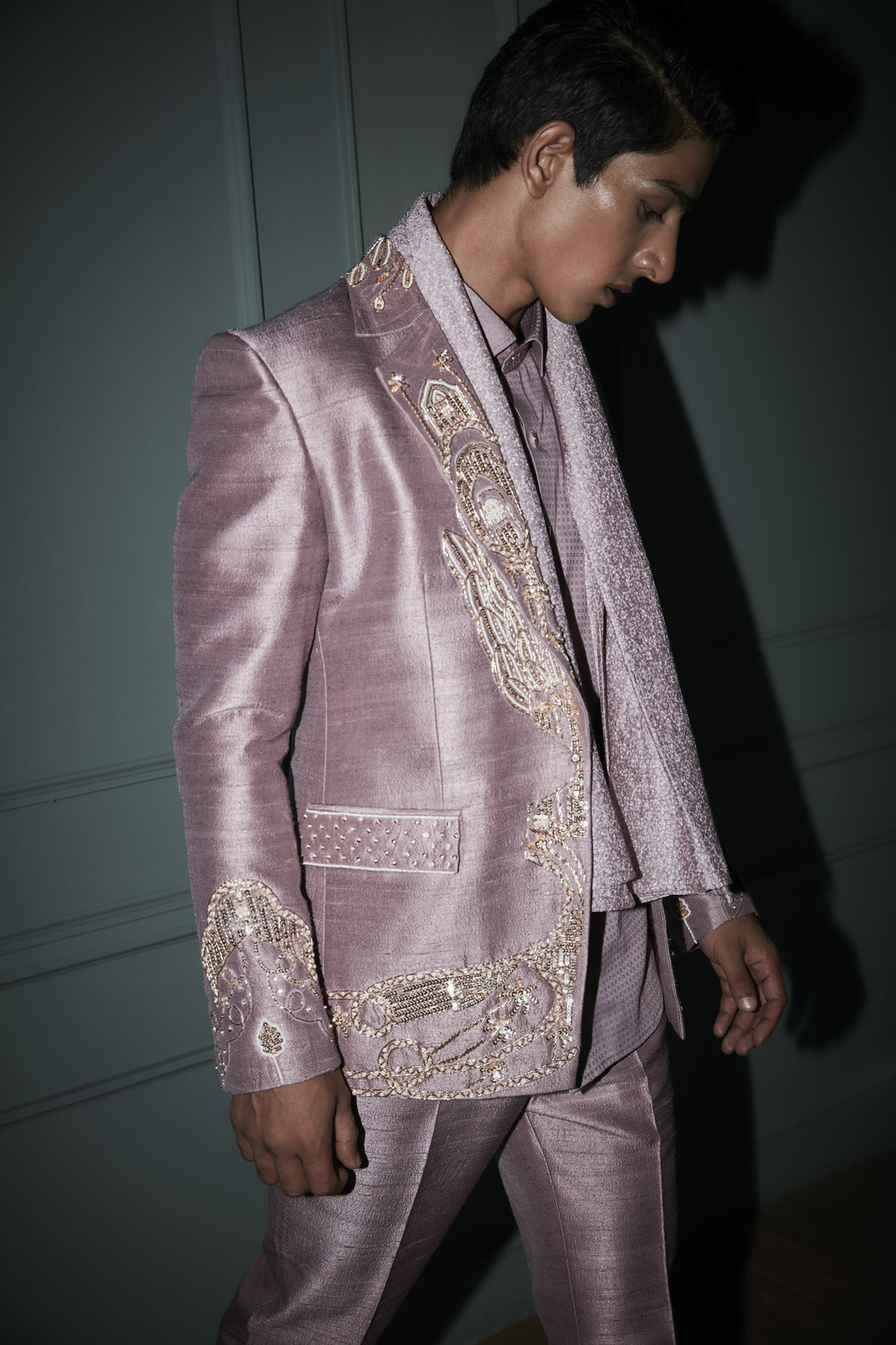 Embroidered jacket set, the outfit is fabricated in raw silk. The jacket comes zardosi emboidered on lapel and collar. The jacket paired with matching trouser pants and shirt.