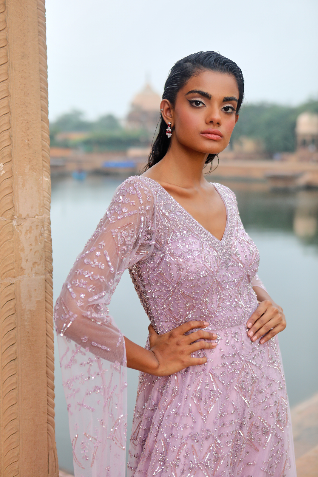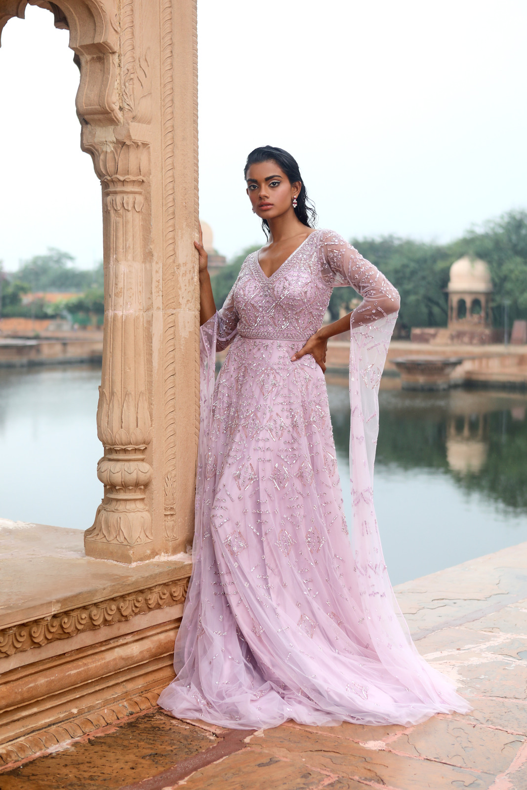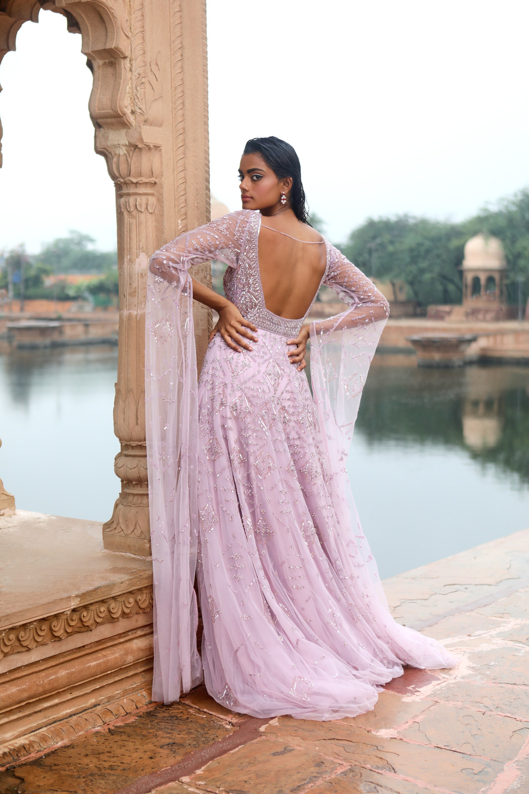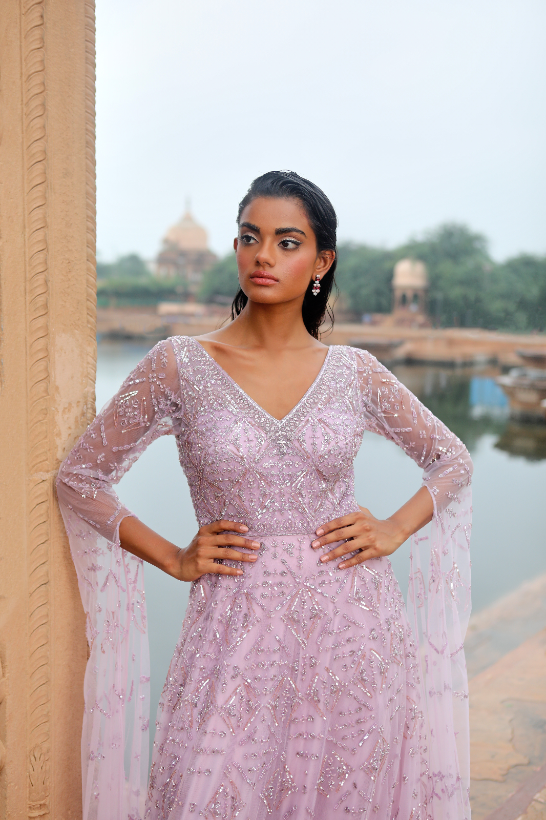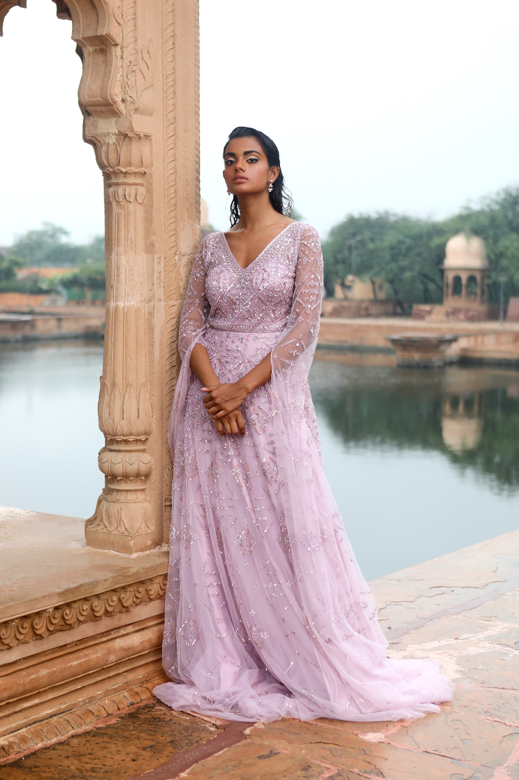 Featuring a lavender sequinned embellished gown with long cape sleeves